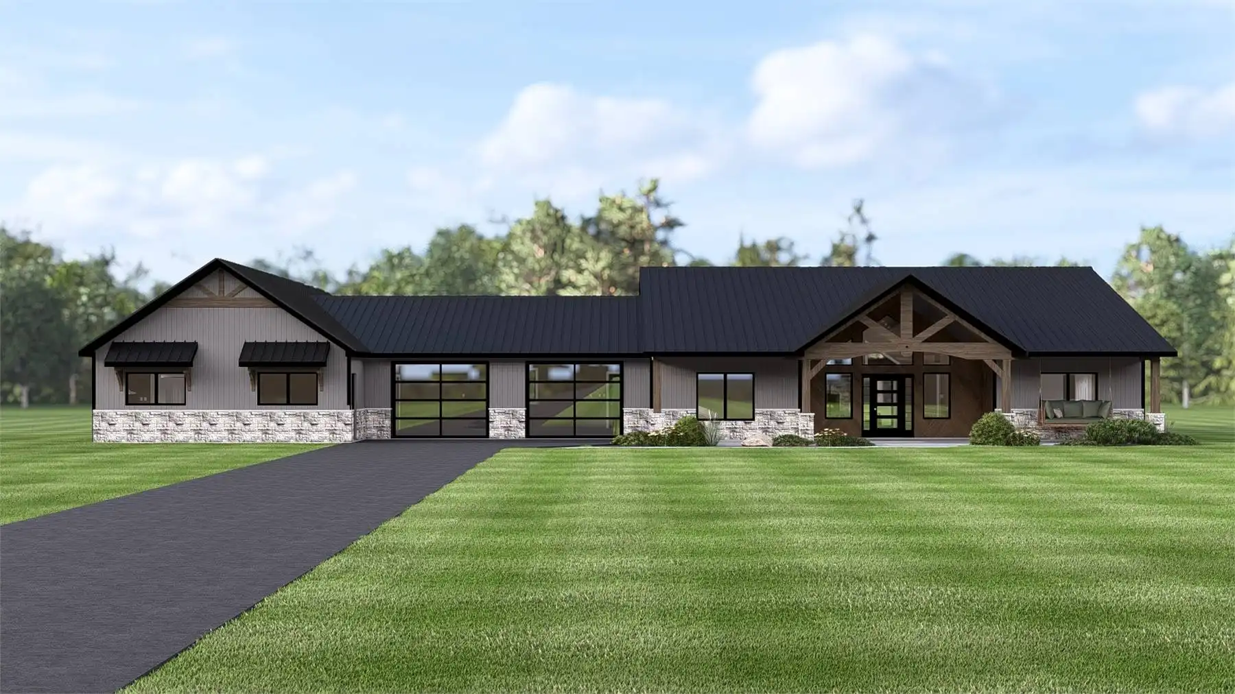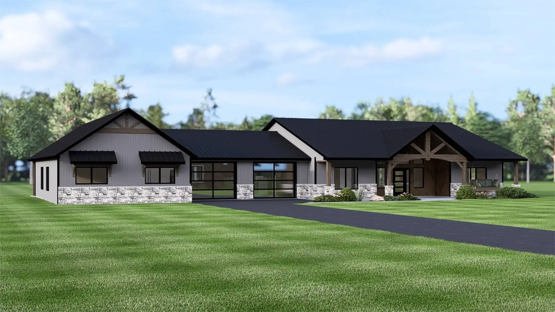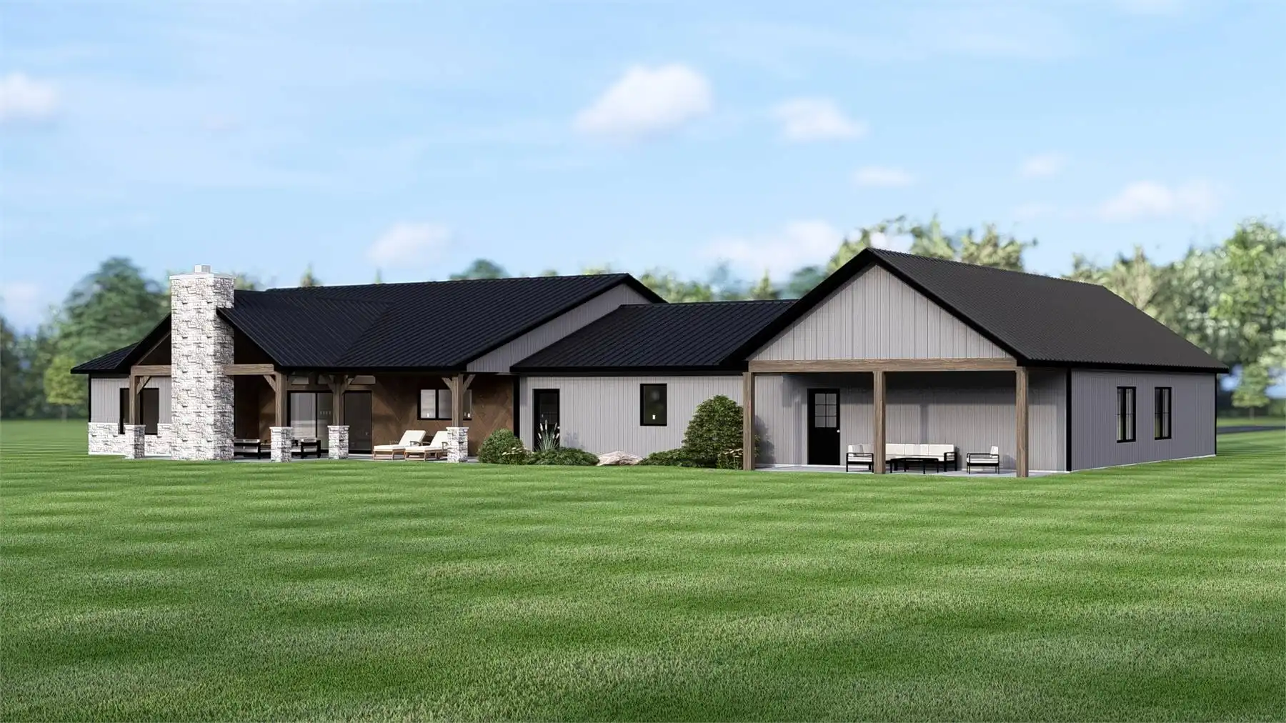 House Plan 11170 is a modern barndominium designed for families who value both space and flexibility. The main residence includes three spacious bedrooms, highlighted by a primary suite with a walk-in closet and private bath on the left side of the garage. The open floor plan brings the great room, kitchen, and dining area together under vaulted ceilings, with direct access to a covered porch. On the opposite side of the garage, a fully self-contained 1-bedroom apartment provides independent living space, complete with a kitchen, dining, living area, ensuite bath, laundry, and its own covered porch. This unique layout makes the plan ideal for in-law living, extended family, or generating rental income. The large attached garage offers workshop and storage space, while the covered porches invite outdoor relaxation. Blending barn-inspired architecture with modern features, this design is built for today’s flexible lifestyles.