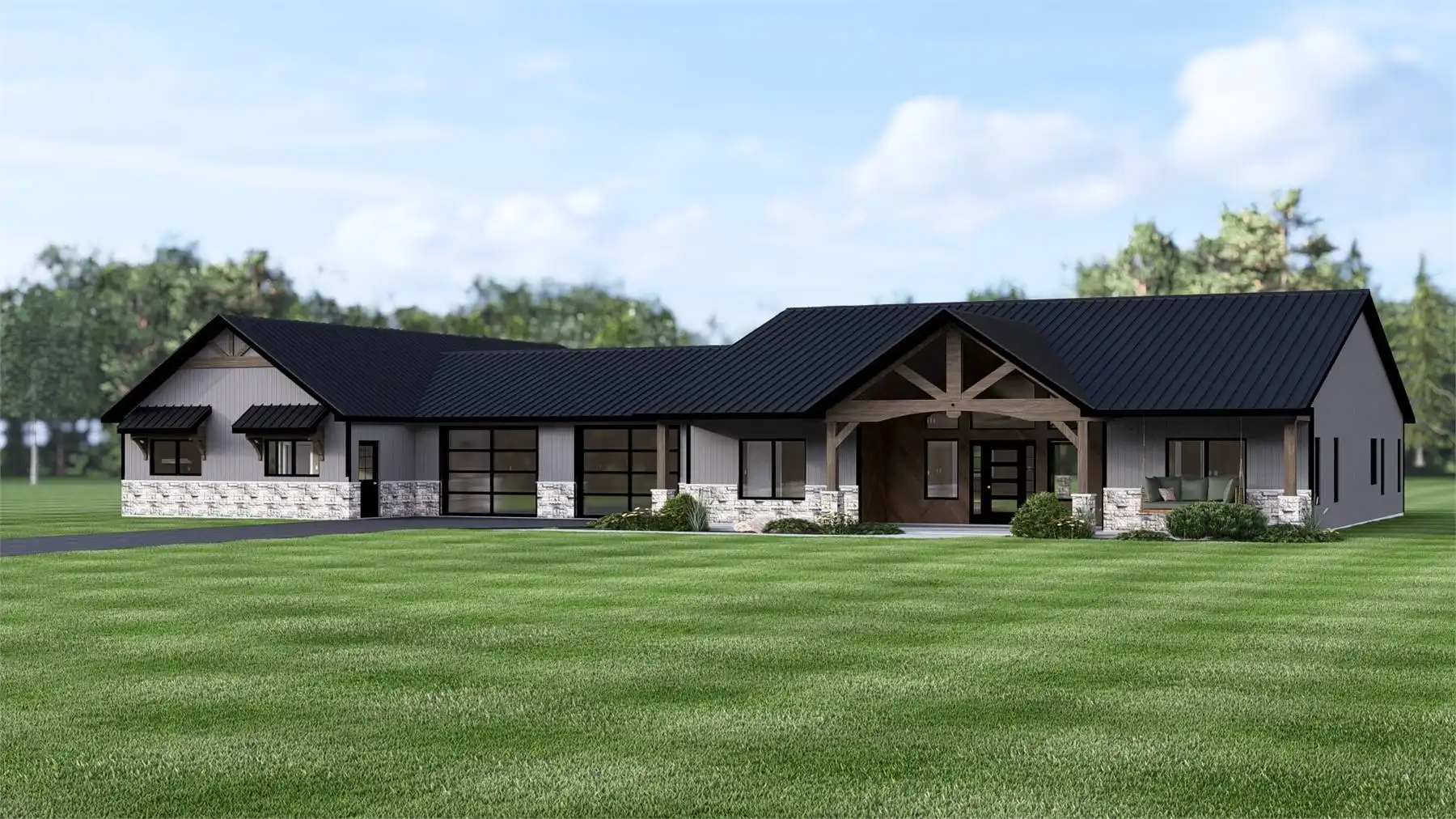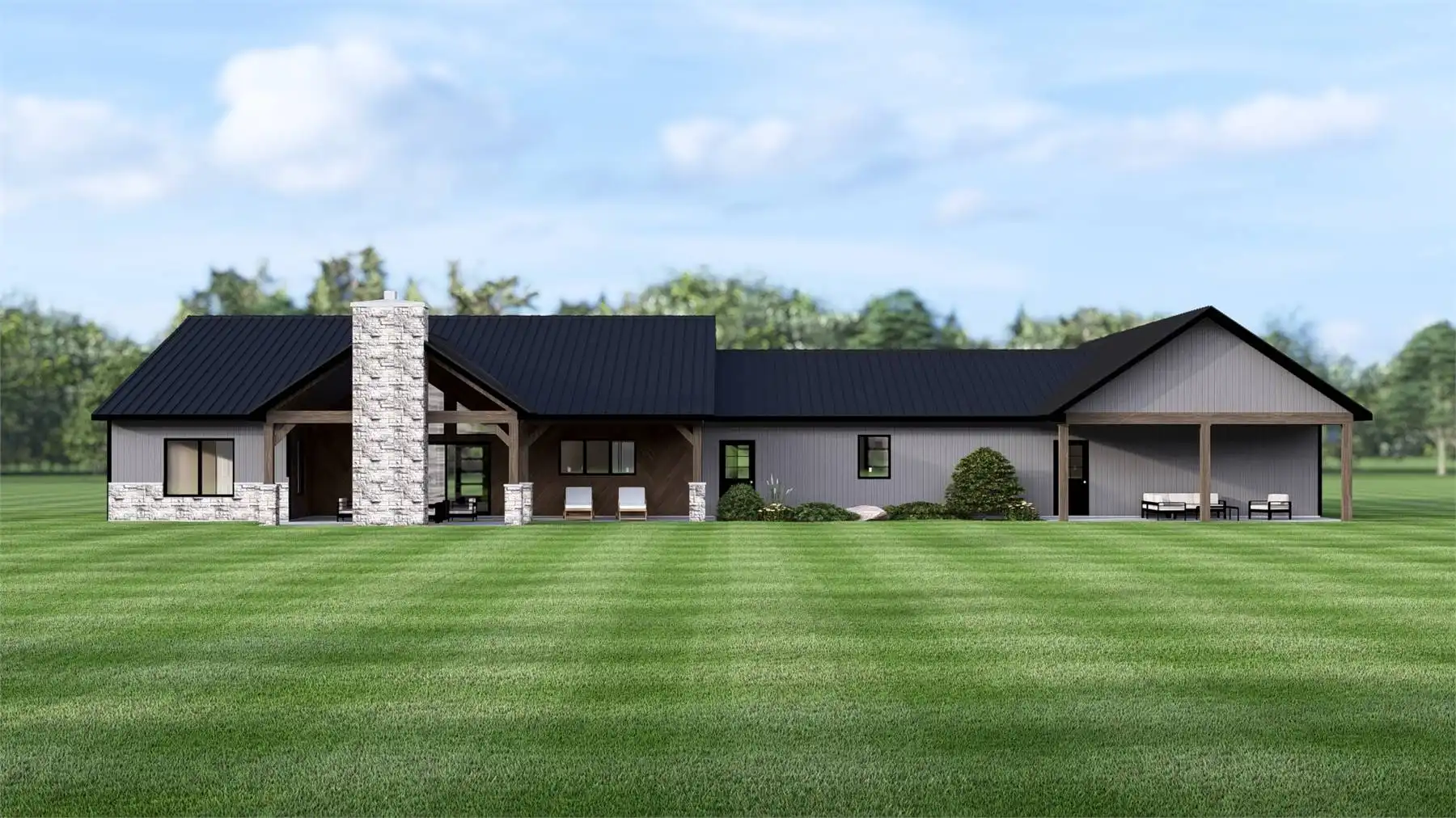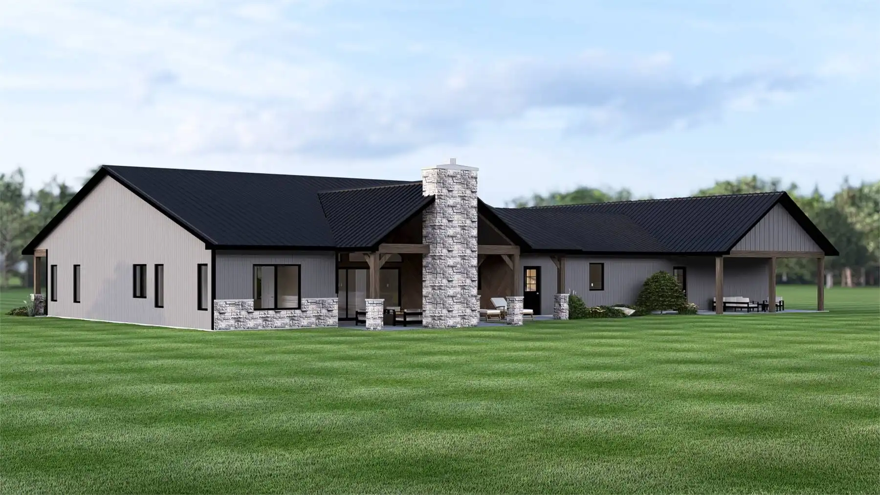 House Plan 11170 is a modern barndominium designed for families who value both space and flexibility. The main residence includes three spacious bedrooms, highlighted by a primary suite with a walk-in closet and private bath on the left side of the garage. The open floor plan brings the great room, kitchen, and dining area together under vaulted ceilings, with direct access to a covered porch. On the opposite side of the garage, a fully self-contained 1-bedroom apartment provides independent living space, complete with a kitchen, dining, living area, ensuite bath, laundry, and its own covered porch. This unique layout makes the plan ideal for in-law living, extended family, or generating rental income. The large attached garage offers workshop and storage space, while the covered porches invite outdoor relaxation. Blending barn-inspired architecture with modern features, this design is built for today’s flexible lifestyles.