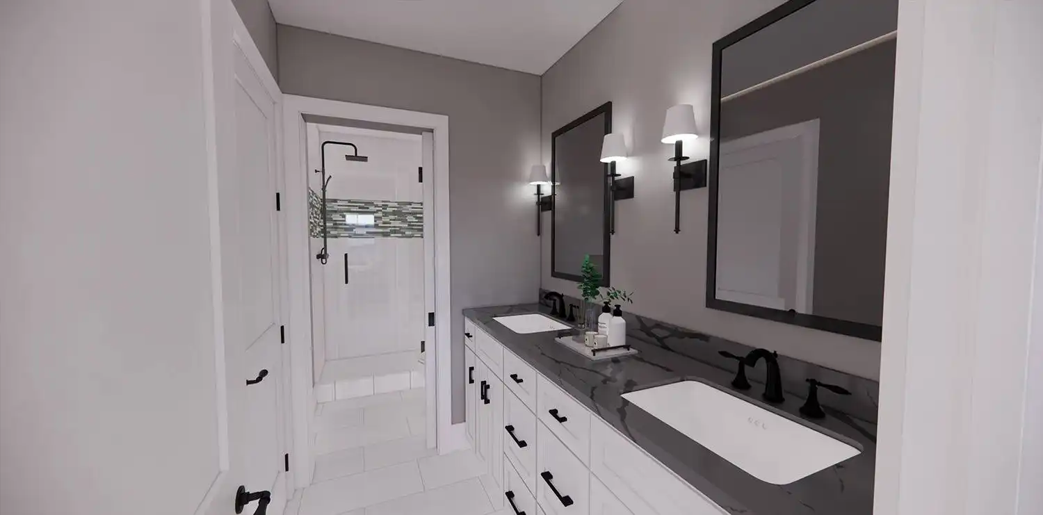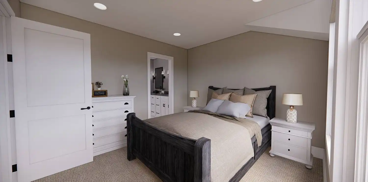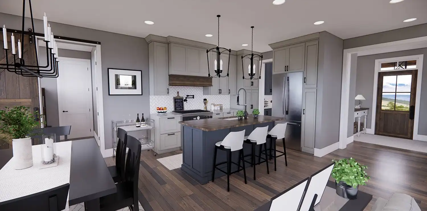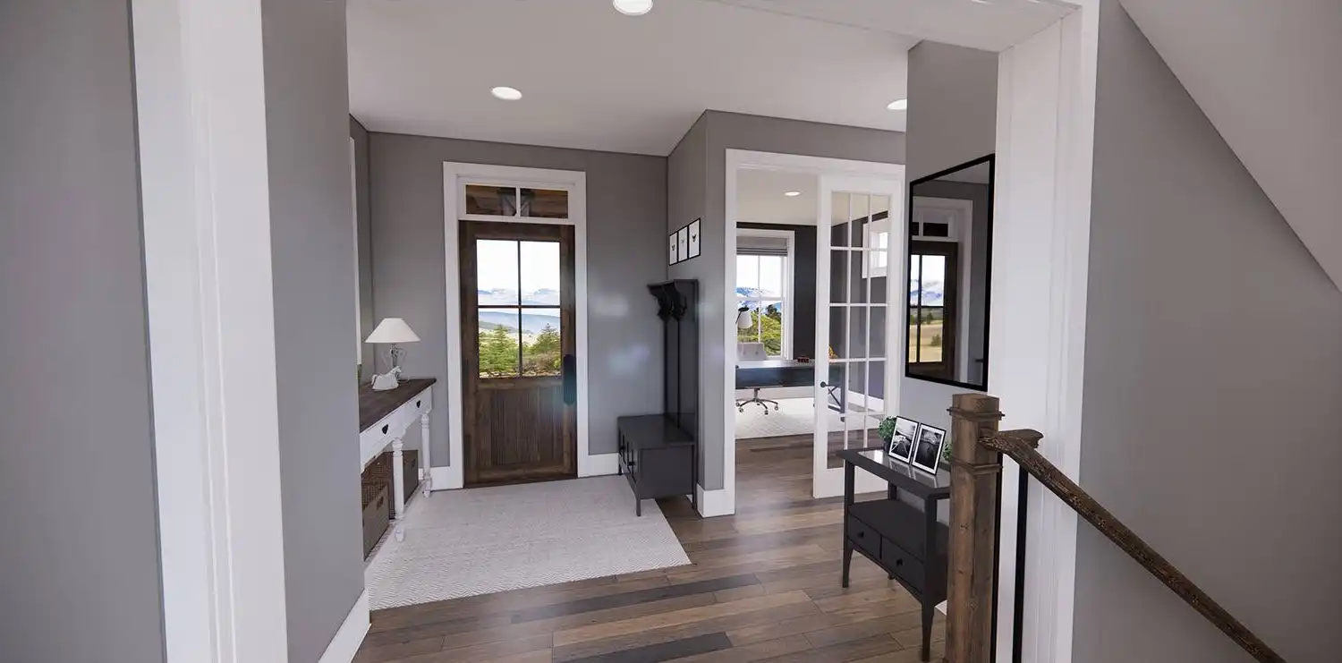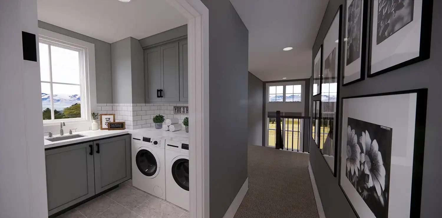 House Plan 11174 is a wonderful 2-story farmhouse with 2,317 square feet of versatile living space, ideal for growing families. Offering 4 bedrooms, 3.5 bathrooms, and a 2-car garage, this home is designed with comfort and practicality in mind. The main level features a bright open floor plan where the kitchen, dining, and great room come together around a warm fireplace and central island with seating. A spacious corner office and mudroom add convenience for work and busy family life. Upstairs, the primary suite includes a luxurious bathroom with his-and-hers vanities, a walk-in shower, and a large closet with built-ins. Three secondary bedrooms, each with generous storage, share two full bathrooms, including a Jack-and-Jill design. A dedicated laundry room ensures efficiency on the upper floor. With timeless curb appeal and a thoughtful layout, this farmhouse balances style and function in every detail