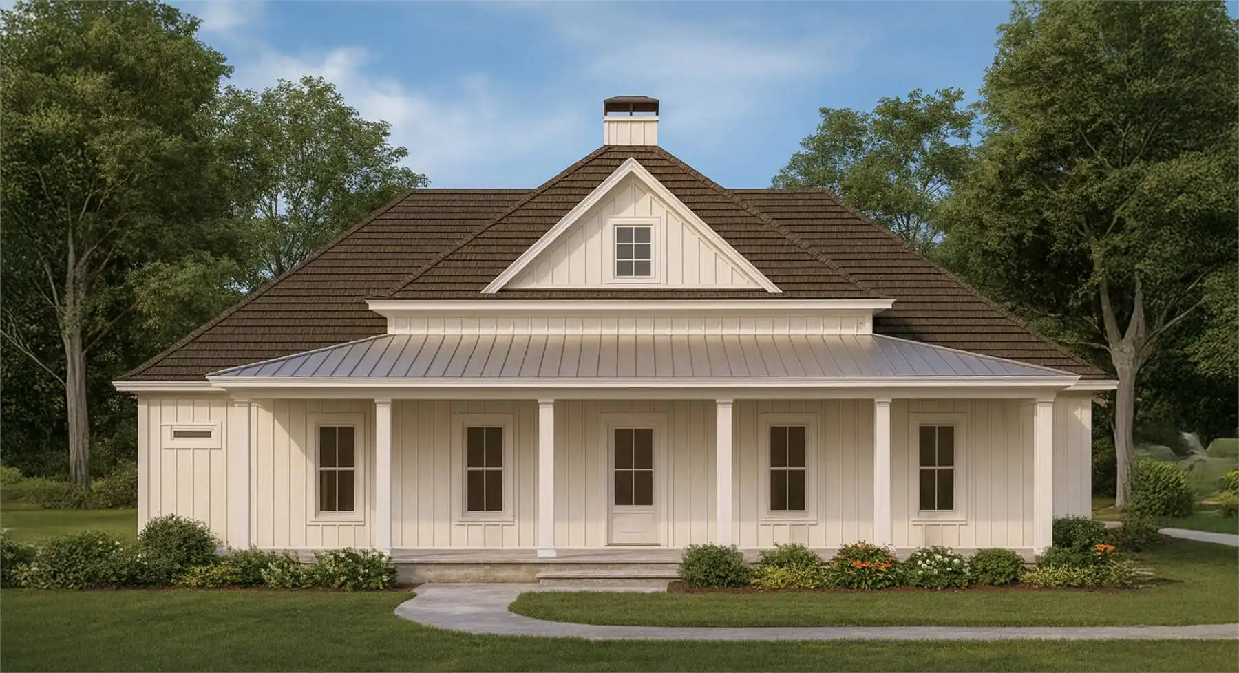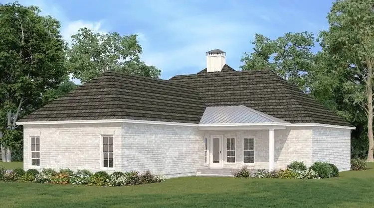Plan 11180 delivers a beautifully balanced single-level layout with 1,710 square feet, three bedrooms, and two-and-a-half baths. A welcoming front porch leads into a bright living room with fireplace, which connects seamlessly to the L-shaped kitchen with island seating and a dining area opening to the rear covered patio and outdoor living area. Two bedrooms share a Jack-and-Jill bath on one side of the house, while the owner’s suite enjoys a private retreat with a large ensuite and walk-in closet. A home office and rear two-car garage complete this thoughtful Southern-inspired design.