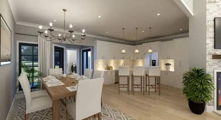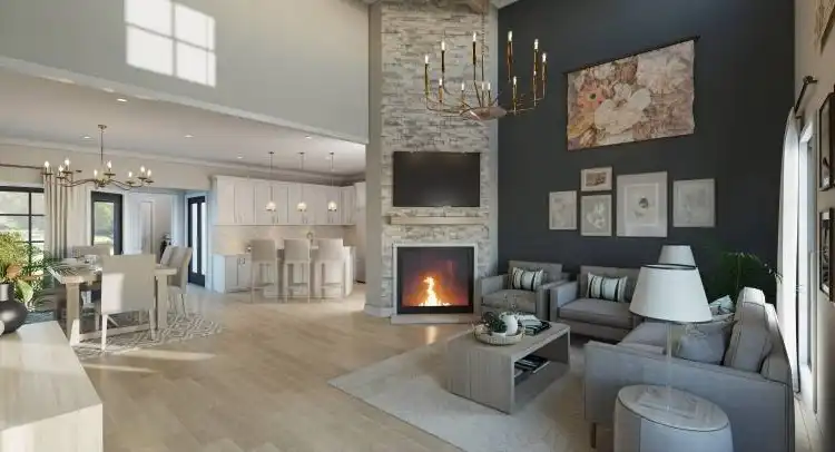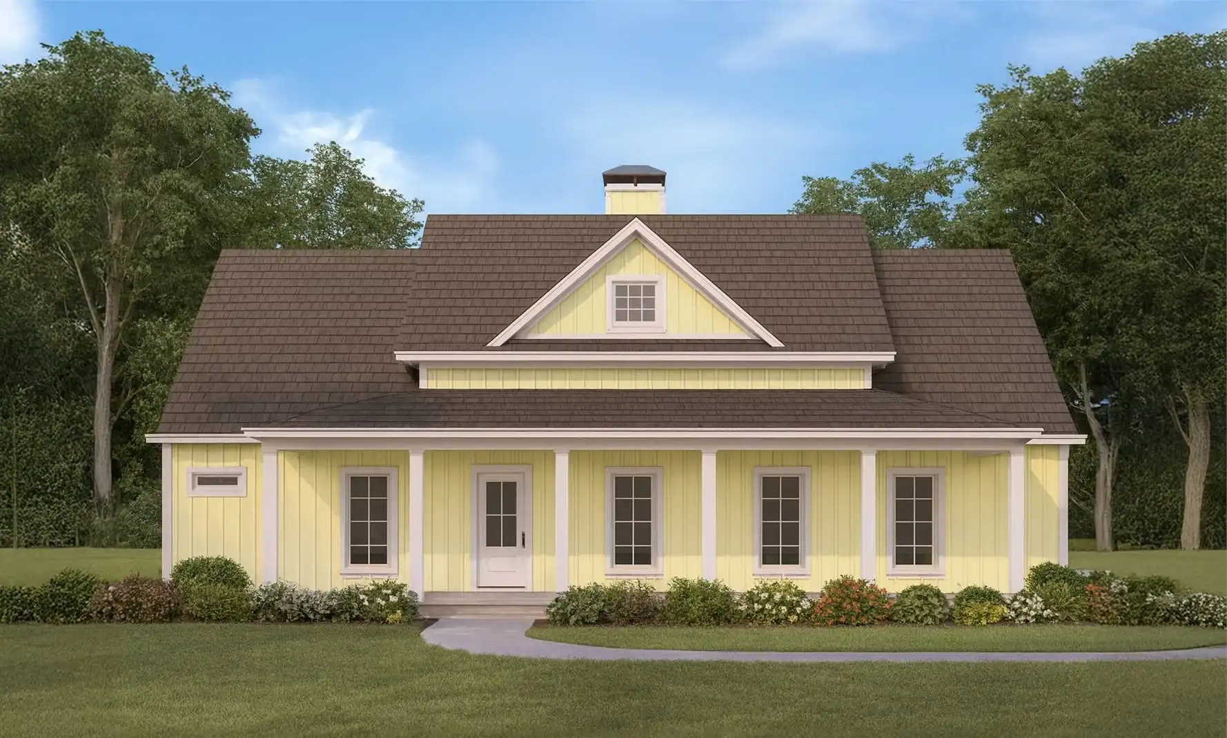 Plan 11181 delivers classic Southern-inspired style in a single-level layout spanning 1,710 square feet with three bedrooms and two-and-a-half bathrooms. From the inviting front porch, the home opens into a bright living room with fireplace, which connects seamlessly to the L-shaped kitchen and dining area with access to the rear covered patio and outdoor living area. The right side of the plan includes two bedrooms with a Jack-and-Jill bath, while the left side is dedicated to the owner’s suite with a spacious ensuite and walk-in closet. A private office and convenient rear two-car garage complete this practical and welcoming design.