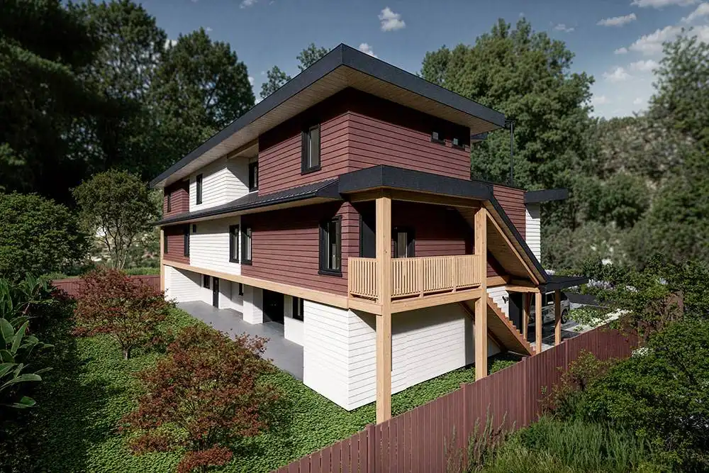 House Plan 11189 is a gorgeous modern triplex for a view lot! It offers 4,281 square feet, nine bedrooms, six full bathrooms, and three half baths in total, with each unit offering three bedrooms and two-and-a-half baths. The two-story layout also sits atop the drive-under garage level to boost the interior spaces! Each unit places parking for two on the bottom, a main level with open living and the primary suite in the middle, and a pair of Jack-and-Jill bedrooms with a study loft and the laundry on the top floor. Make sure not to miss the deck space on two stories or the handy garage storage!