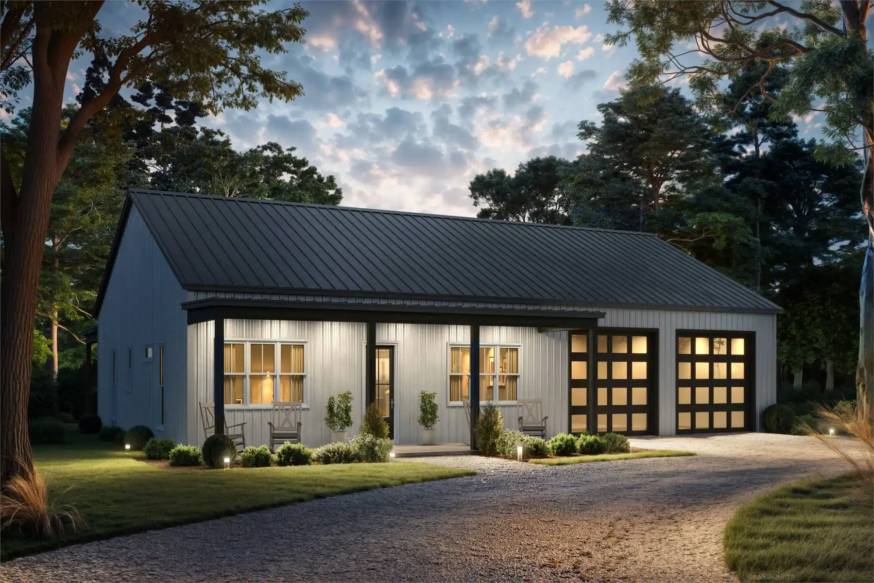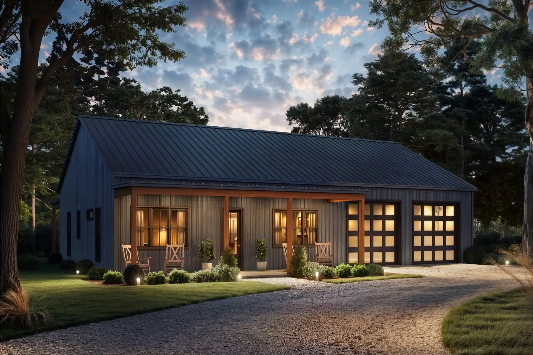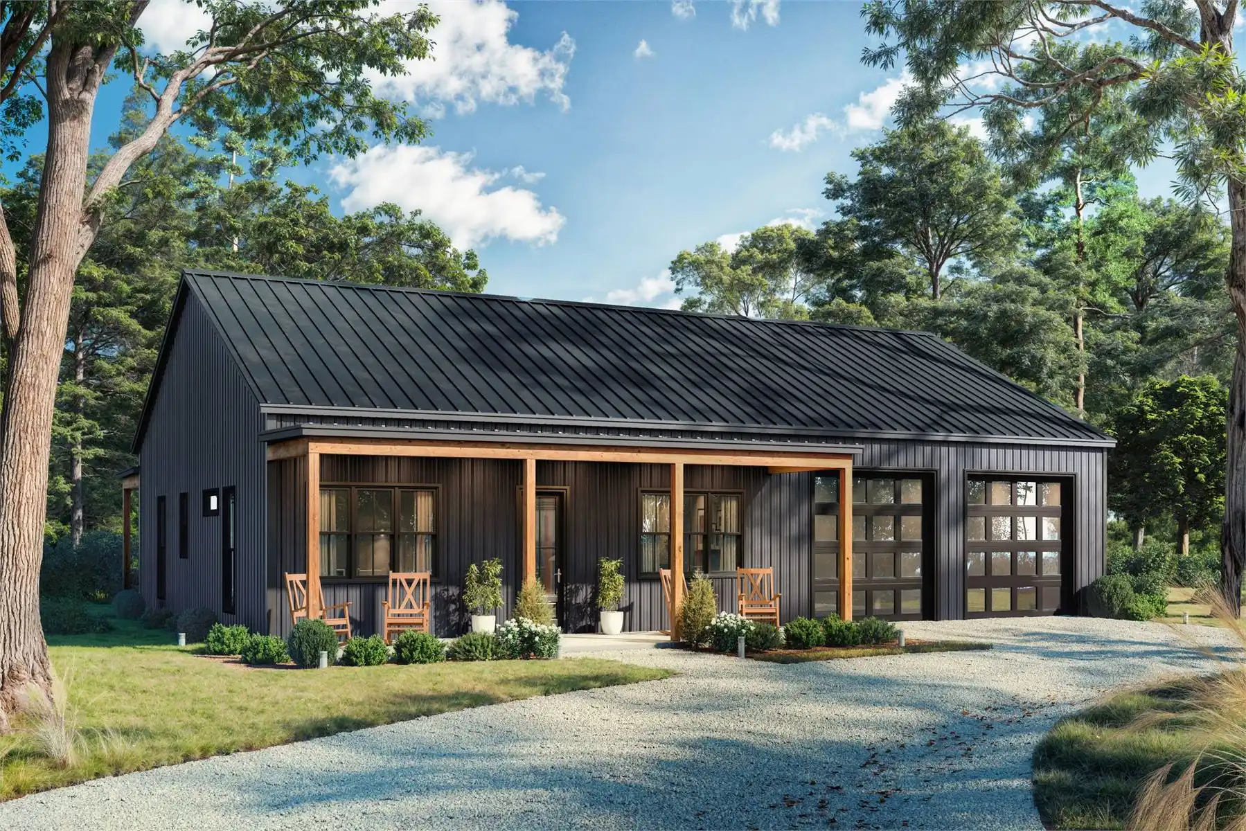 Blending rustic charm with modern amenities, this barndominium is designed for comfortable daily living as well as entertaining. Inside, you’ll find 2 bedrooms and 2 full baths, along with a generous garage and a well-placed laundry room. The central living, dining, and kitchen area boasts 12-foot ceilings, an inviting electric fireplace, and expansive windows that lead to wide front and rear porches. A central island anchors the kitchen, providing extra space for meals and conversation. The primary bedroom includes a walk-in closet and an en suite bath with a custom shower. With both indoor and outdoor gathering spaces, this home balances relaxation and functionality in a thoughtful way.