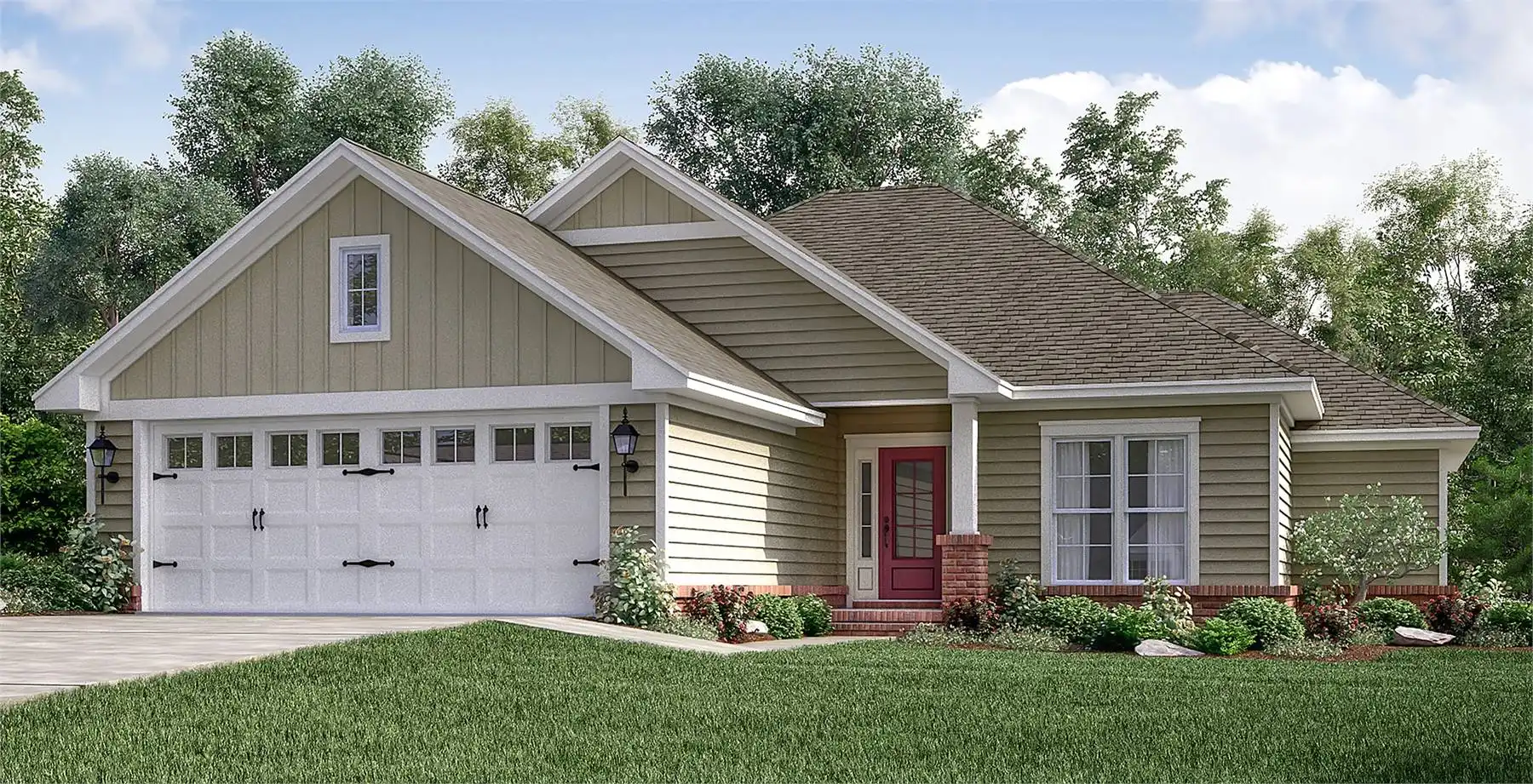 This thoughtfully designed 3-bedroom, 2-bath home combines comfort and value within 1,381 square feet. The entry foyer opens into a bright living room, offering plenty of space to relax or gather with family. An open kitchen and dining area keep the heart of the home connected, making meals and entertaining simple. The primary bedroom provides a restful retreat at day’s end, while two additional bedrooms are ideal for family, guests, or a home office. A covered front porch enhances curb appeal and provides a cozy spot to enjoy the outdoors. The attached 2-car garage adds convenience and storage. With its timeless design and welcoming features, this home is ready to be loved for years to come.