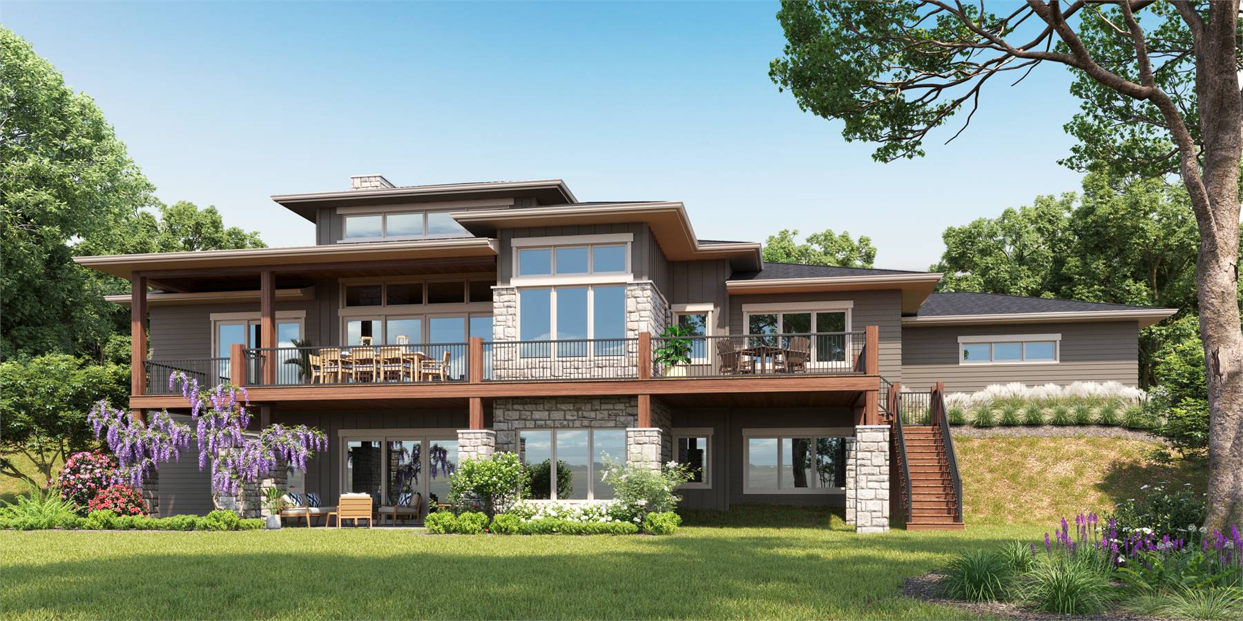 House Plan 11286 blends contemporary styling with a spacious ranch layout designed for comfort and flexibility. The vaulted great room is the heart of the home, connecting effortlessly to the gourmet kitchen, dining area, and covered outdoor living spaces. The primary suite enjoys impressive privacy with a large walk-in closet and a well-appointed bath, while two secondary bedrooms share the opposite wing of the home. A mudroom, oversized pantry, front-entry foyer, and large laundry room support a highly functional flow. Outdoor living is elevated with a covered rear porch, uncovered deck, and a built-in outdoor kitchen. The optional walkout basement level provides exceptional bonus space including a rec room, bar, home theater, office, and two guest bedrooms. A spacious 3-car garage completes this luxurious and versatile home design
