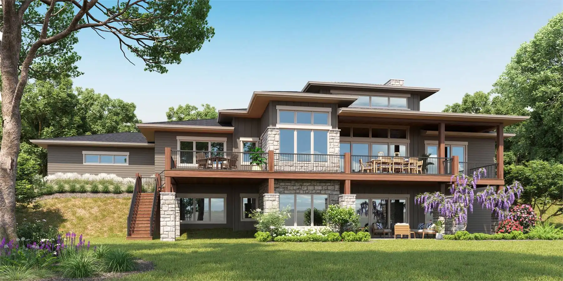House Plan 11286 blends contemporary styling with a spacious ranch layout designed for comfort and flexibility. The vaulted great room is the heart of the home, connecting effortlessly to the gourmet kitchen, dining area, and covered outdoor living spaces. The primary suite enjoys impressive privacy with a large walk-in closet and a well-appointed bath, while two secondary bedrooms share the opposite wing of the home. A mudroom, oversized pantry, front-entry foyer, and large laundry room support a highly functional flow. Outdoor living is elevated with a covered rear porch, uncovered deck, and a built-in outdoor kitchen. The optional walkout basement level provides exceptional bonus space including a rec room, bar, home theater, office, and two guest bedrooms. A spacious 3-car garage completes this luxurious and versatile home design