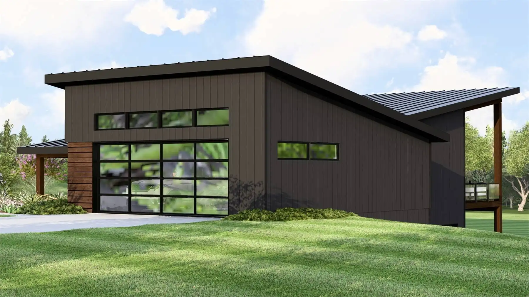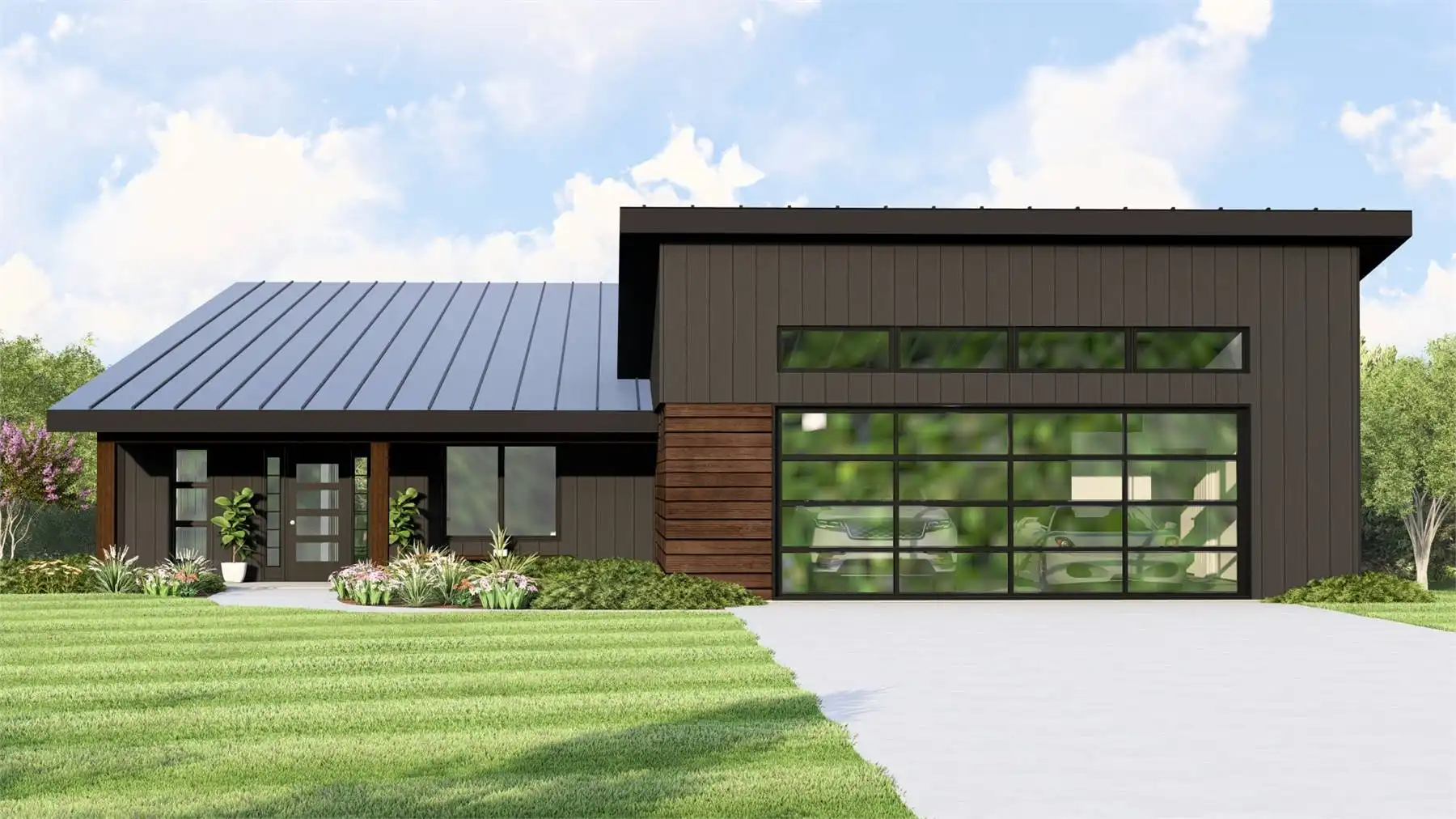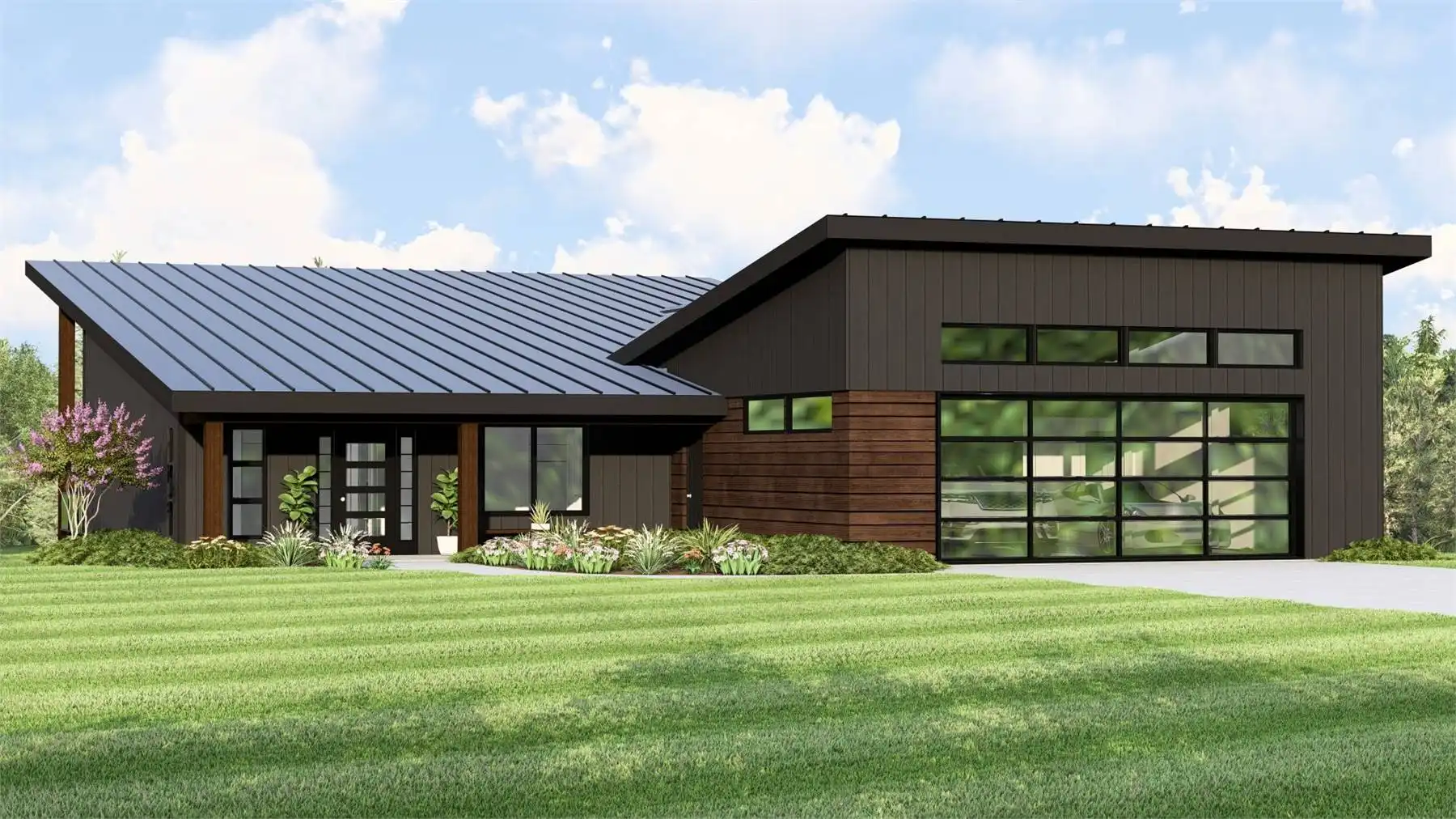 House Plan 11287 combines contemporary design with functional living in a 1,864 square foot, single-story layout. A charming covered front porch opens into a welcoming foyer with a built-in bench, leading to a bright and spacious floor plan. The great room and kitchen share a soaring sloped ceiling, with an L-shaped kitchen that offers a central island and walk-in pantry. The rear of the home is anchored by a massive covered deck, perfect for outdoor dining and enjoying panoramic views. At the front, a guest bedroom includes a private ensuite and walk-in closet, while the left side is dedicated to the primary suite, featuring dual walk-in closets and a luxury bath with a soaking tub and separate shower. Completing the design is a front-facing two-car garage, blending convenience with curb appeal.
