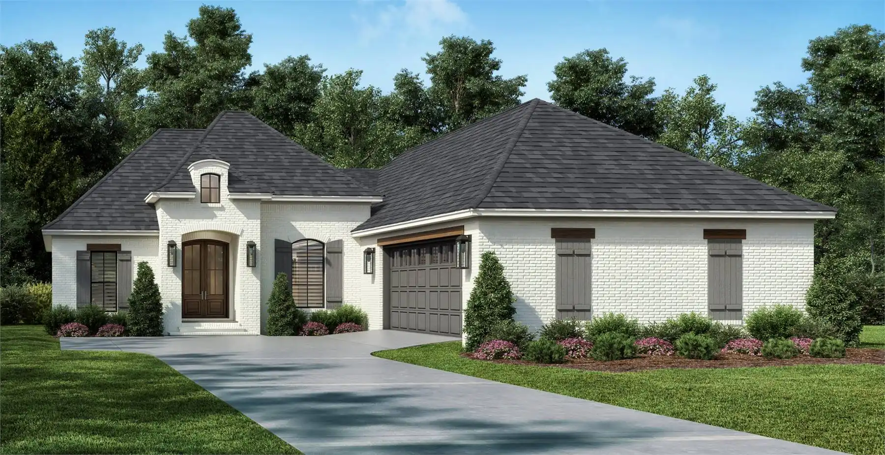 This charming 1945 sq. ft. home offers a stylish Country French design with a perfect blend of comfort and functionality. The courtyard garage and brick exterior give the home a sophisticated, welcoming presence. Inside, the open concept living areas flow seamlessly to the rear porch, ideal for entertaining or relaxing outdoors. The primary bedroom suite provides privacy and convenience, while the dining room and kitchen create the heart of the home. Additional spaces like the mudroom, lockers, and walk-in pantry add practicality for busy families. With three spacious bedrooms and two full baths, there’s room for everyone to feel at home. This design combines beauty and livability, offering a space where your family can thrive and enjoy every day.