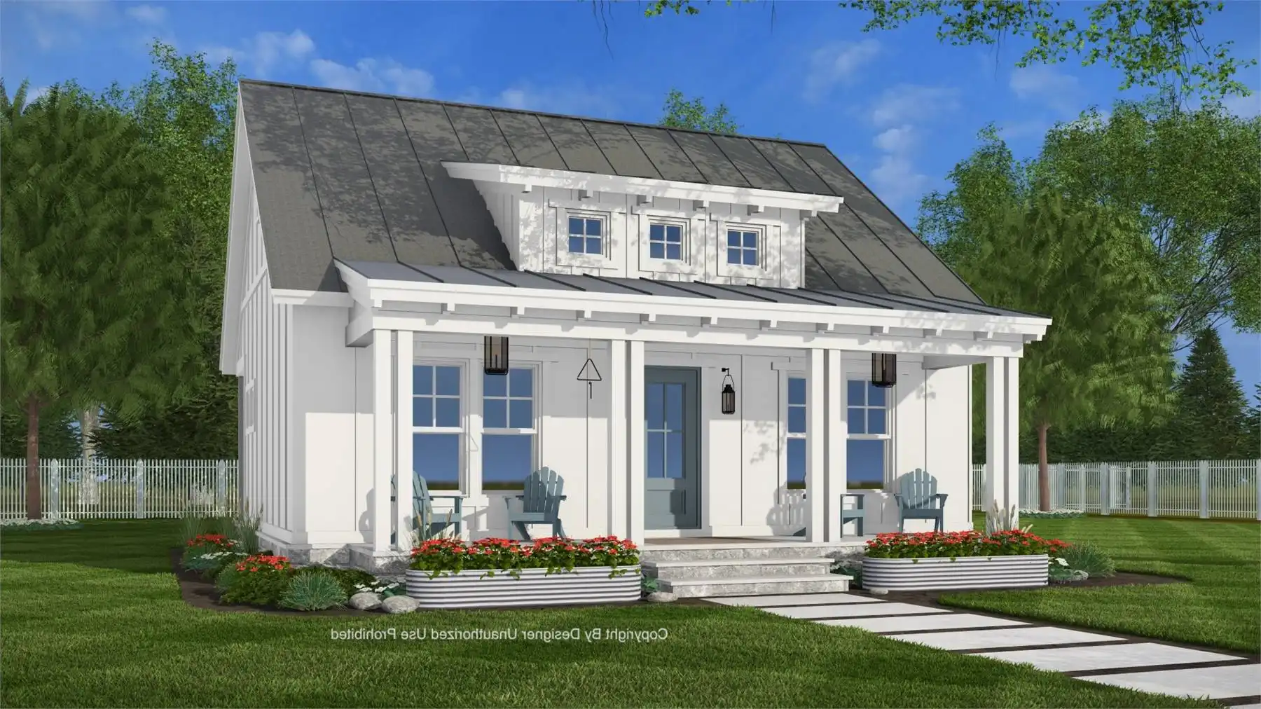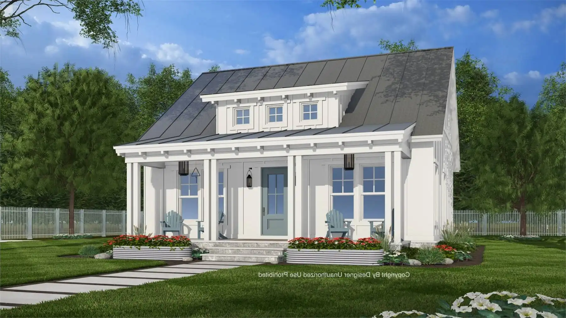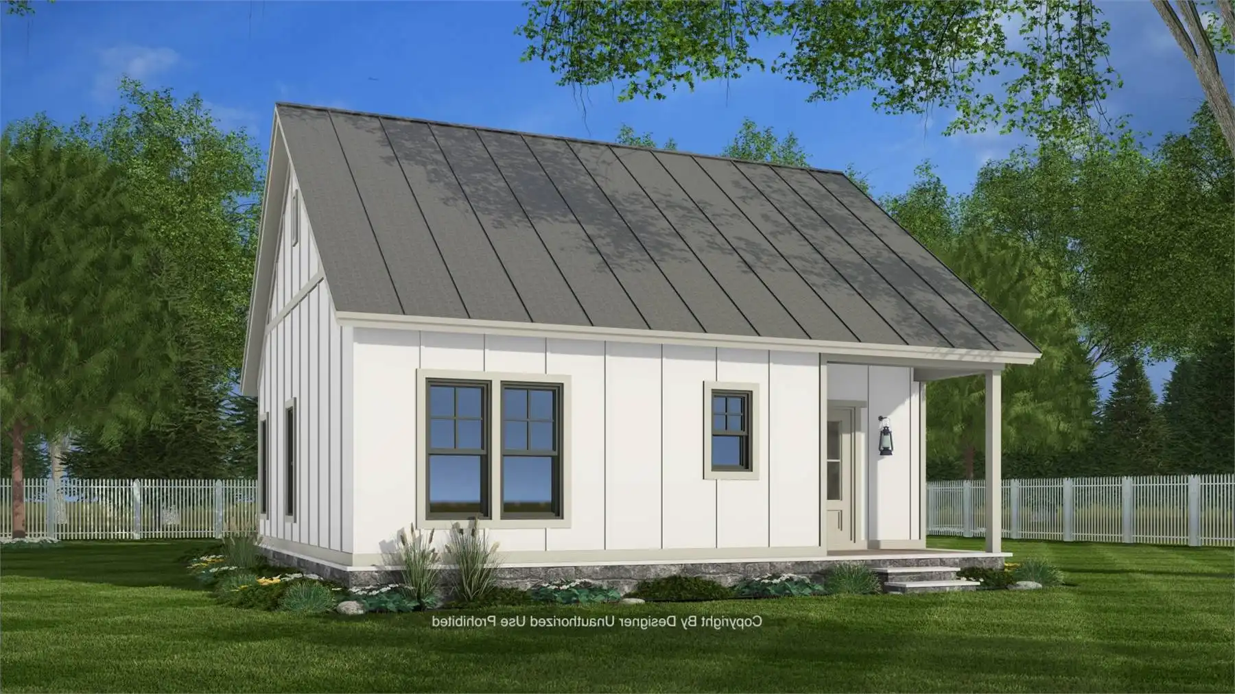 Plan 11317 blends the rustic charm of a farmhouse cottage with the simplicity of modern living in an efficient, single-level design. A vaulted ceiling opens the living and dining areas, creating a bright, airy gathering space connected to the kitchen and its large central island for meals and conversation. At the rear, a practical entry zone with built-in lockers, laundry, and utility storage keeps the home neat and organized. The bedroom offers a cozy escape near a full bathroom, complemented by built-in shelves and a linen closet for added functionality. A rear porch extends the living space outdoors for breezy relaxation. With its mix of charm, efficiency, and comfort, Plan 11317 is an inviting choice for downsized living, a guest house, or a peaceful vacation retreat.