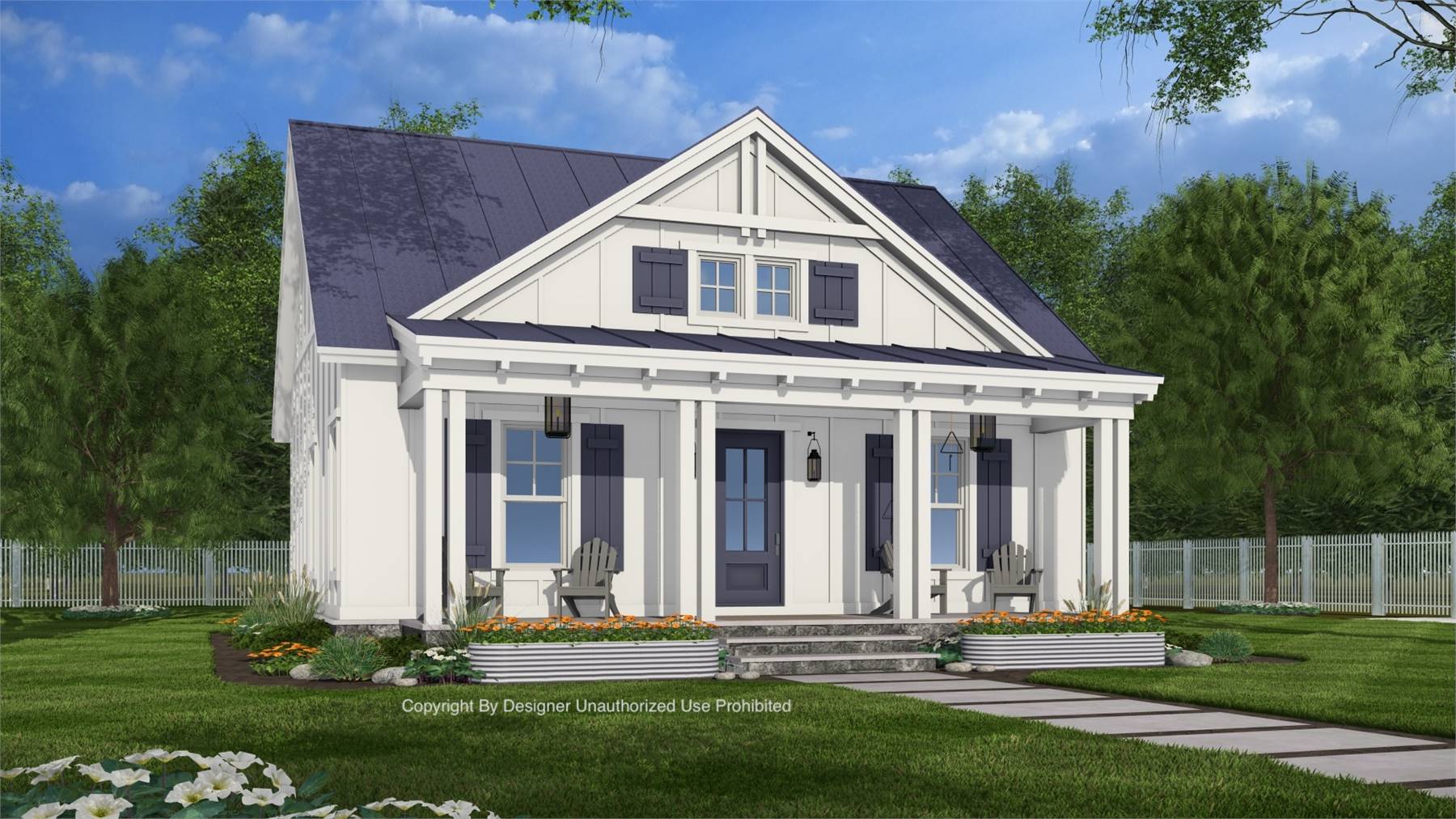 House Plan 11318, Merriwick, blends timeless farmhouse charm with efficient cottage-style living in a thoughtfully designed, compact layout. The open-concept interior seamlessly links the living, dining, and kitchen areas beneath a vaulted ceiling that brightens the space with natural light. A central kitchen island creates a welcoming hub for cooking, dining, and gathering with family and friends. At the back of the home, a practical entry area includes built-in lockers, a washer and dryer, and the water heater, keeping everyday essentials neatly organized and out of sight. The cozy back porch provides a tranquil spot to relax outdoors, while the bedroom offers a peaceful retreat near a full bath complete with built-in shelving and a linen closet for smart storage. Perfect as a primary home, a guest house, or a quiet getaway, this design delivers both rustic character and functional comfort in a modern farmhouse cottage.