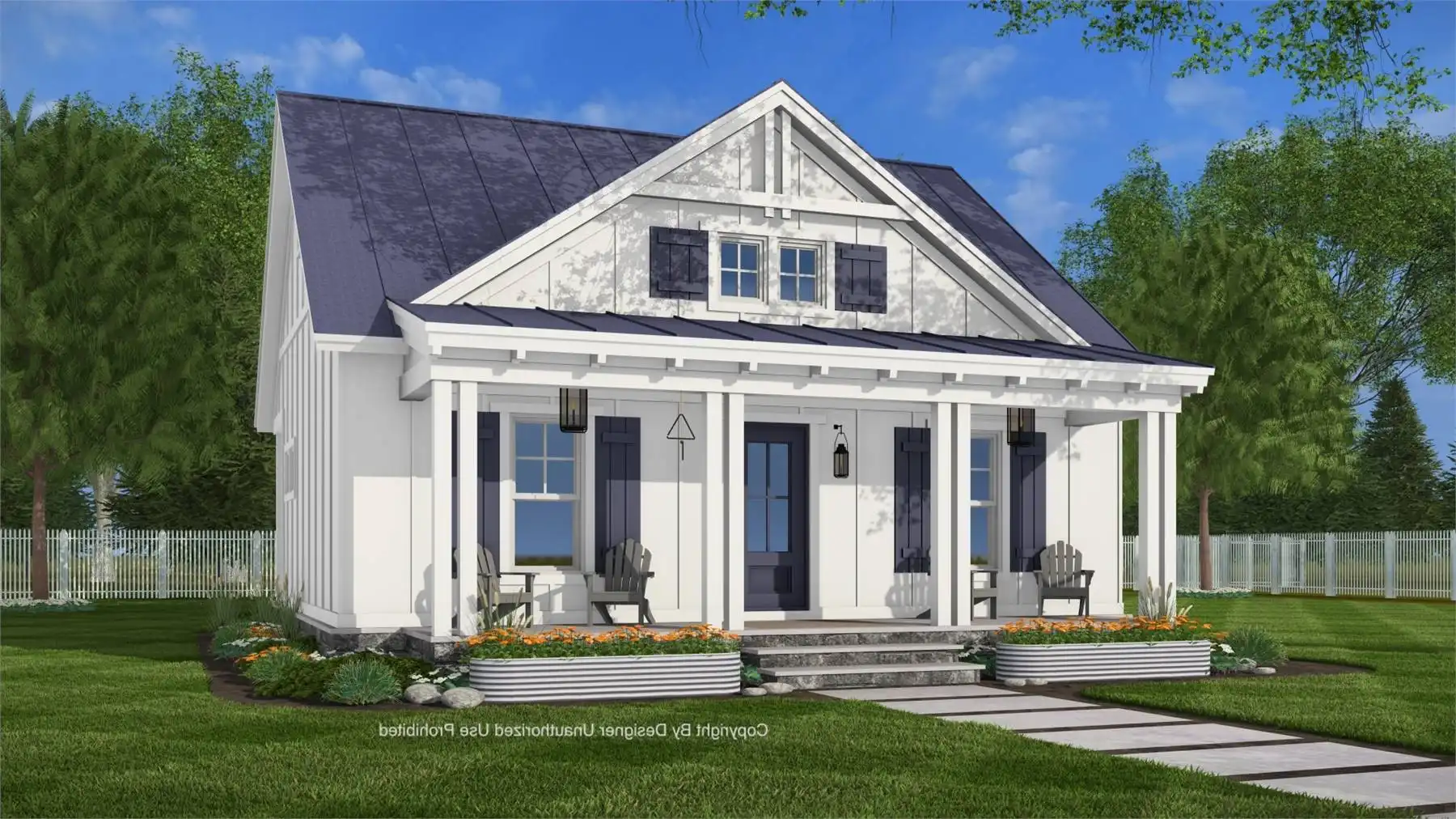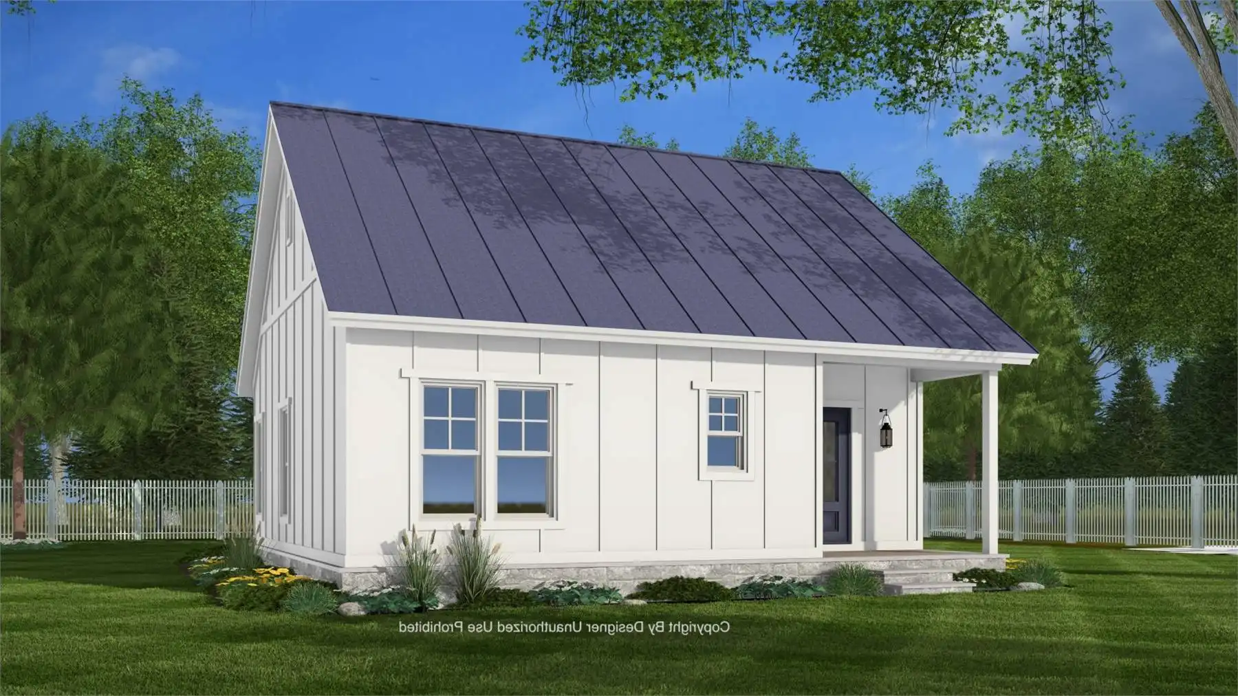 House Plan 11318, Merriwick, blends timeless farmhouse charm with efficient cottage-style living in a thoughtfully designed, compact layout. The open-concept interior seamlessly links the living, dining, and kitchen areas beneath a vaulted ceiling that brightens the space with natural light. A central kitchen island creates a welcoming hub for cooking, dining, and gathering with family and friends. At the back of the home, a practical entry area includes built-in lockers, a washer and dryer, and the water heater, keeping everyday essentials neatly organized and out of sight. The cozy back porch provides a tranquil spot to relax outdoors, while the bedroom offers a peaceful retreat near a full bath complete with built-in shelving and a linen closet for smart storage. Perfect as a primary home, a guest house, or a quiet getaway, this design delivers both rustic character and functional comfort in a modern farmhouse cottage.