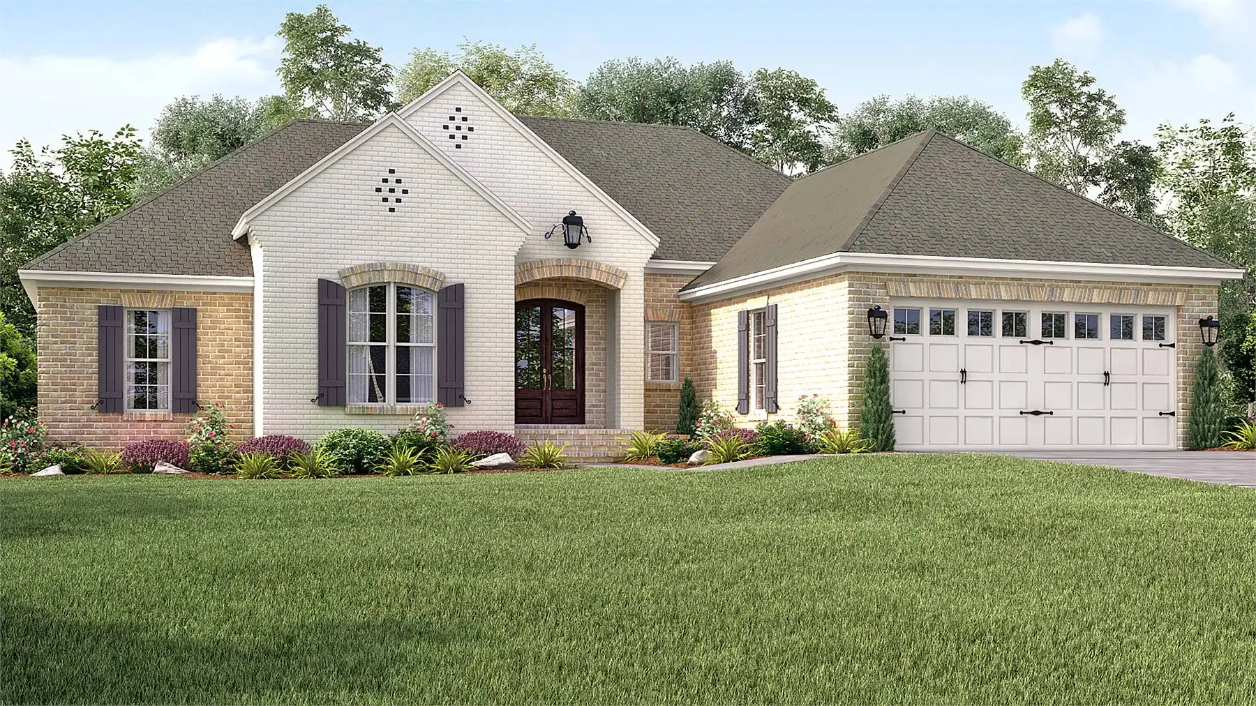This charming 2,016 sq. ft. French Country design features 4 bedrooms, 2 baths, and a stylish brick and painted brick exterior. The foyer opens to a bright great room that flows effortlessly into the dining area and kitchen, creating a warm, open space for everyday living. The primary suite is a private retreat, offering a soaking tub, walk-in shower, dual vanities, and a spacious walk-in closet. Three secondary bedrooms provide comfort and flexibility, ideal for children, guests, or even a home office. Outdoor living is highlighted by a rear porch and patio that encourage entertaining or simply enjoying the view. Subtle European details give the exterior a timeless character that enhances its curb appeal. This home blends French Country charm with modern comfort, making it perfect for family living.