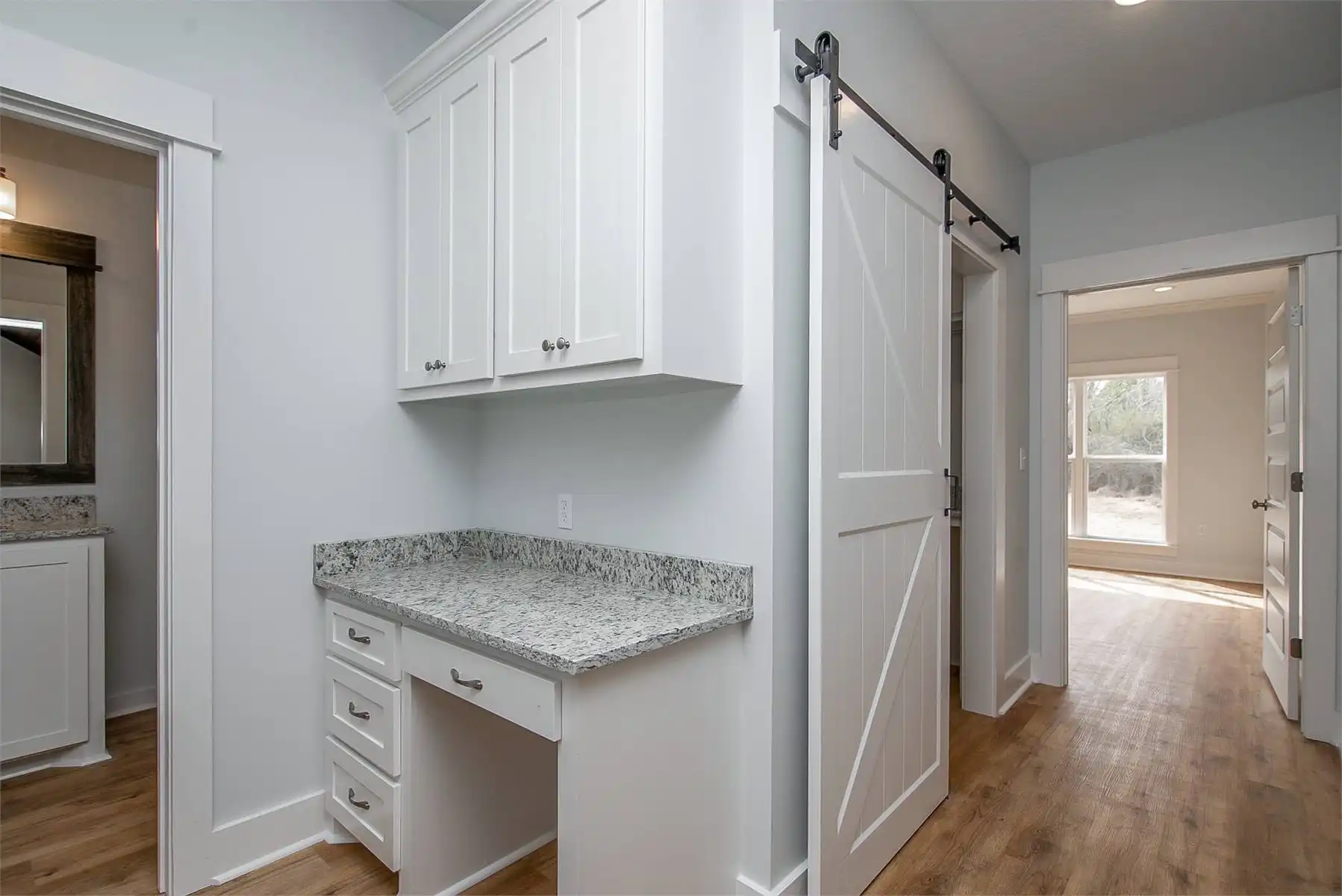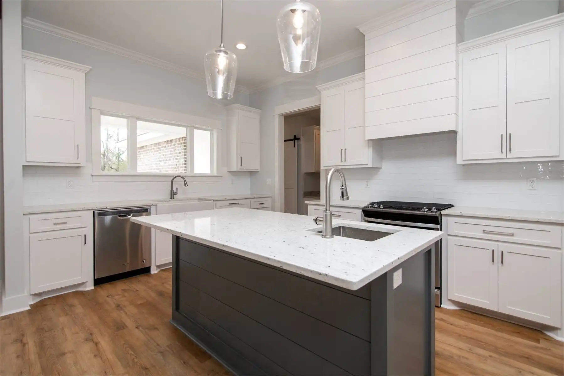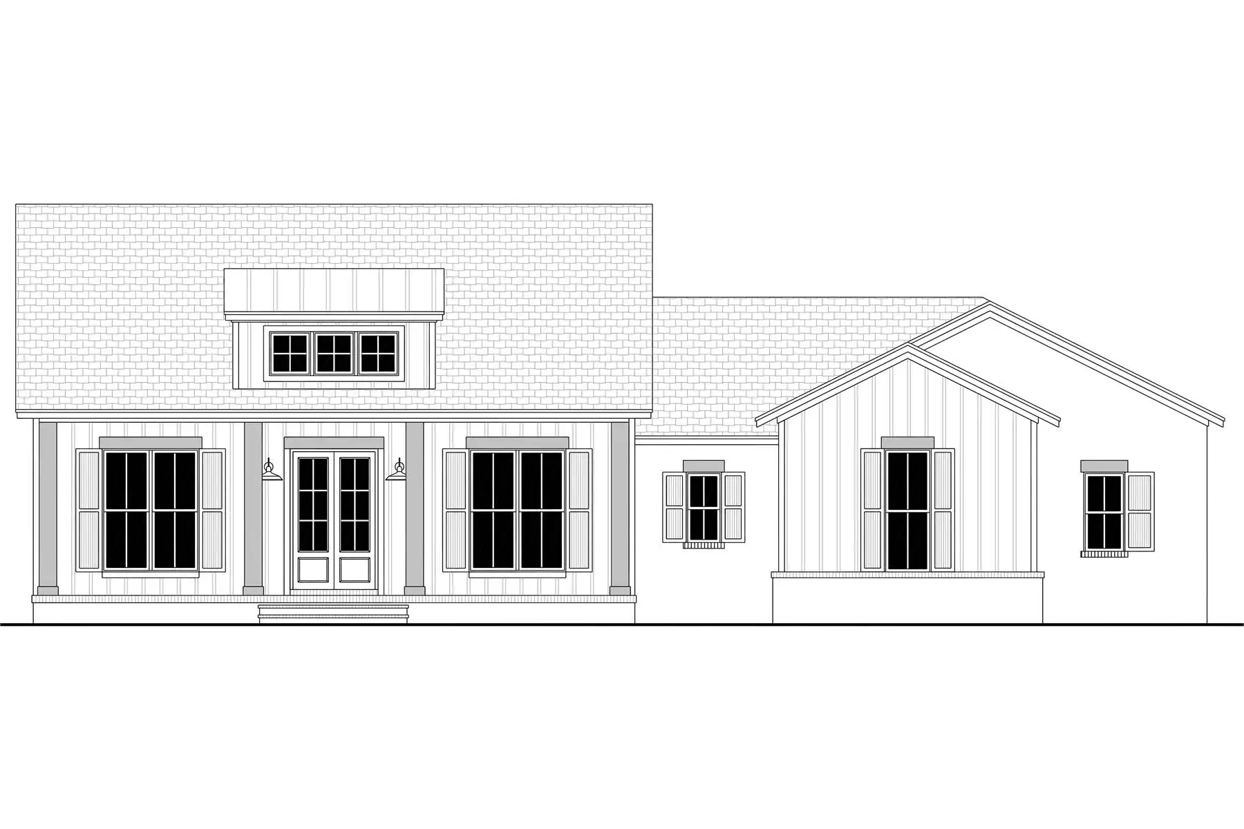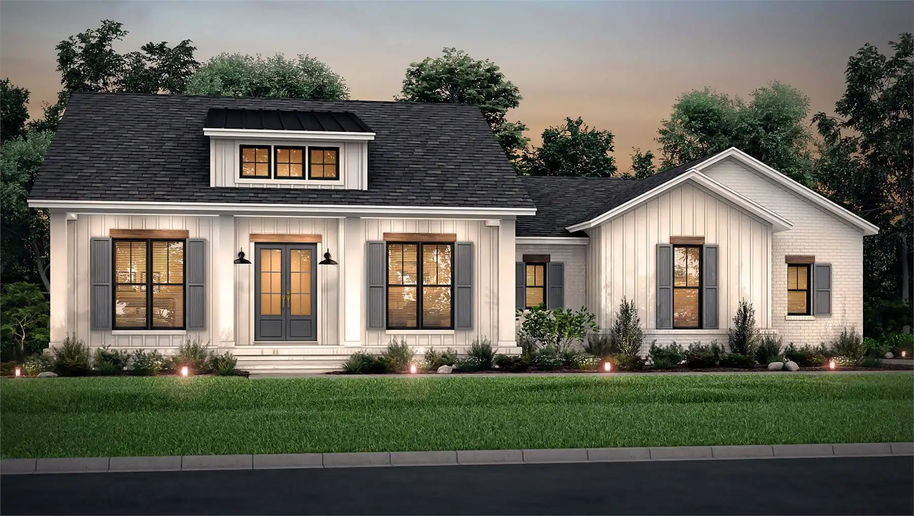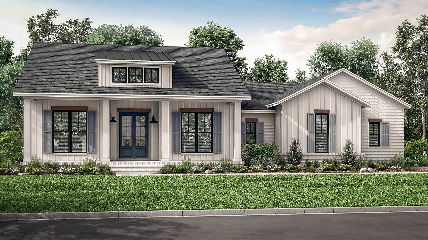 This charming 2,044 sq. ft. ranch design offers 3 bedrooms, 2.5 baths, and a welcoming exterior accented with brick and board and batten details. Inside, a vaulted ceiling elevates the great room, which flows naturally into the dining and kitchen areas for easy entertaining. The kitchen includes abundant counter space and a walk-in pantry, making it both stylish and functional. The primary suite is a peaceful retreat with a spa-like bath, oversized closet, and a smart connection to the laundry room. Secondary bedrooms each have walk-in closets, providing comfort and organization for family or guests. Wide front and rear porches extend living outdoors, perfect for summer evenings or weekend gatherings. Blending traditional ranch style with modern touches, this home combines timeless design with everyday convenience.