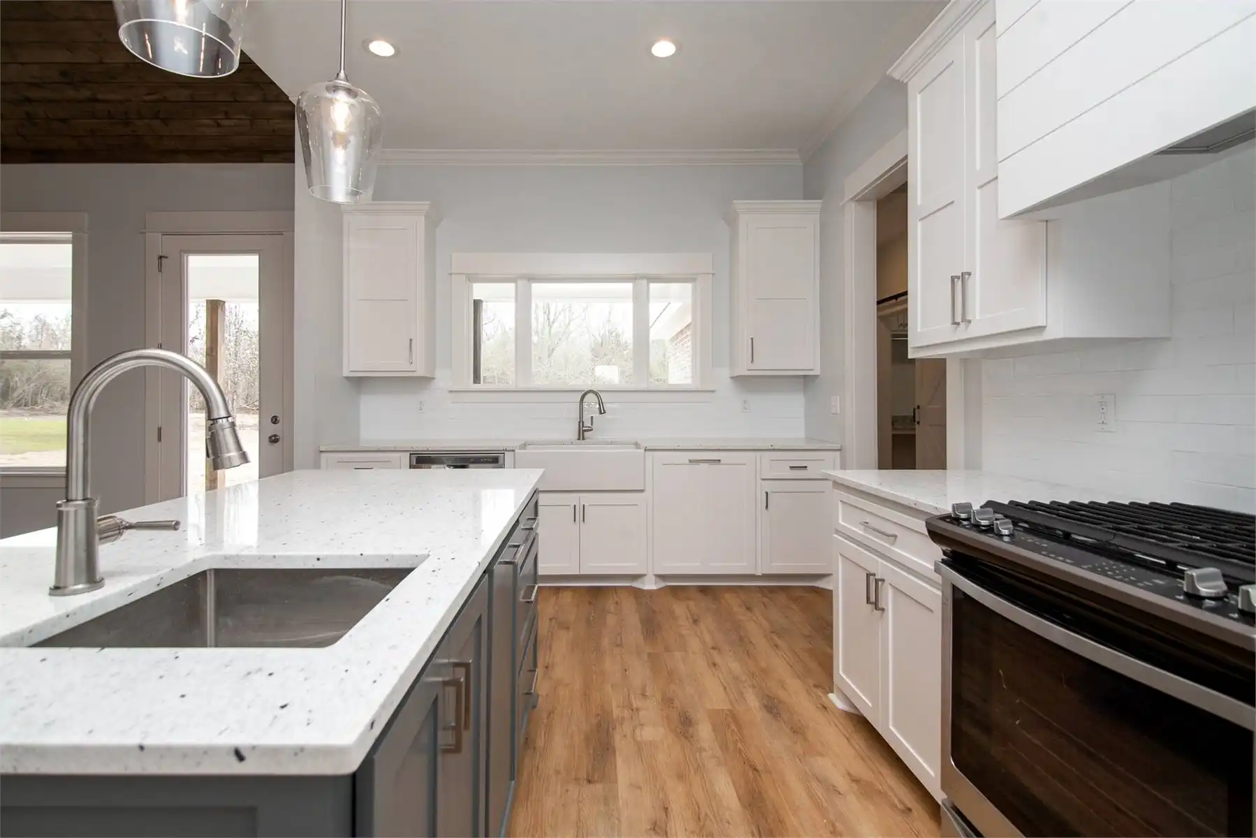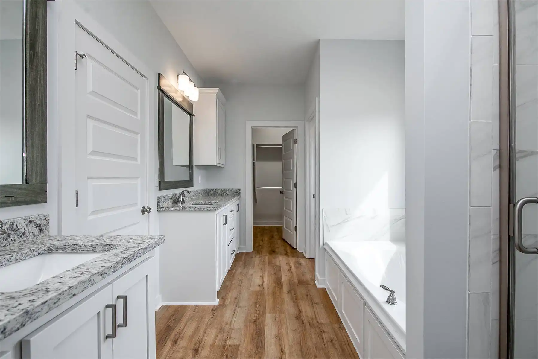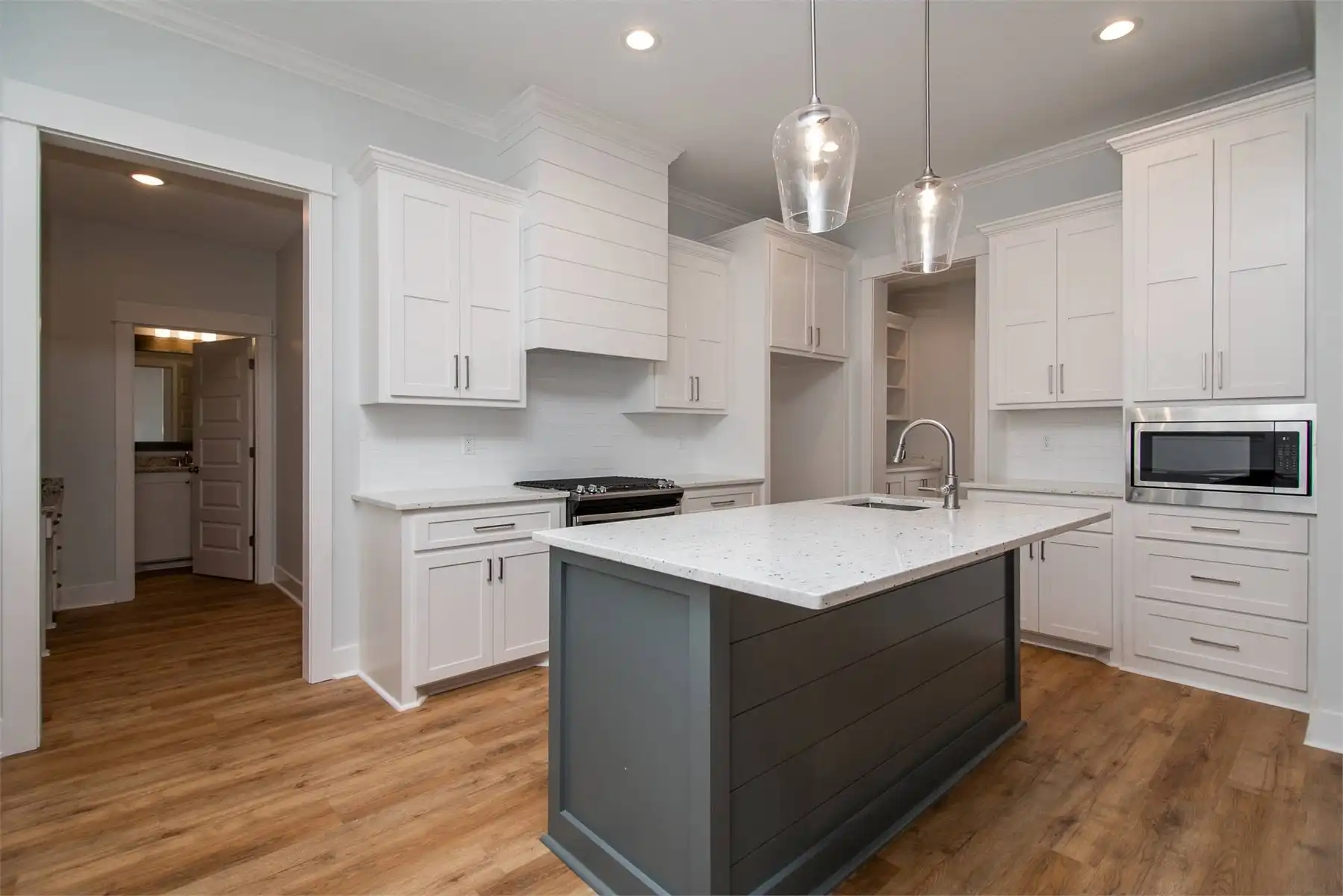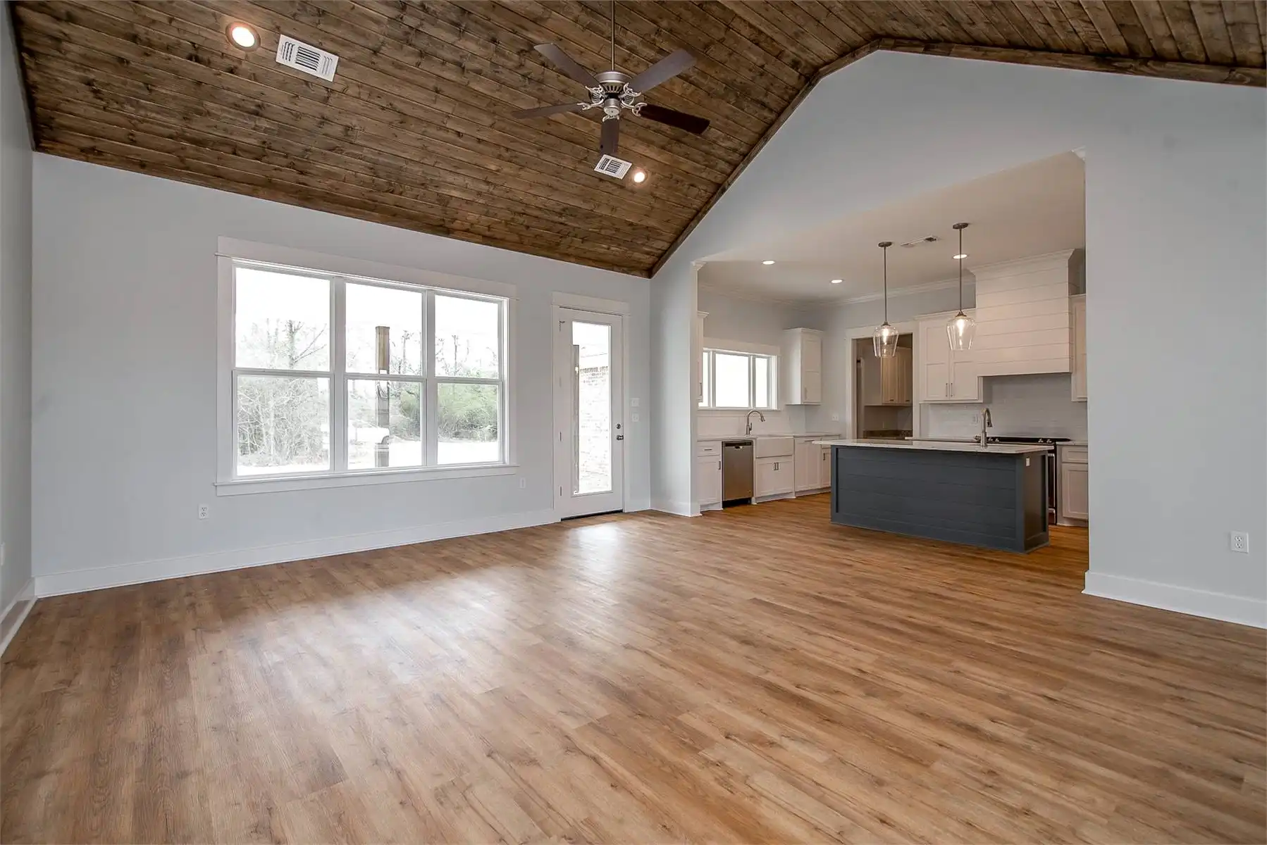 This charming 2,044 sq. ft. ranch design offers 3 bedrooms, 2.5 baths, and a welcoming exterior accented with brick and board and batten details. Inside, a vaulted ceiling elevates the great room, which flows naturally into the dining and kitchen areas for easy entertaining. The kitchen includes abundant counter space and a walk-in pantry, making it both stylish and functional. The primary suite is a peaceful retreat with a spa-like bath, oversized closet, and a smart connection to the laundry room. Secondary bedrooms each have walk-in closets, providing comfort and organization for family or guests. Wide front and rear porches extend living outdoors, perfect for summer evenings or weekend gatherings. Blending traditional ranch style with modern touches, this home combines timeless design with everyday convenience.