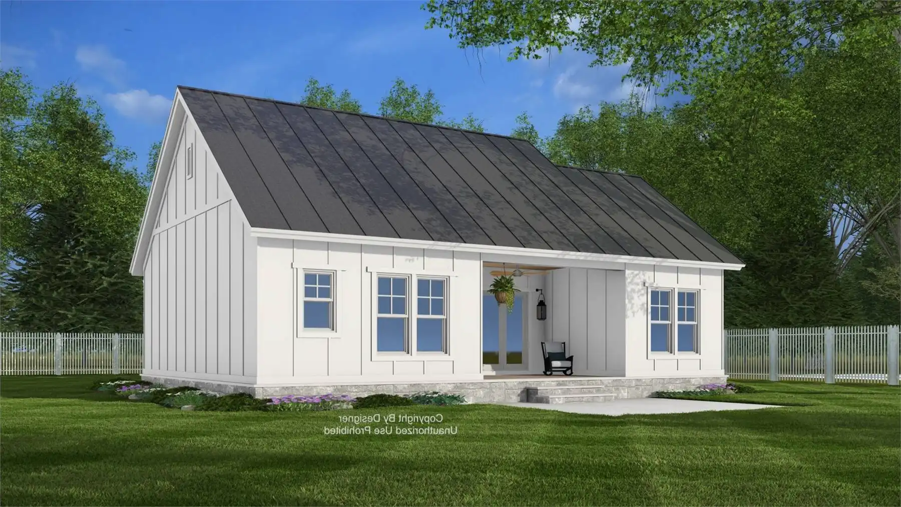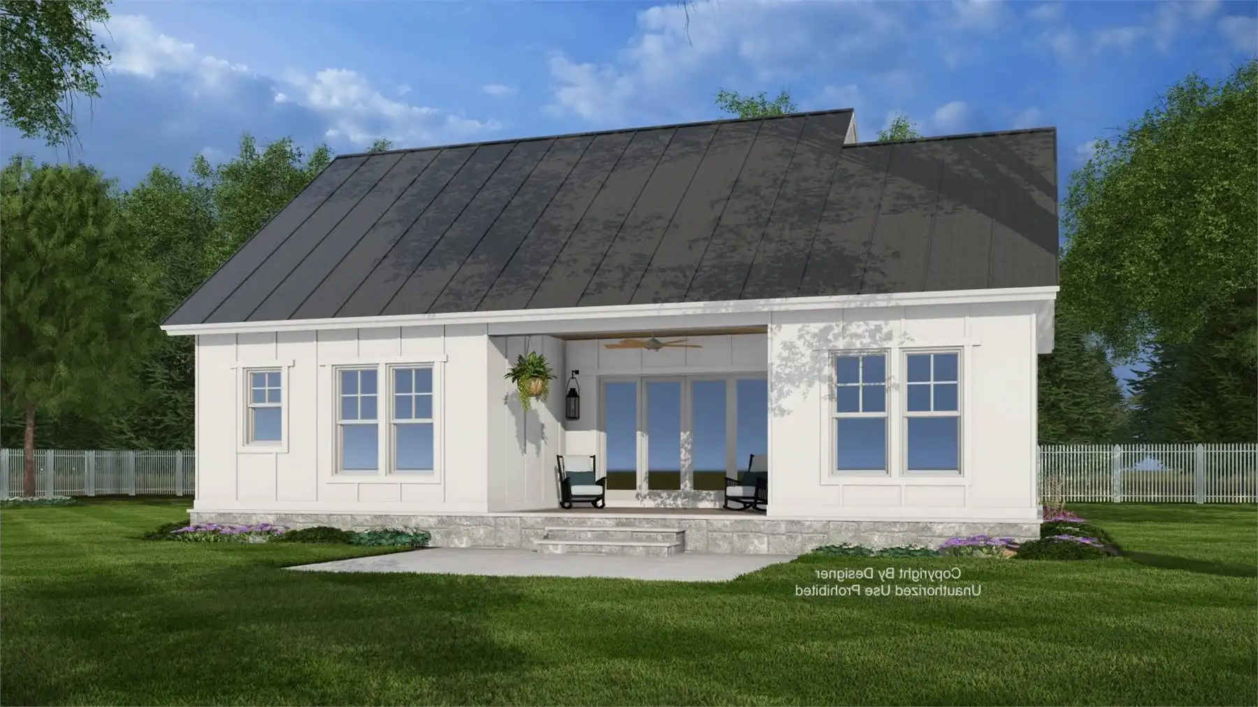 House Plan 11366 combines farmhouse character with cottage efficiency in a functional two-bedroom design. The vaulted living and dining area serves as the central hub, featuring expansive windows, a cozy fireplace, and direct connection to the kitchen. A large island anchors the kitchen, providing casual seating and prep space, while a nearby pantry keeps storage organized. The private primary suite includes a spacious walk-in closet and access to a full bathroom, while the secondary bedroom—with its own walk-in closet—is perfectly placed near another full bath for guests or family members. Sliding doors open to a rear covered porch for relaxed outdoor living, and a compact laundry area tucked into the hallway ensures convenience without sacrificing space. This clean, efficient floor plan balances comfort, natural light, and farmhouse warmth in every detail.
