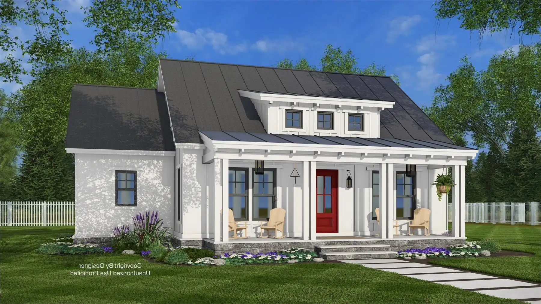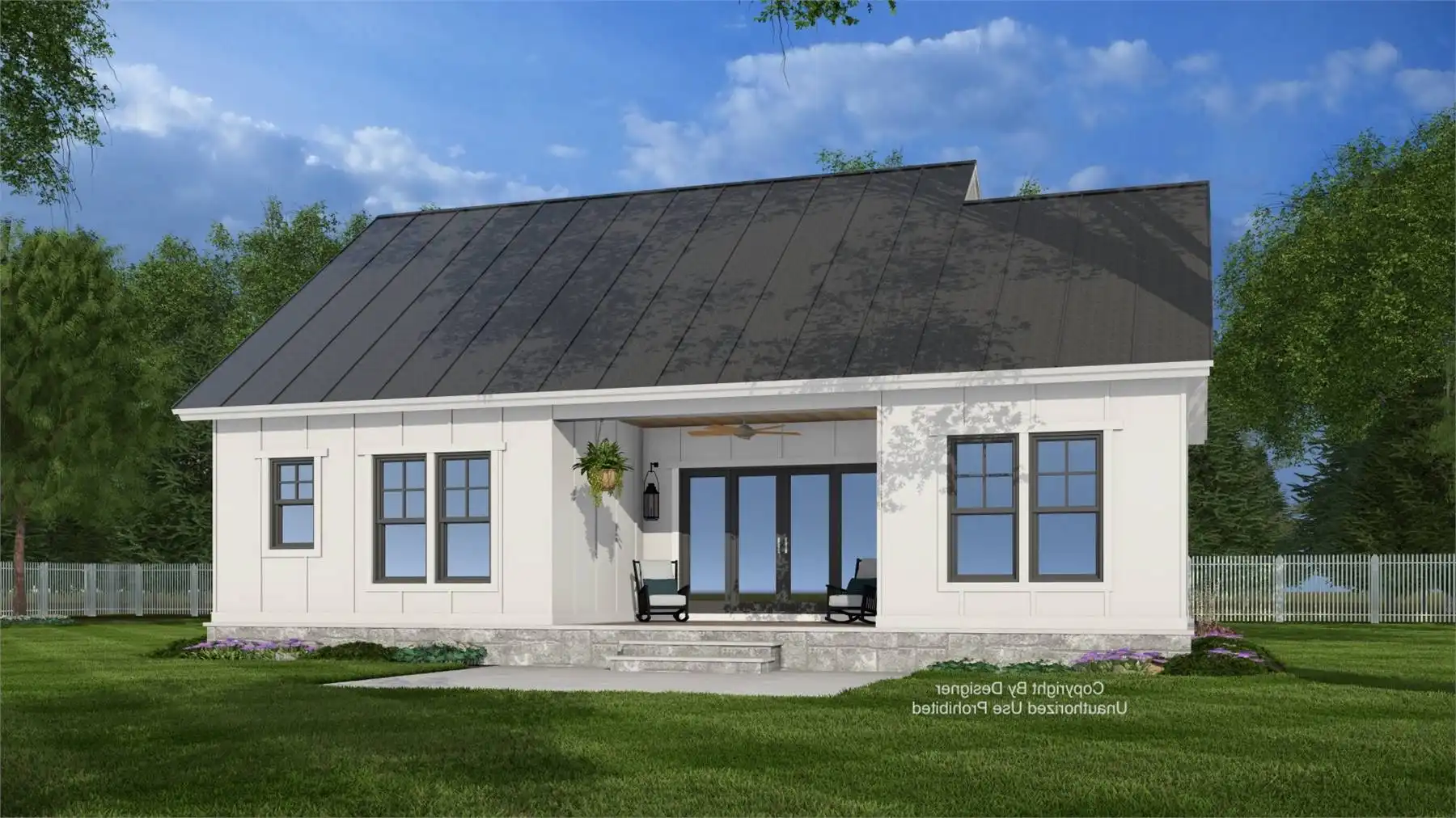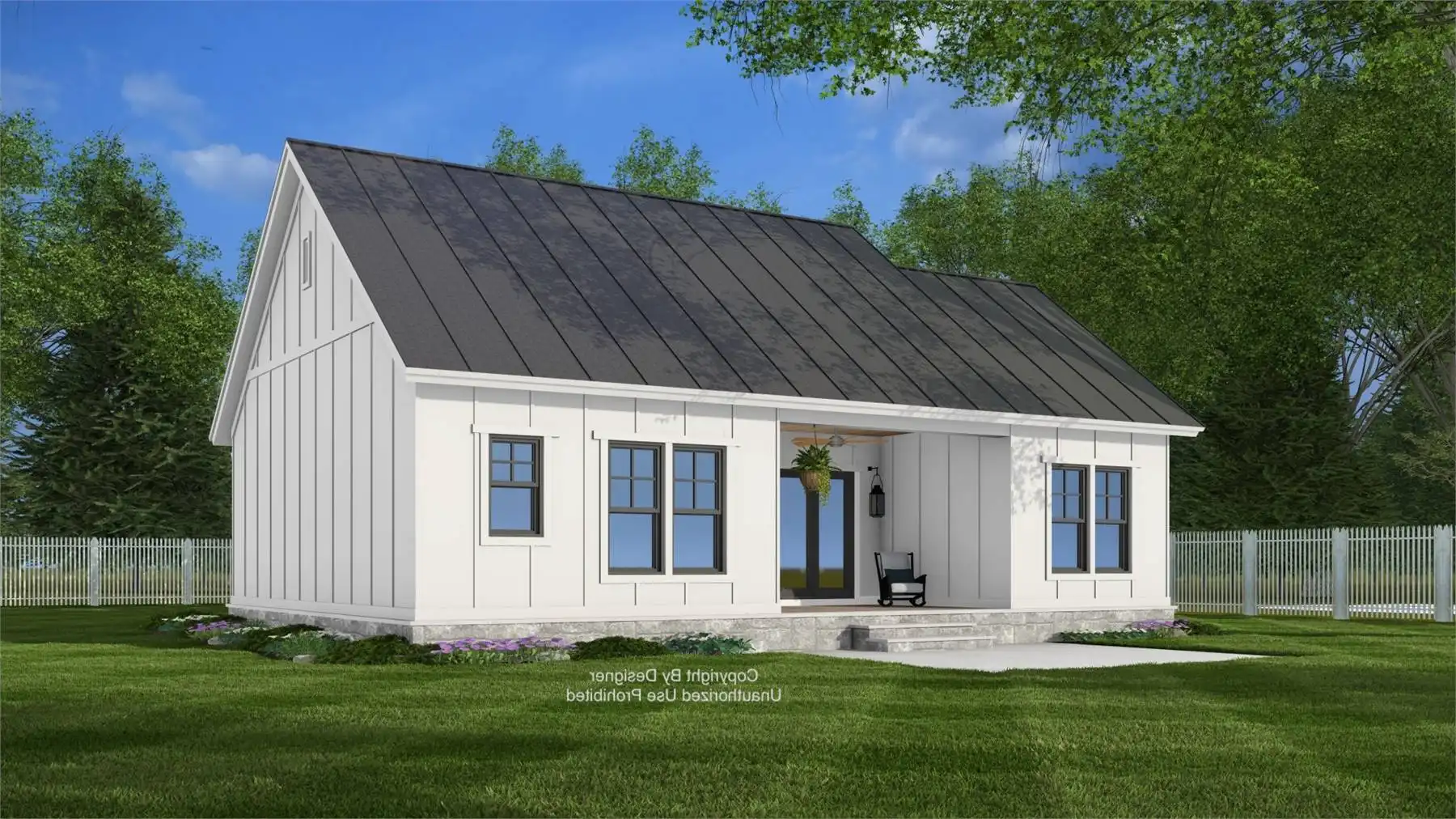 Plan 11367 is a cozy farmhouse cottage that offers a clean and functional layout with timeless charm. A vaulted living and dining area with fireplace creates a bright and inviting central space, seamlessly connected to the kitchen with its large island and nearby pantry. The primary suite features a walk-in closet and private bath access, while a second bedroom with its own walk-in closet enjoys proximity to another full bathroom, making the design versatile for family or guests. A sliding patio door opens to a rear covered porch for easy outdoor living, and a tucked-away laundry nook adds efficiency without interrupting the home’s flow. Plan 11367 combines simplicity, comfort, and farmhouse style in a practical single-level layout.