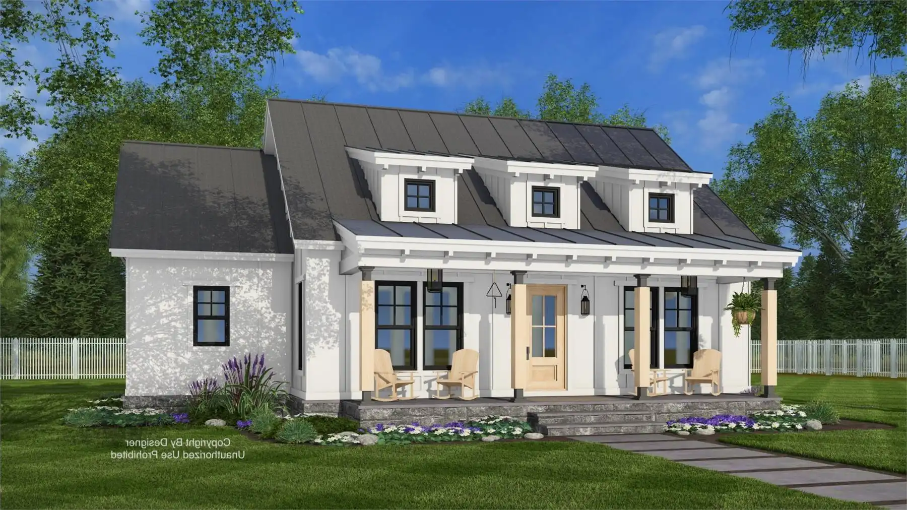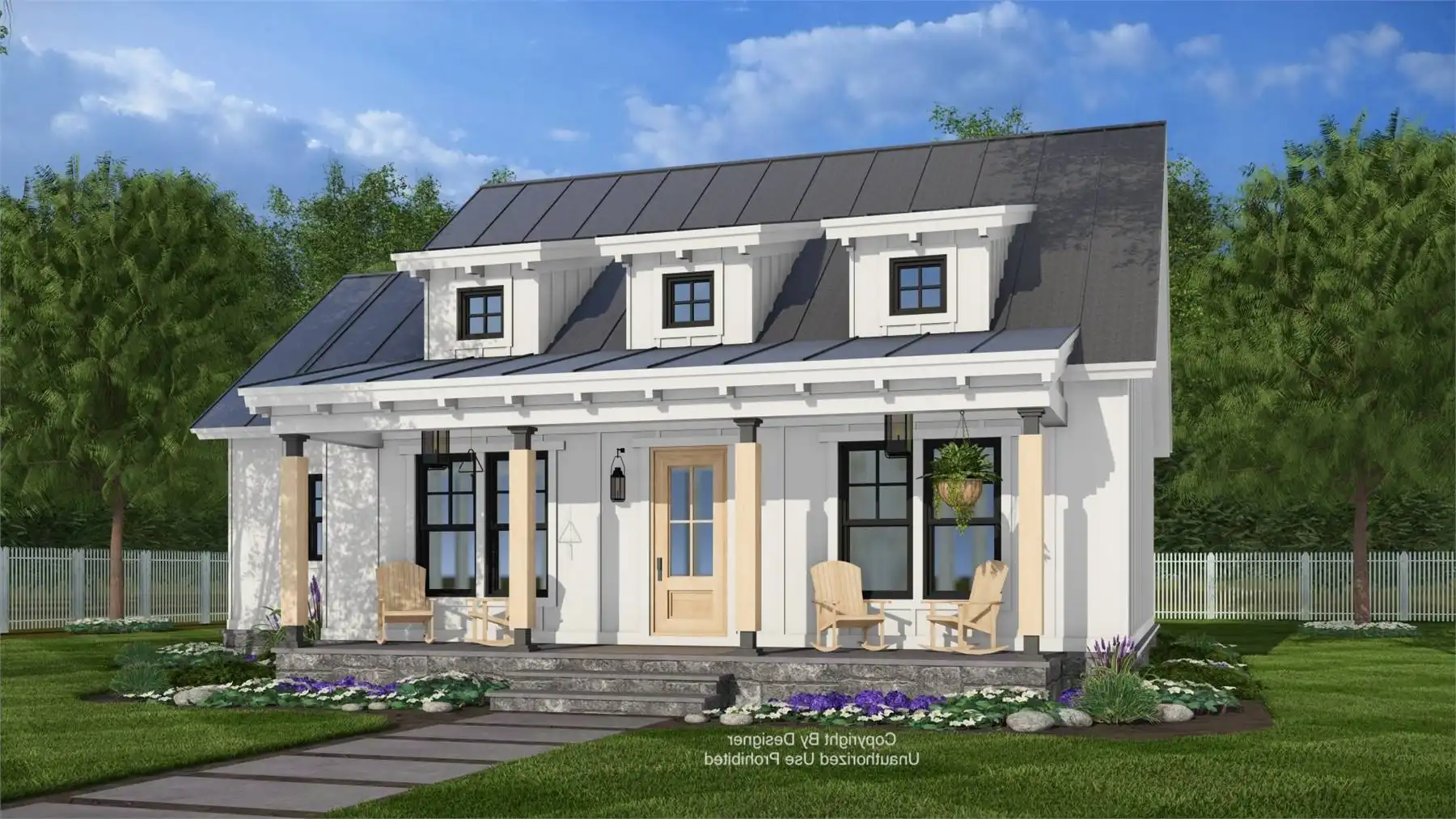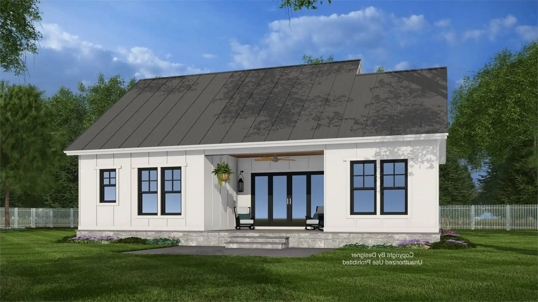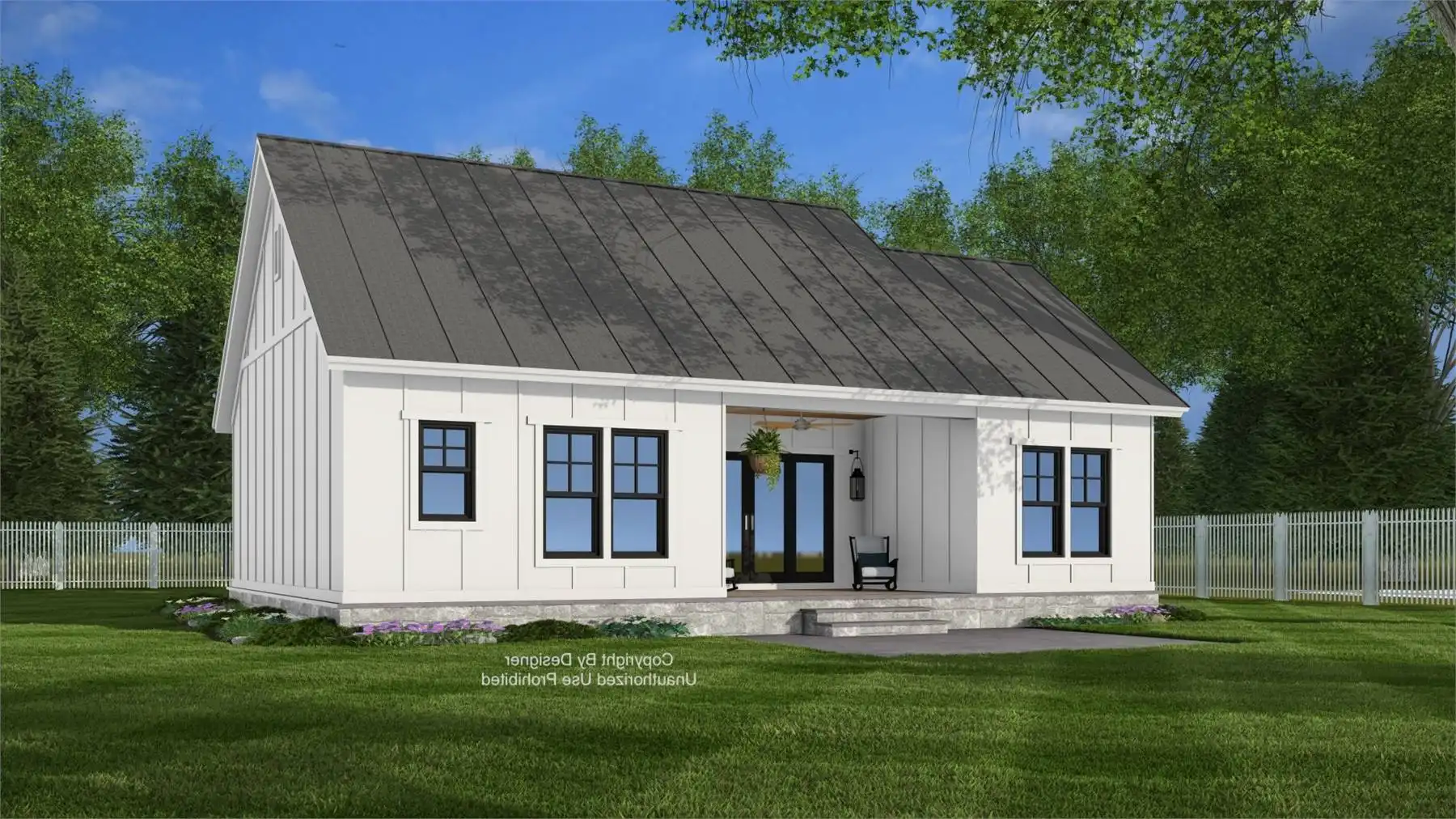 Plan 11368 offers a welcoming farmhouse-inspired cottage that combines open living with efficient organization. A vaulted living and dining space, accented by large windows and a fireplace, creates the central gathering area of the home. The kitchen is designed for both convenience and connection, with a large island for seating and prep space, plus a nearby pantry for storage. The primary bedroom includes a walk-in closet and private access to a full bath, while a secondary bedroom with its own walk-in closet sits near a second full bath, providing flexible space for family or guests. At the back, a sliding patio door leads to a covered porch for outdoor living. A discreet laundry nook keeps daily chores simple without interrupting the flow of the home. Plan 11368 is a thoughtful design that delivers charm, comfort, and practicality in a right-sized footprint.