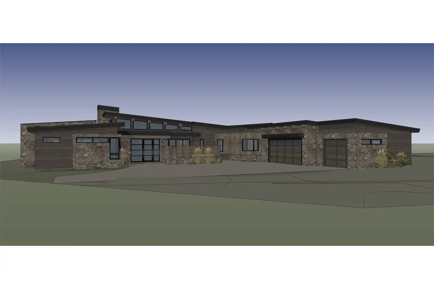 House Plan 11379 combines modern styling with a comfortable and functional single-story layout. The spacious kitchen flows into the dining and great room, offering clear sightlines and an effortless gathering space. The primary suite features a double-vanity bath, walk-in shower, luxurious soaking tub, and a large walk-in closet. A private study provides space for remote work, while the opposite bedroom wing includes two guest suites and a game/media room for recreation. The covered outdoor living terrace enhances indoor-outdoor connection and encourages year-round enjoyment. A 3-car courtyard garage keeps vehicles organized and the front elevation clean and modern. Perfect for homeowners seeking a relaxed, sophisticated, and efficient floor plan.
