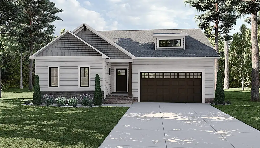 House Plan 11383 is a beautiful 1,780-sq.-ft. bungalow cottage that offers one-level living with exceptional flow and function. The vaulted family room opens to a bright dinette and kitchen with an island and ample storage. The split-bedroom design places the primary suite apart, featuring a private bath, dual sinks, and a spacious walk-in closet. Two secondary bedrooms share a hall bath near the laundry and garage entrance. A covered front porch adds a welcoming touch, while the 2-car garage offers convenient front entry. Ideal for families or downsizers, this plan combines Craftsman-style charm with a clean, modern layout designed for everyday comfort.