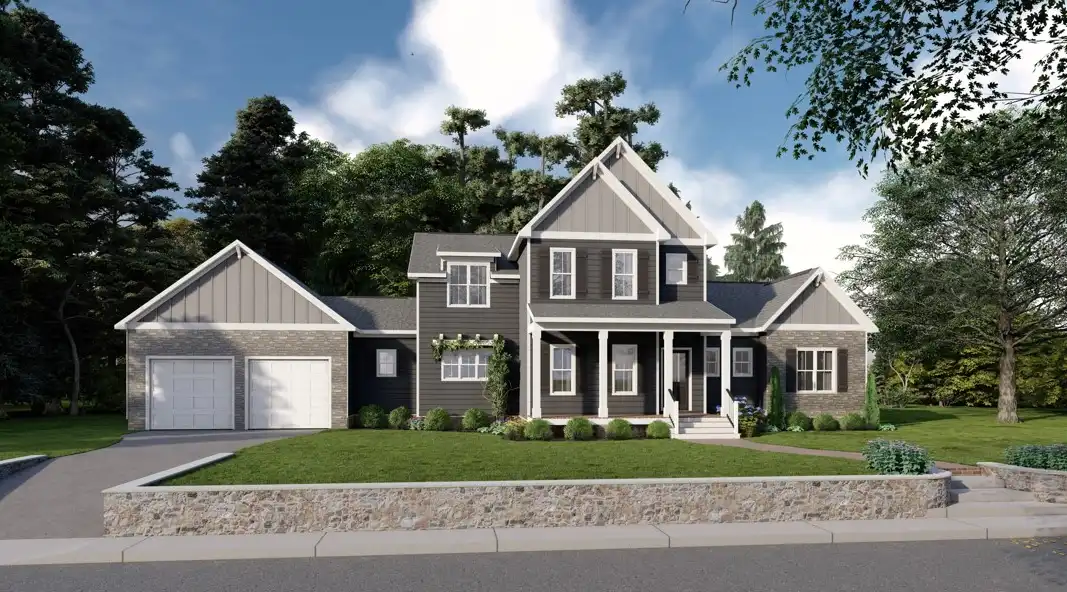 House Plan 11400 blends timeless farmhouse design with a versatile family layout. With 2,905 sq. ft. of living space, this home features 4 bedrooms and 2.5 bathrooms across two stories. The main level highlights a large open kitchen with a center island and butler’s pantry, a breakfast nook, and a warm family room that flows seamlessly together. A spacious primary suite is also on the first floor, complete with a luxurious bath offering a soaking tub, walk-in shower, dual vanities, and a walk-in closet. Upstairs, three additional bedrooms, a full bathroom, a loft, and a convenient laundry room provide comfort for family and guests alike. A front porch adds curb appeal while the rear porch extends living outdoors. This farmhouse plan is perfect for homeowners seeking open-concept living with practical details for everyday life.