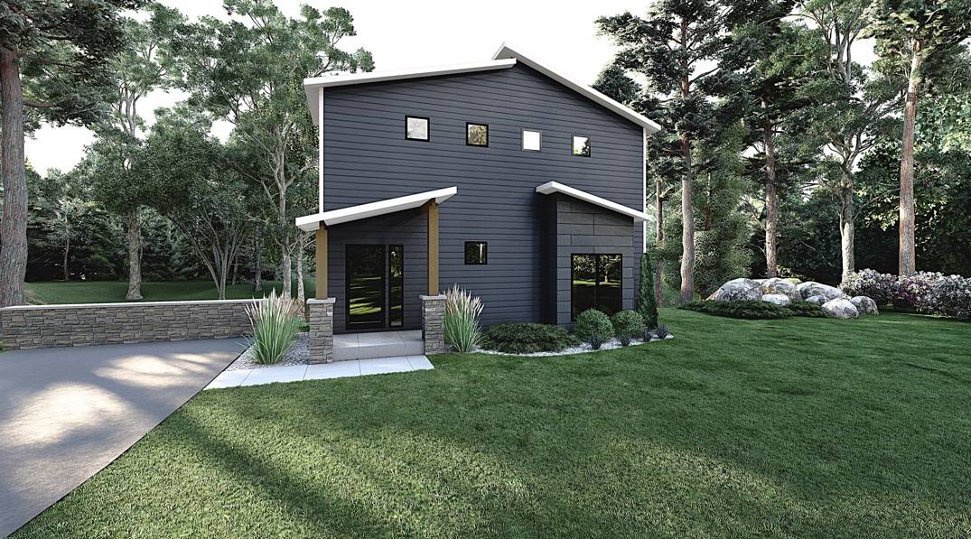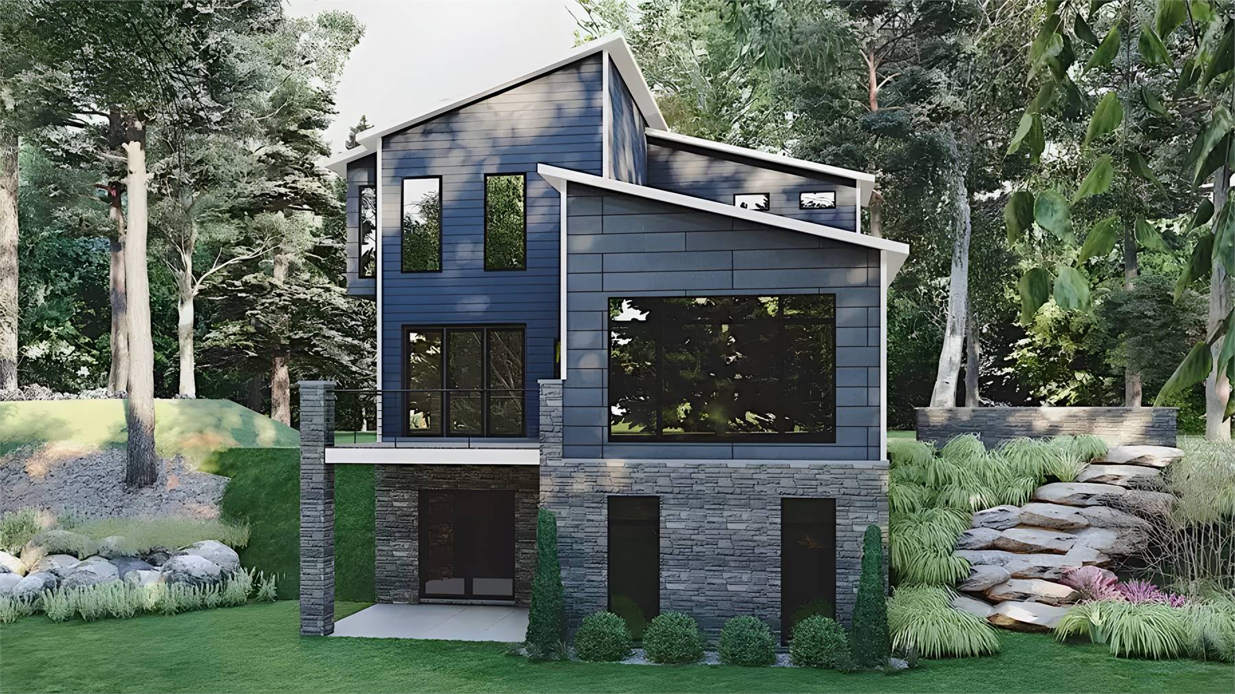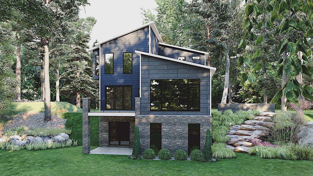 House Plan 11404 is an amazing contemporary home made to optimize a natural location! It's perfect for a narrow sloping lot and stacks 2,097 square feet with three bedrooms and two-and-a-half bathrooms across three levels--two stories and the finished basement. The main floor includes the island kitchen open to the living space, the formal dining area, a flex room, and the powder room. Upstairs, the primary suite has total privacy. The bedroom is surrounded by windows and there's a four-piece bath. Downstairs, you'll find two bedrooms, a bathroom, and the laundry. This design gives you the option to add a garage in front, if you want!