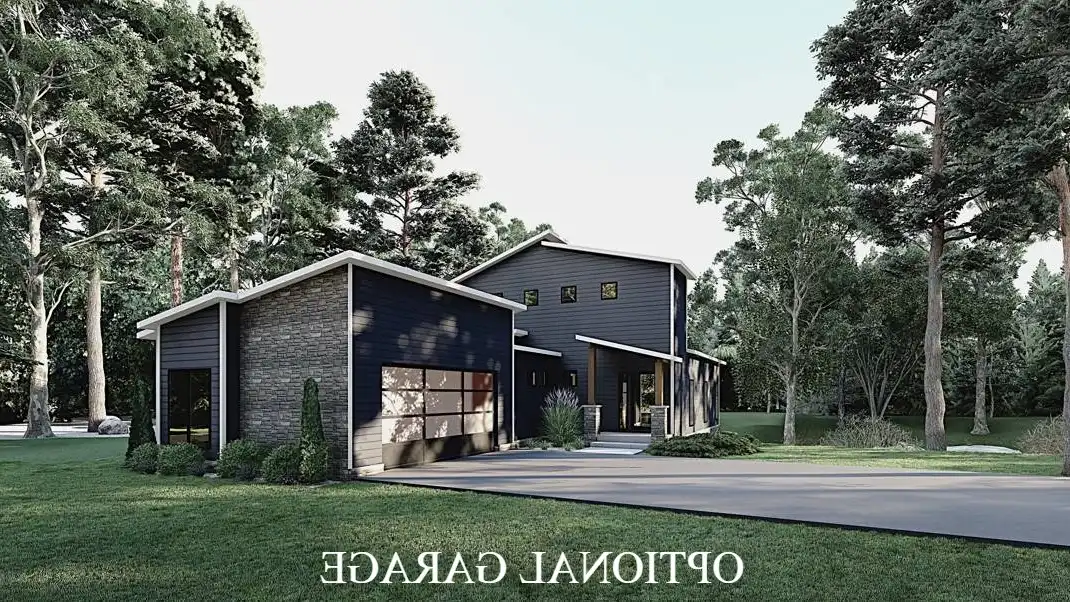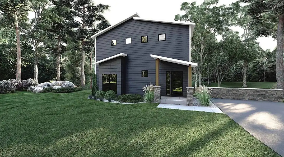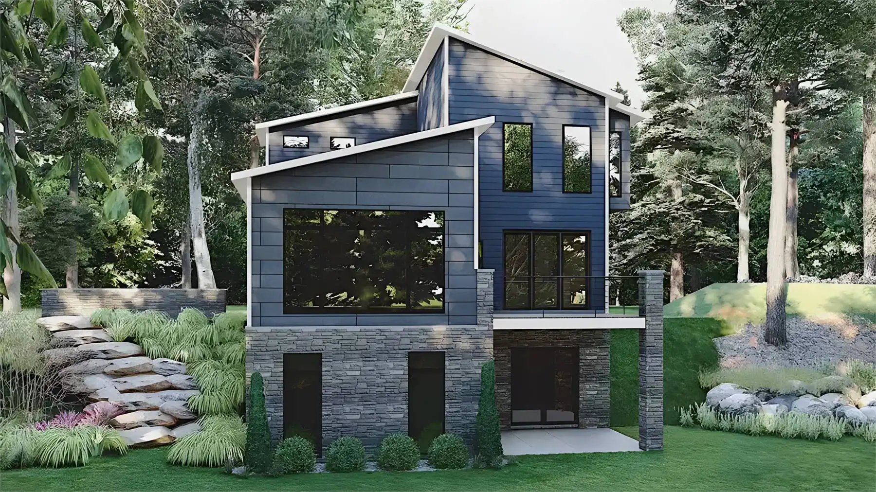 House Plan 11404 is an amazing contemporary home made to optimize a natural location! It's perfect for a narrow sloping lot and stacks 2,097 square feet with three bedrooms and two-and-a-half bathrooms across three levels--two stories and the finished basement. The main floor includes the island kitchen open to the living space, the formal dining area, a flex room, and the powder room. Upstairs, the primary suite has total privacy. The bedroom is surrounded by windows and there's a four-piece bath. Downstairs, you'll find two bedrooms, a bathroom, and the laundry. This design gives you the option to add a garage in front, if you want!