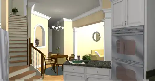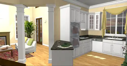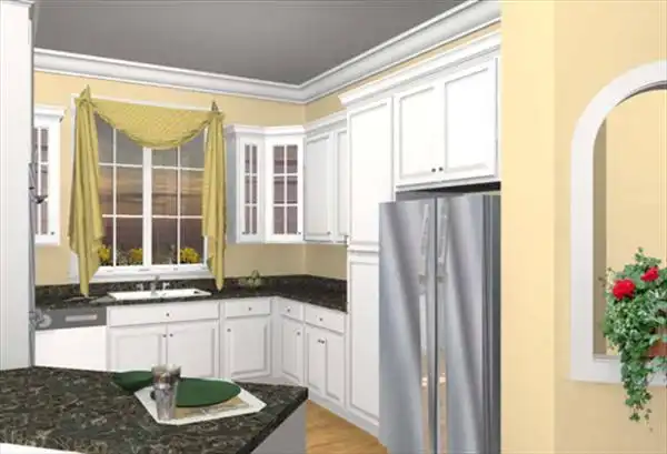 The Kitchen is highlighted with a view into the Great Room and lots of cabinet space. Two niches offer unique angles and extra storage around the angled stairs.