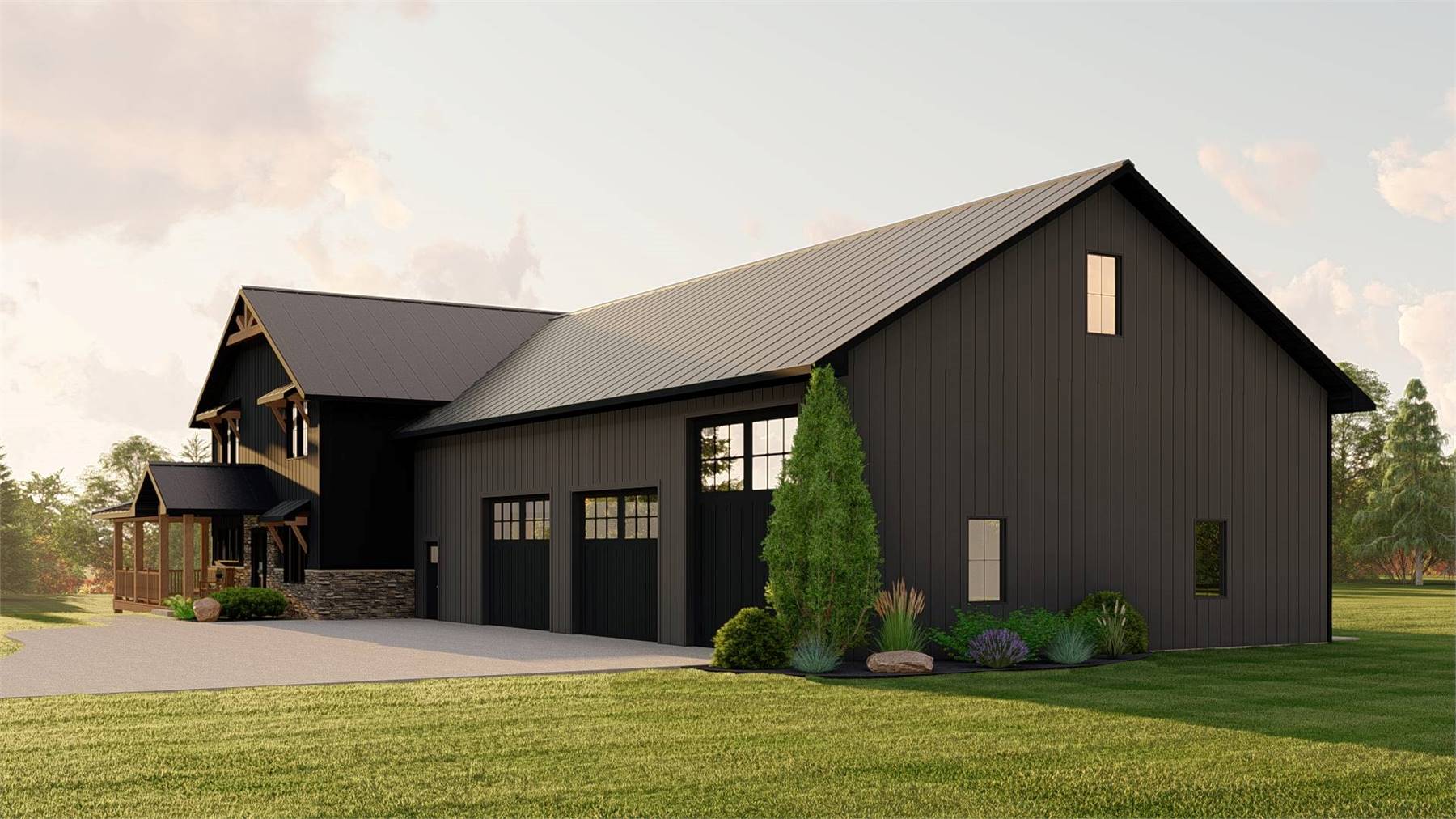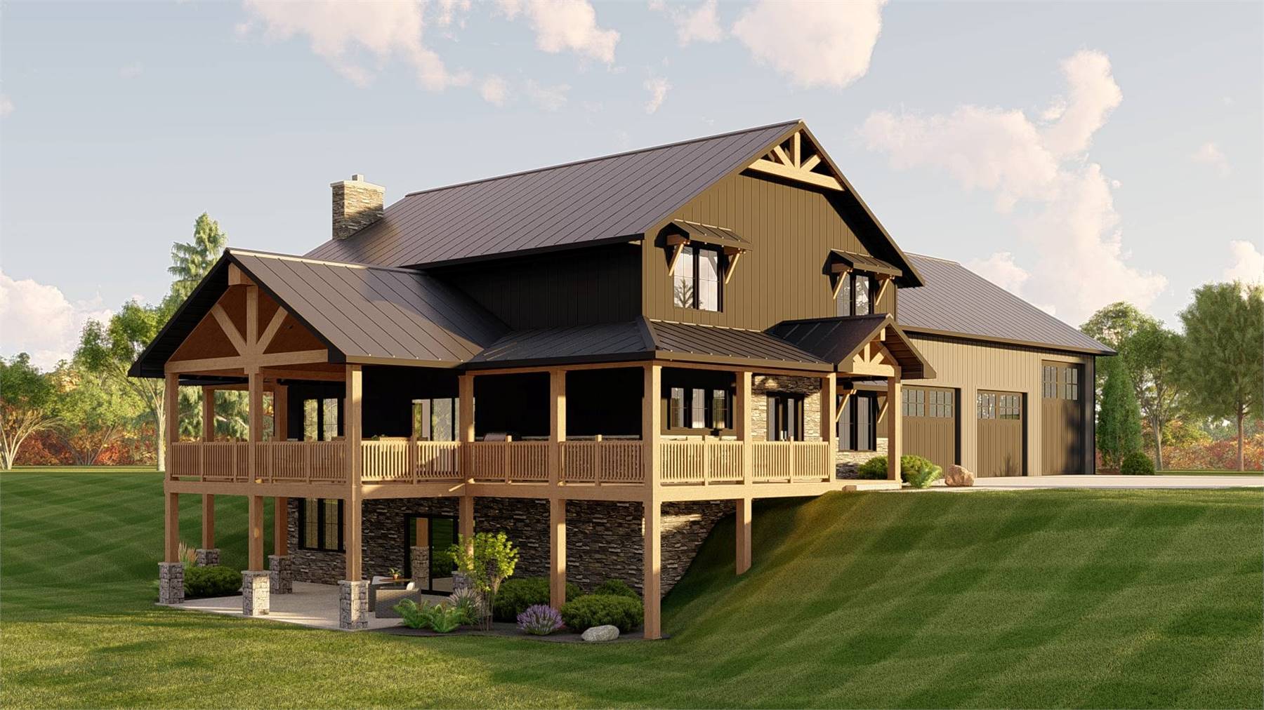 House Plan 11443 combines modern farmhouse character with flexible barndominium design. The open kitchen, dining, and living room feature soaring ceilings and a cozy flow ideal for entertaining. The primary suite offers privacy and luxury with a spa-style bath, walk-in closet, and direct access to the sunroom. Upstairs, two bedrooms, a full bath, and a loft provide plenty of family or guest space, while the bonus room can adapt to your lifestyle. The optionally finished lower level adds over 1,900 sq. ft. of flexible space including an additional bedroom, wet bar, and office. With expansive outdoor decks, a wraparound porch, and a 2,200 sq. ft. garage and shop, this home offers the perfect blend of style, function, and comfort.