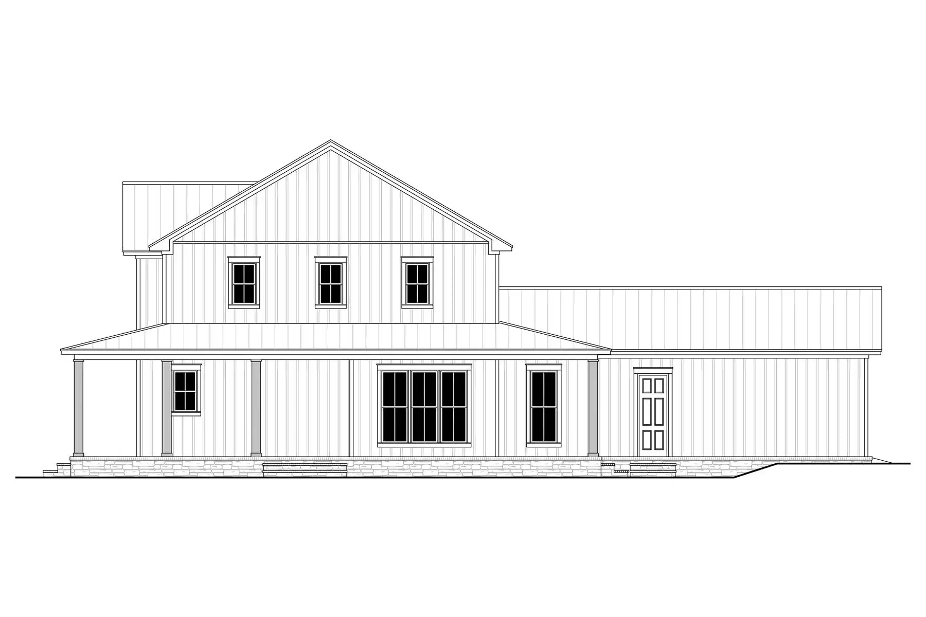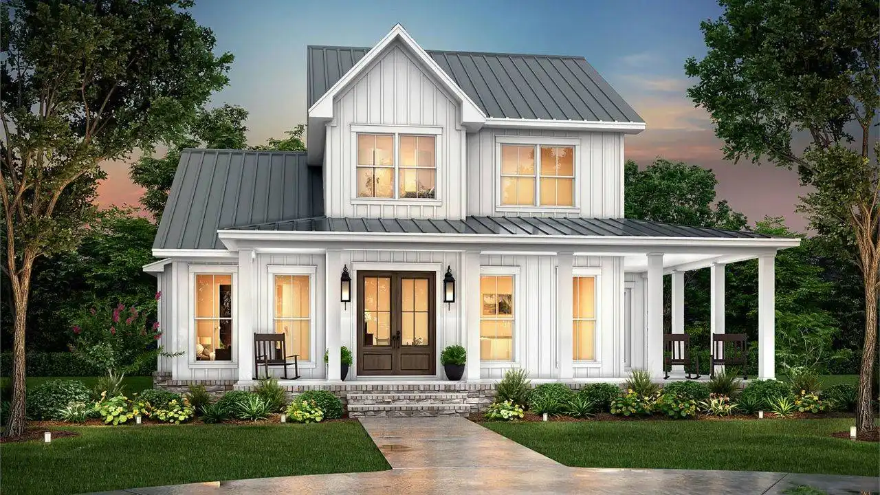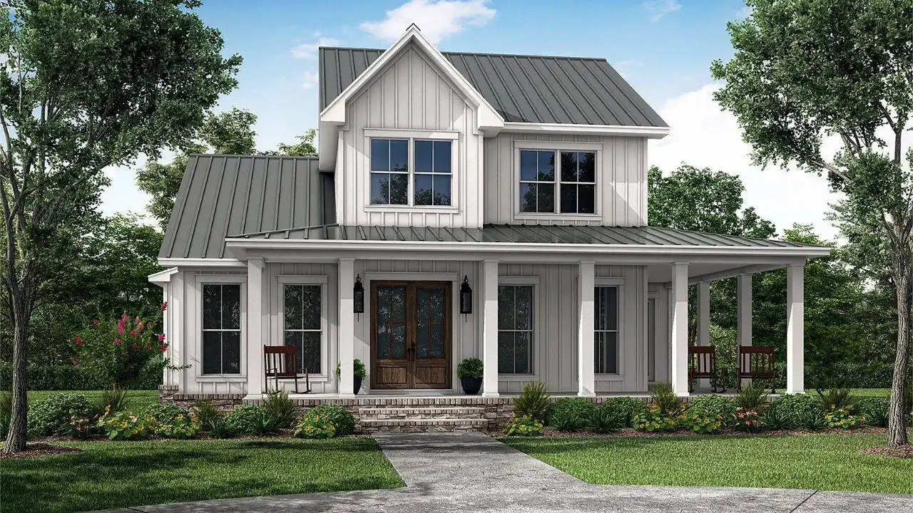 House Plan 11449 blends modern farmhouse character with family functionality across 2,628 square feet of living space. The exterior showcases board-and-batten siding, metal roofing, and a charming wraparound porch. Inside, the open kitchen and great room create a welcoming heart of the home, complete with a large island, built-ins, and easy access to the dining area and porches. The main-level primary suite includes a custom shower, dual sinks, and a generous walk-in closet, while an additional bedroom and bath offer flexibility. Upstairs, two bedrooms, a full bath, and a loft create a comfortable secondary living zone. With porches on three sides and thoughtful details throughout, this farmhouse offers beauty, comfort, and lasting appeal.