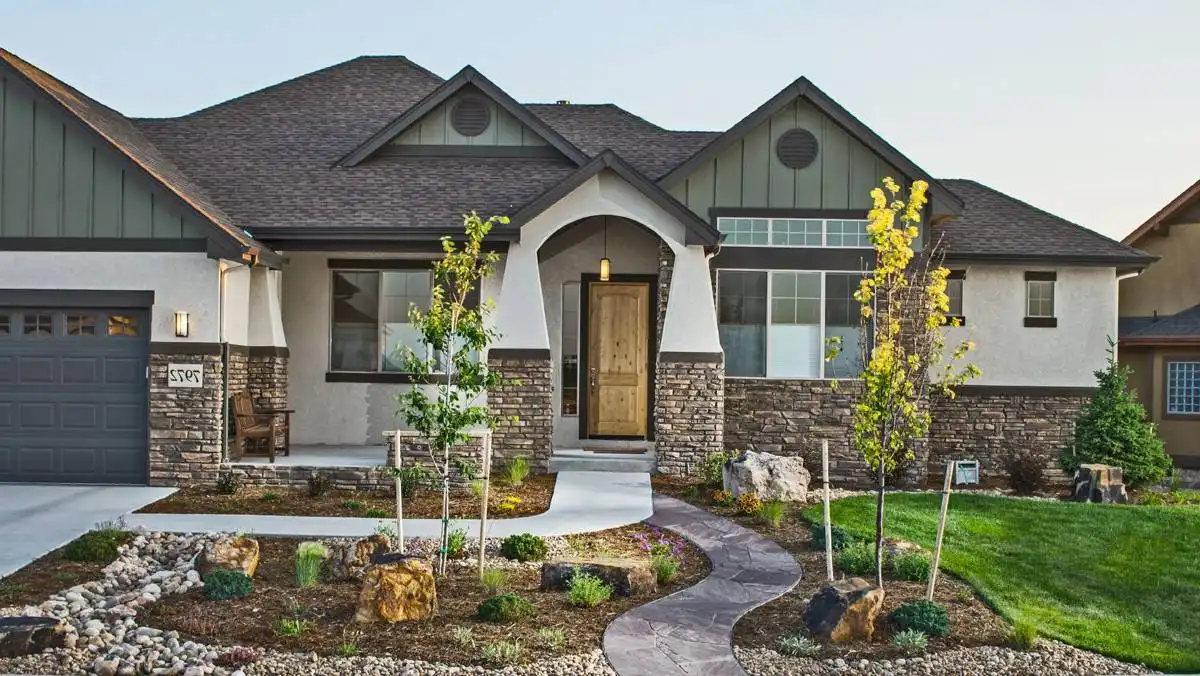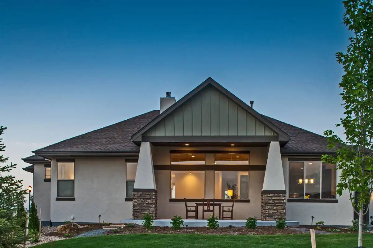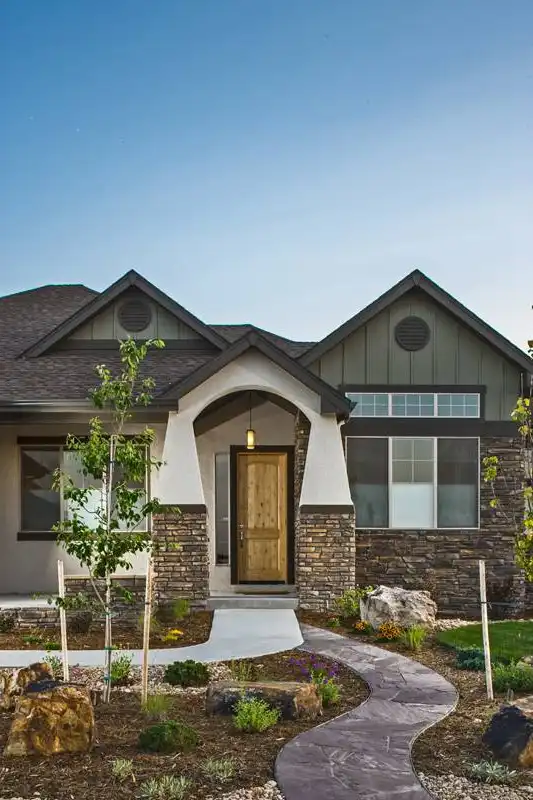 Blending charm with modern comfort, this 2,350 square foot Craftsman Ranch is perfect for both everyday living and entertaining. The inviting facade features stone accents, stucco details, and a gabled porch supported by classic tapered columns. A front study adds flexibility for a home office, while the open-concept great room and kitchen create the heart of the home. The primary suite includes patio access, a deluxe bathroom with private commode, and a roomy walk-in closet. Secondary bedrooms are grouped together, offering convenience for children or guests. Functional touches include a mudroom with storage, a laundry room with utility sink, and direct garage entry. The optional lower level adds 1,500 square feet with a spacious living area, wet bar, and two bedrooms. With its thoughtful layout and Craftsman styling, this home offers comfort and versatility for years to come.