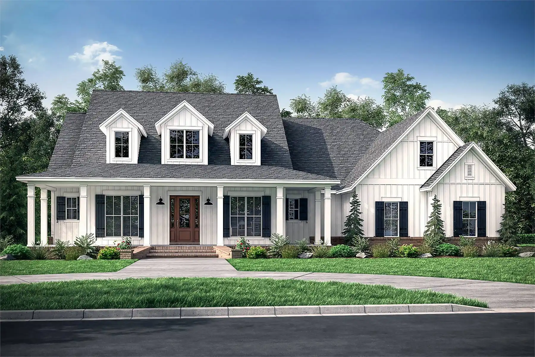 House Plan 11479 blends modern farmhouse charm with a warm, open layout. The great room flows effortlessly into the kitchen and dining spaces, creating a bright central hub for gatherings. A walk-in pantry and large island make the kitchen both functional and stylish, while the nearby covered porch invites outdoor enjoyment. The main-floor primary suite features a spa-like bath and generous walk-in closet, thoughtfully separated from the secondary bedrooms for extra privacy. With 4 bedrooms on one level, the home offers convenience and easy daily living. Upstairs, a spacious bonus room provides the perfect flex option—ideal for a hobby room, guest suite, or future 5th bedroom. A 3-car garage, mudroom, and efficient traffic flow complete this family-focused design.
