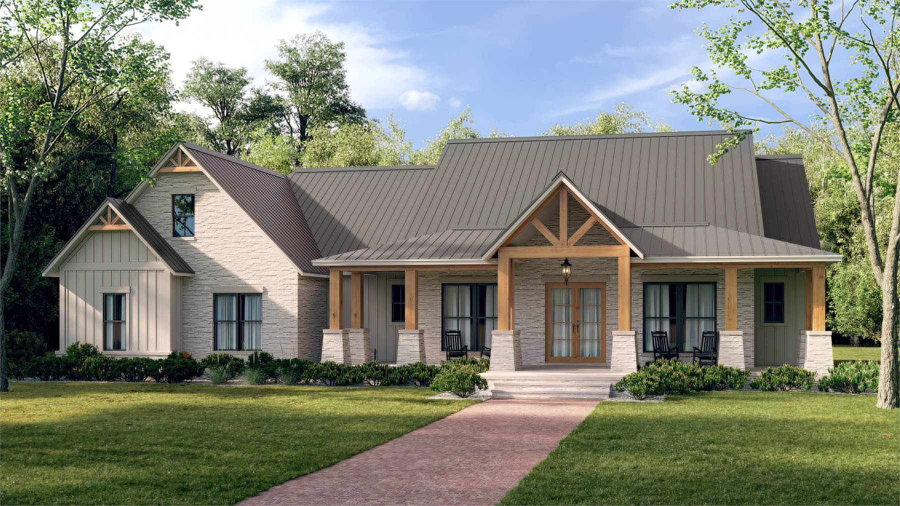 Take a look at House Plan 11480 if you're in the market for a lovely ranch for your growing family! This rustic design offers 2,961 square feet with four bedrooms and three-and-a-half baths in a split arrangement for privacy. In the middle of the floor plan, you'll find an office off the foyer and the open-concept great room in back with an island kitchen overlooking the sunny dining space and the vaulted living area. The five-piece primary suite is placed behind the three-car garage along with the mudroom, laundry room, and powder room while the hallway on the opposite side of the house hosts a smaller bedroom suite and two bedrooms that share a hall bath. Porches in front and back allow you to spread out into the fresh air. A bonus room over the garage adds flexibility, too!