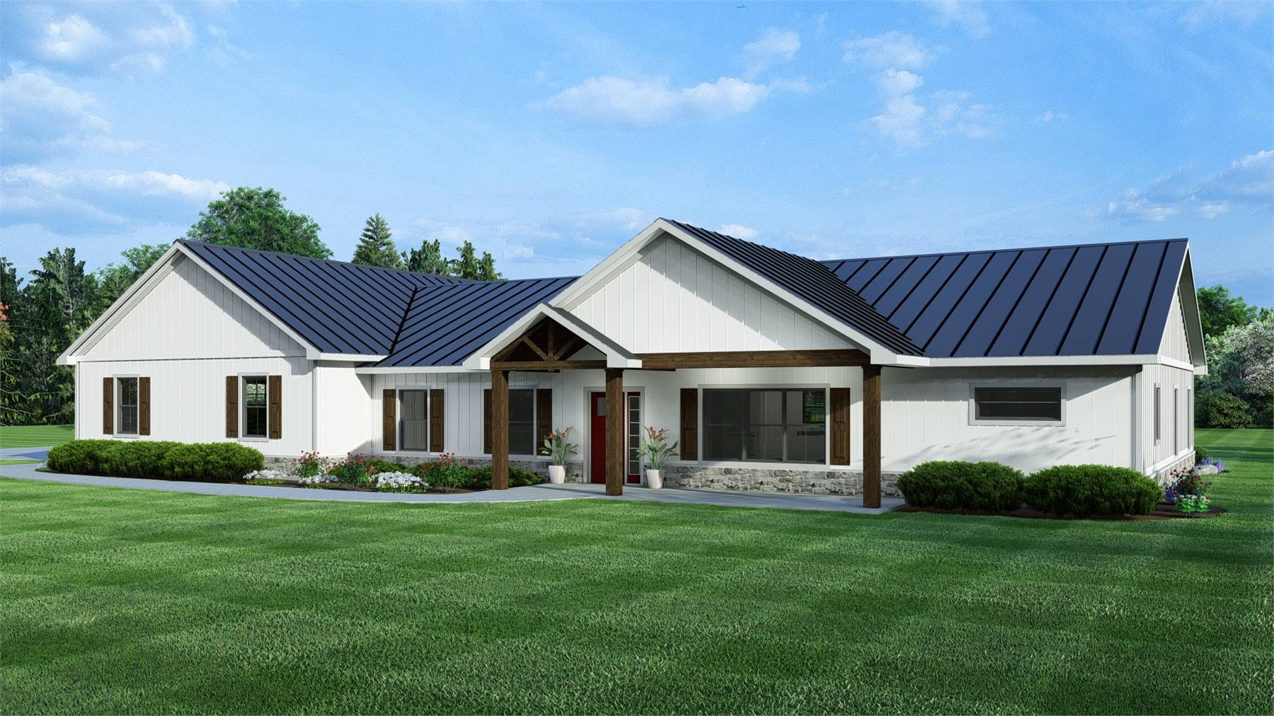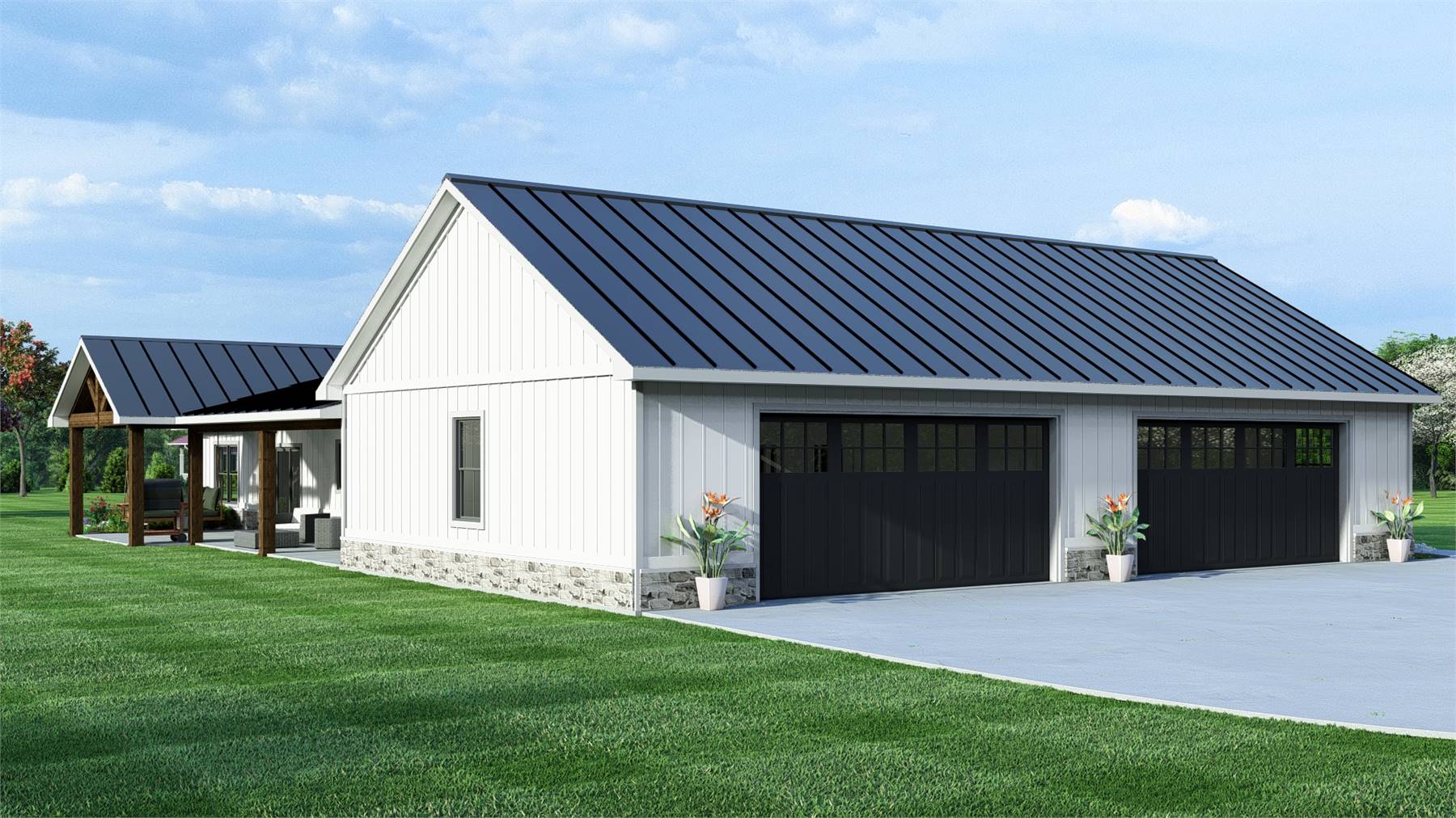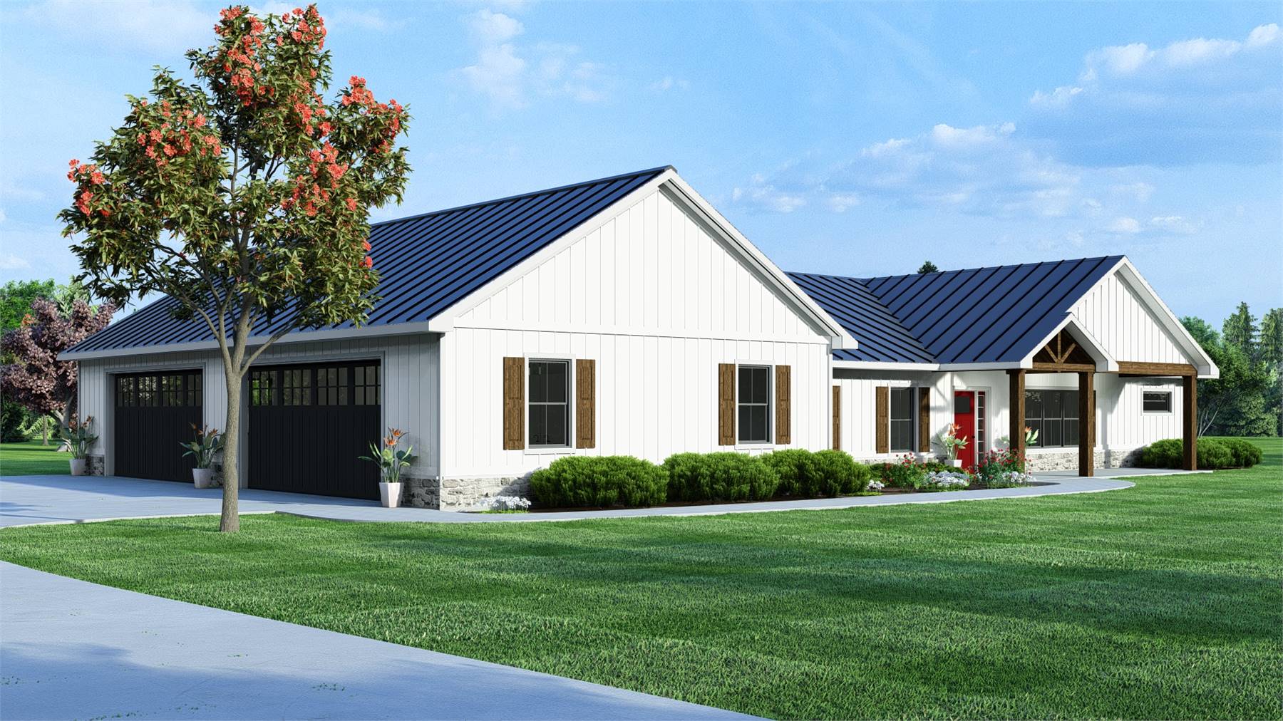 House Plan 11505 is a lovely ranch with 2,221 square feet, three bedrooms, and two-and-a-half bathrooms. The split-bedroom layout places the vaulted open-concept great room between the four-piece primary suite and the side hallway with the secondary bedrooms, the den, the laundry room, and the hall bath. Covered porches in front and back and a side-entry four-car garage with powder room complete this home.