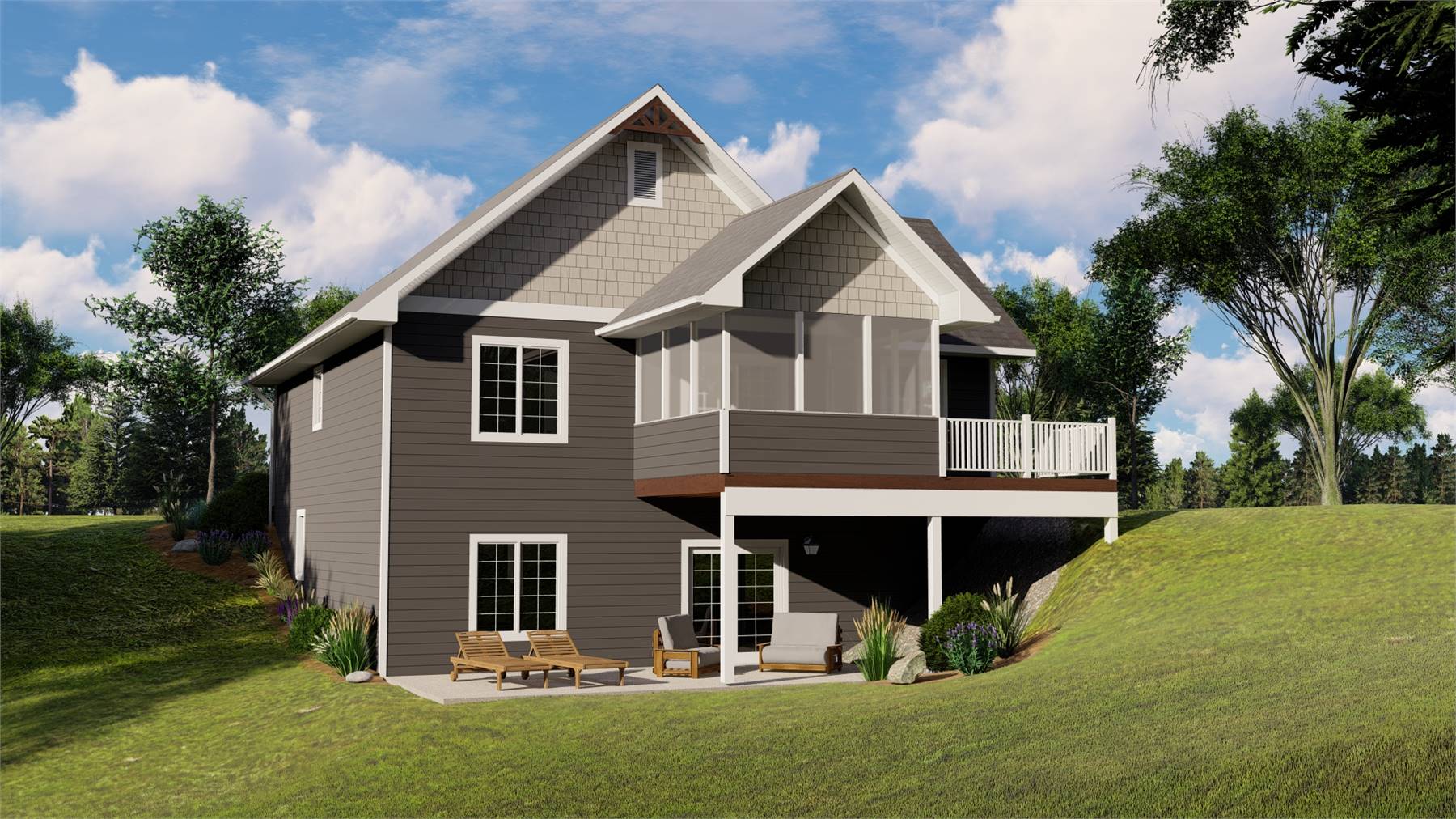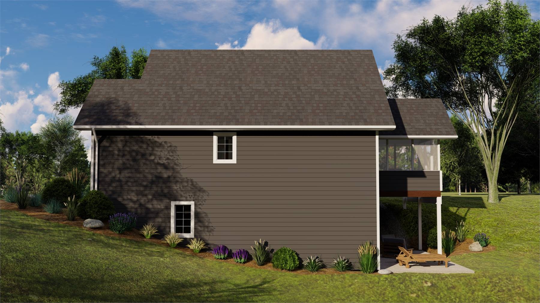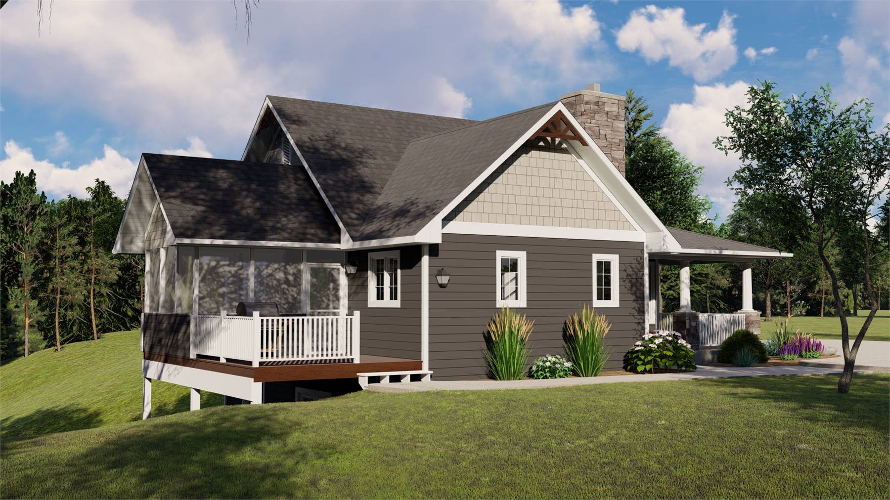 With 2,192 square feet of heated living space, this thoughtfully planned home delivers 2 bedrooms and 1.5 bathrooms in a well-balanced single-story design with a lower-level living area. The great room anchors the open floor plan, offering a spacious setting for gatherings and relaxation. A fireplace adds warmth and character, while the kitchen connects easily to the living areas with a breakfast nook, pantry, and peninsula eating bar. The primary suite on the main level provides convenience and comfort with a double vanity bath. Practical features like the mud room, first-floor laundry, and ample storage support easy living. Covered porches, a screened porch or sunroom, and a deck extend the living space outdoors. The result is a welcoming home designed for both comfort and connection.
