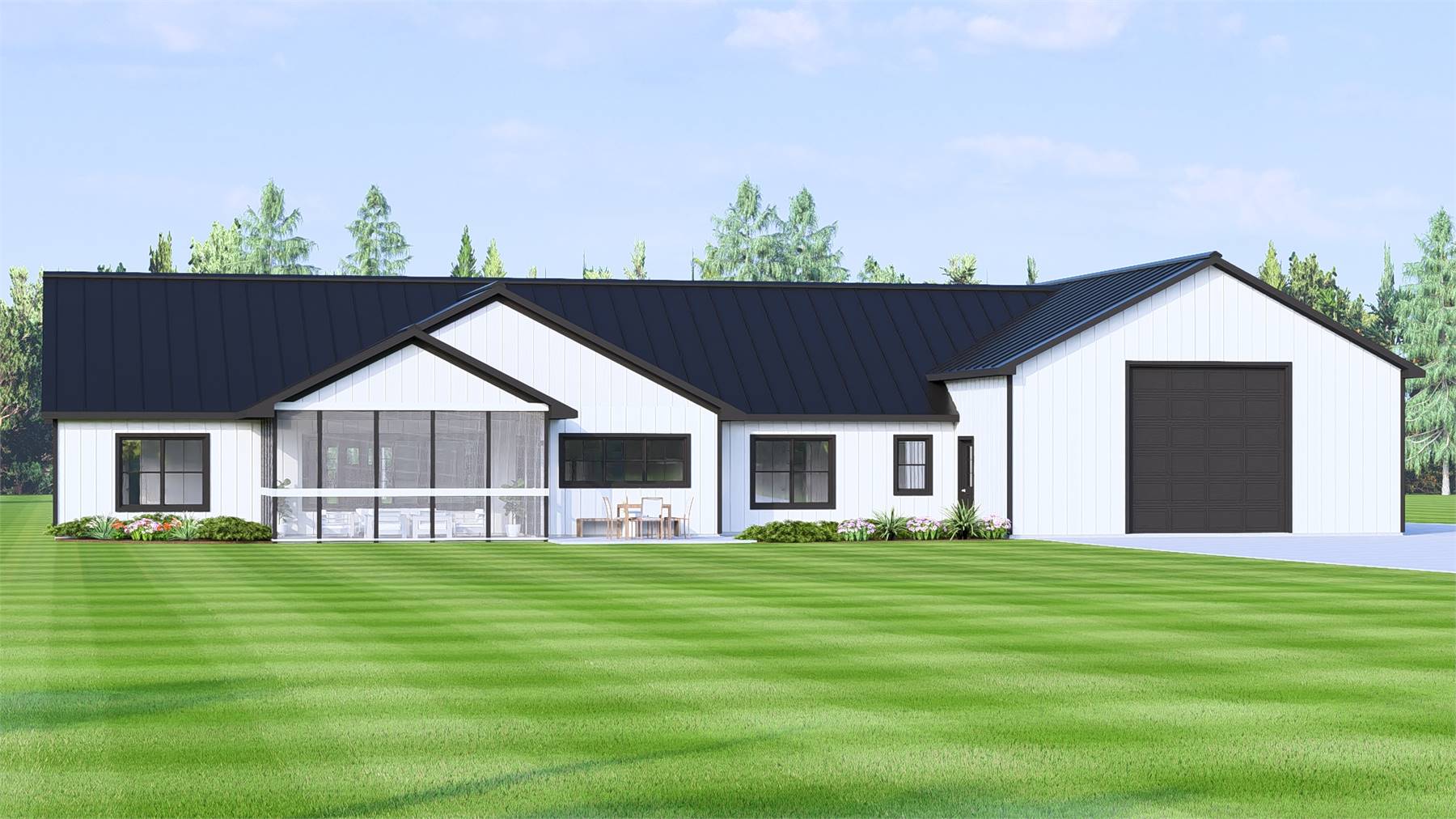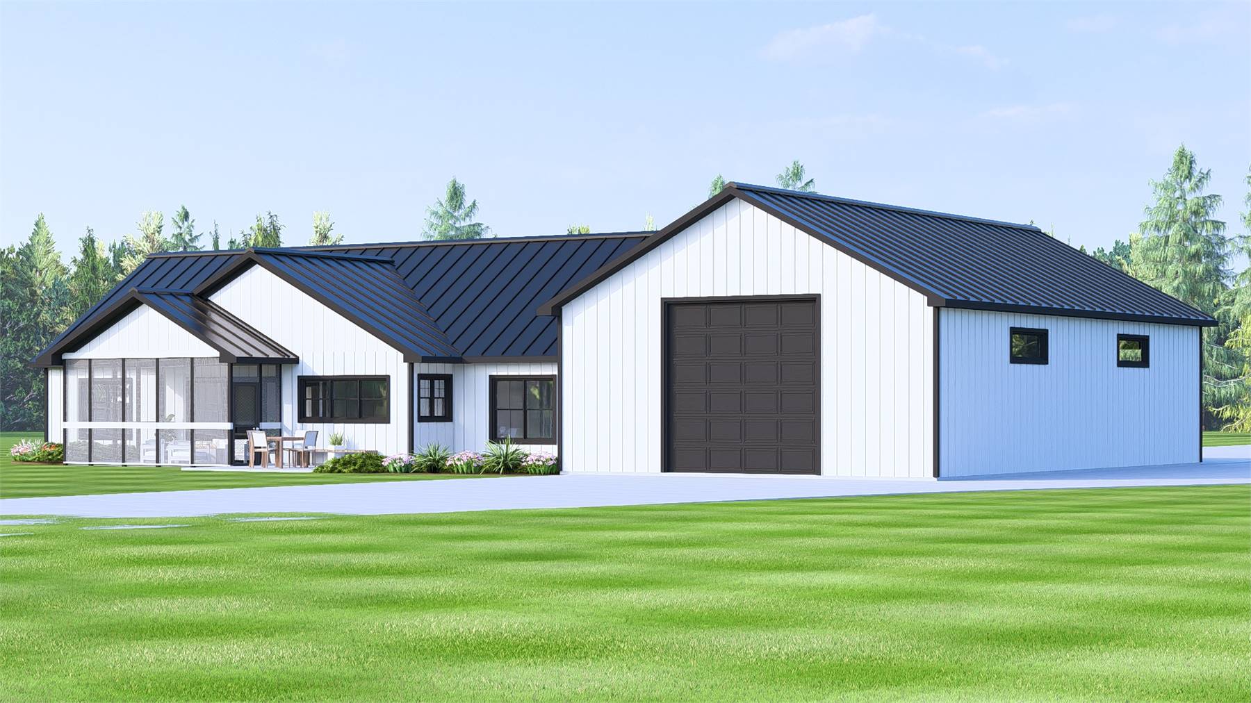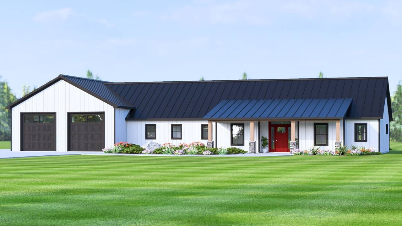 House Plan 11533 brings barndominium living to life with an open layout and smart use of space. This single-story design offers 2,054 sq. ft. of heated living area with 2 bedrooms, 2.5 baths, and a split-bedroom arrangement for privacy. The spacious great room connects to the dining area and kitchen, where an L-shaped counter, walk-in pantry, and center island enhance functionality. The primary suite enjoys rear views and a luxurious bath, while the guest or in-law suite includes a private full bathroom. A dedicated office provides a quiet workspace, and covered porches in the front and rear invite year-round outdoor living. With a screened porch, safe room, and oversized side-entry 2-car garage, this barndominium offers both comfort and peace of mind in a stylish, modern package.