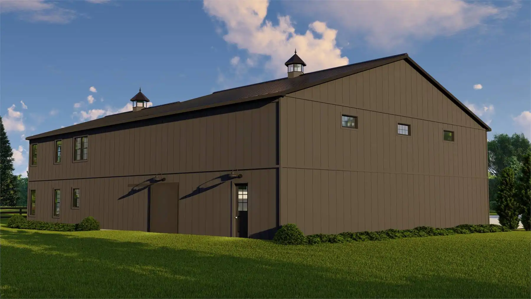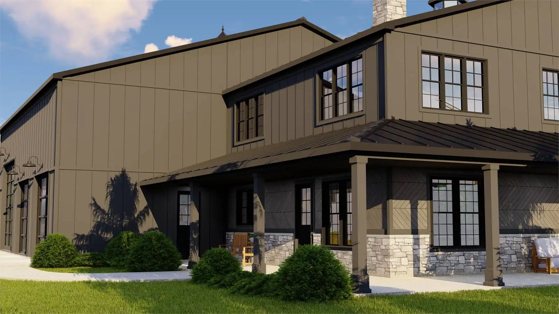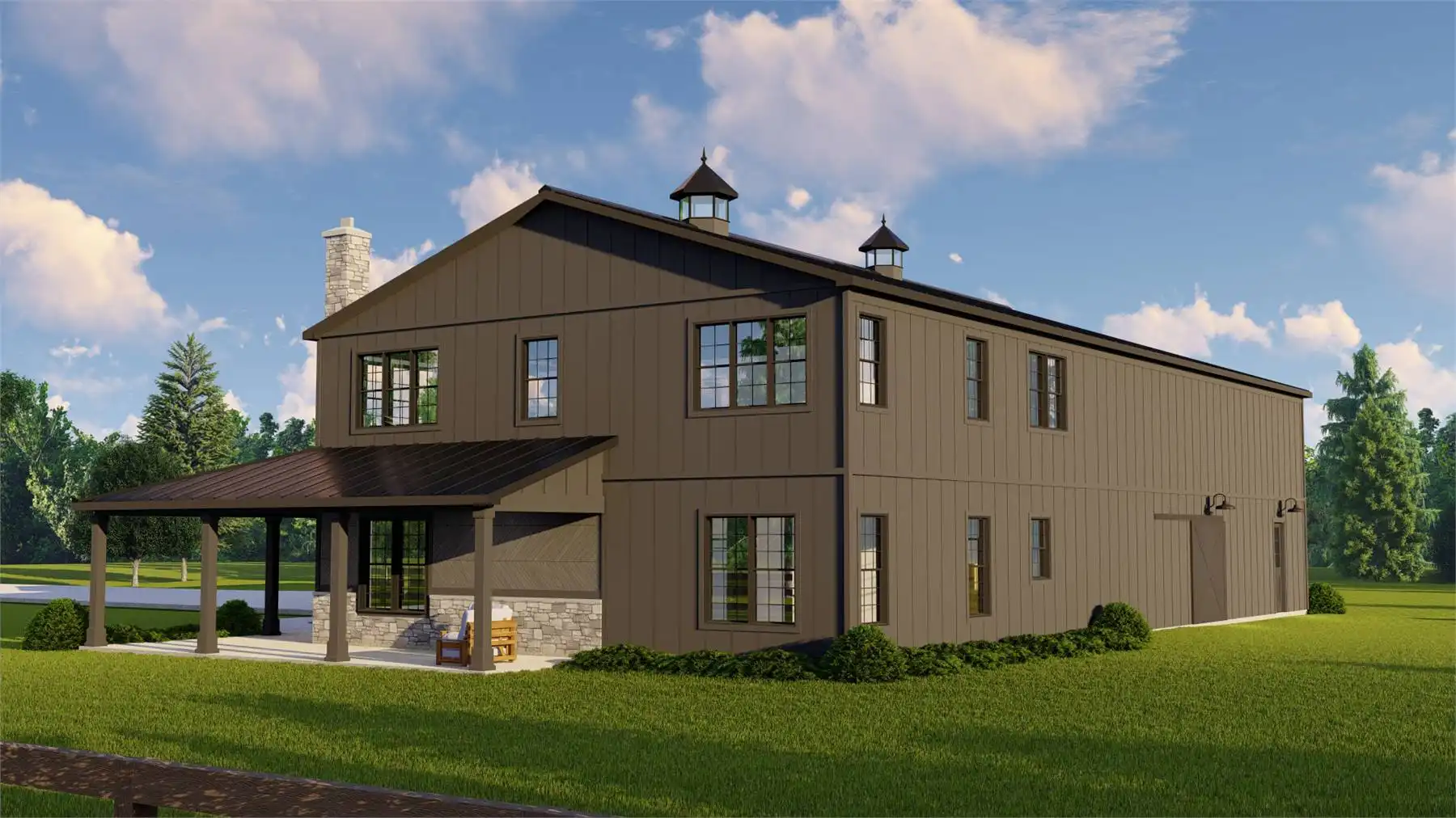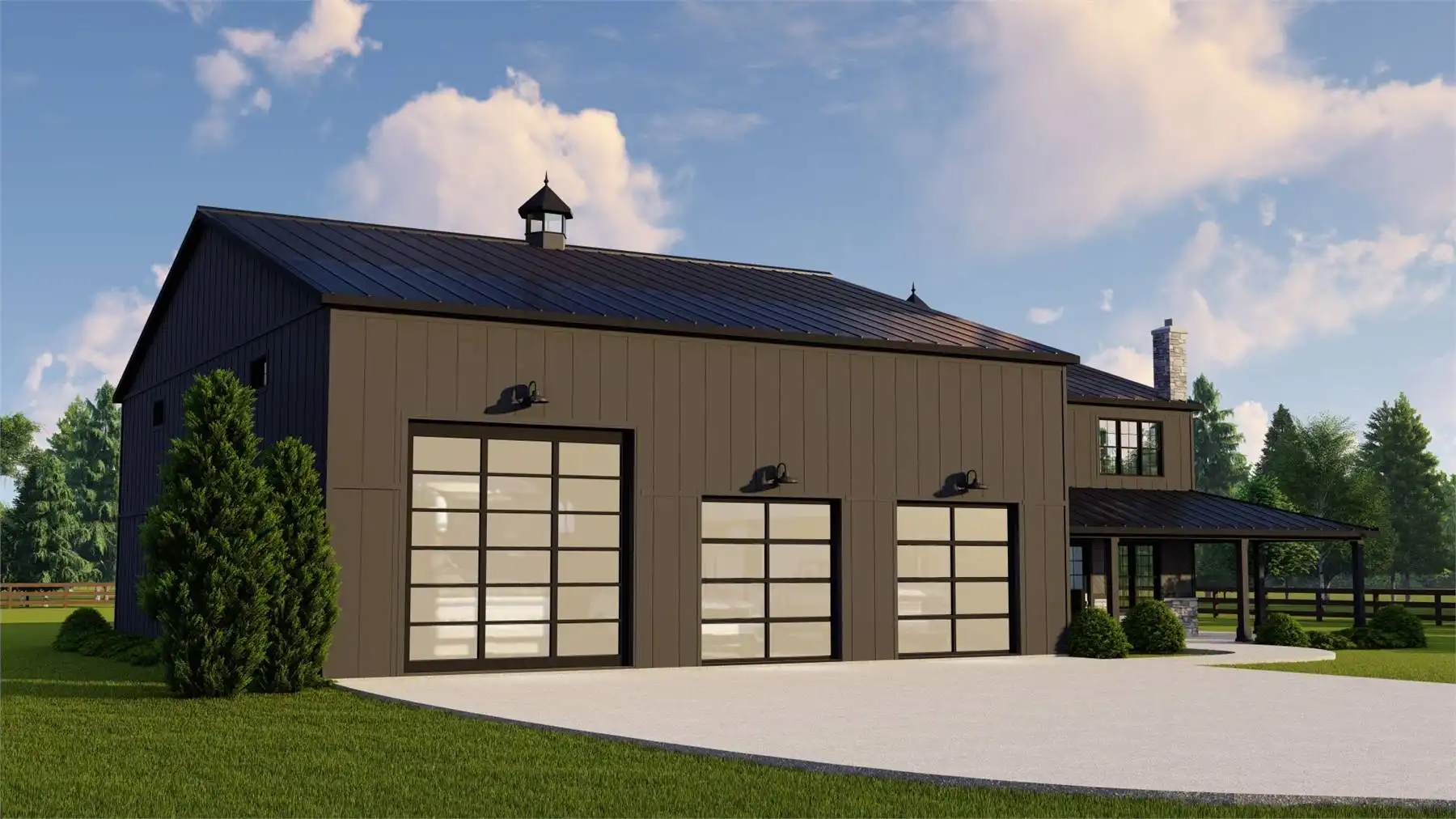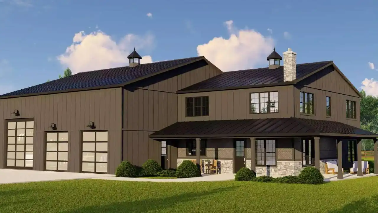 House Plan 11536 combines modern barndominium style with craftsman detailing for a striking two-story home designed for both comfort and utility. Featuring 2,293 sq. ft. of living space and a massive 3,030 sq. ft. garage, this design caters to RV owners, hobbyists, and families who need room to grow. The main level boasts a spacious primary suite, laundry room, and open kitchen-to-living layout that connects seamlessly to outdoor living areas. Upstairs, a loft and two bedrooms offer privacy and storage. With a wraparound porch and classic metal roof accents, this plan is ideal for modern country estates and multi-purpose living.