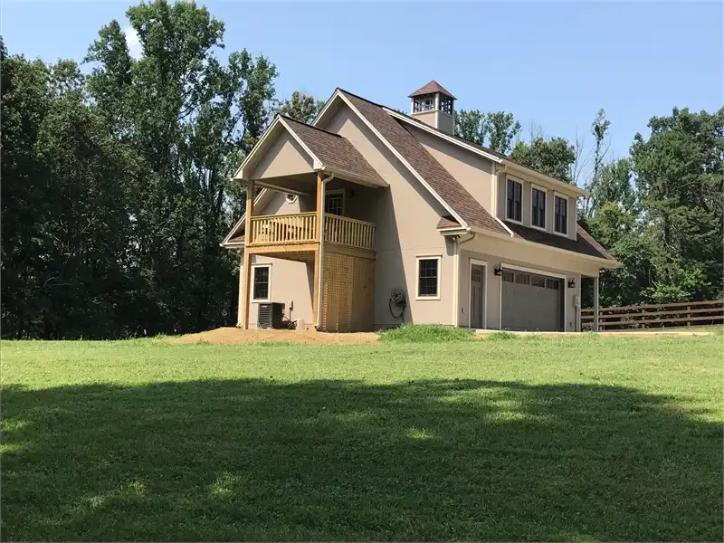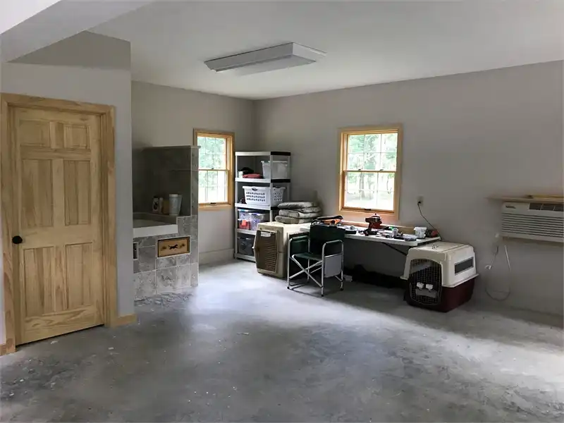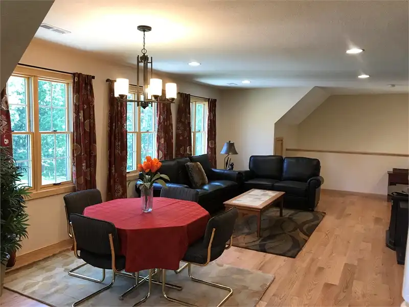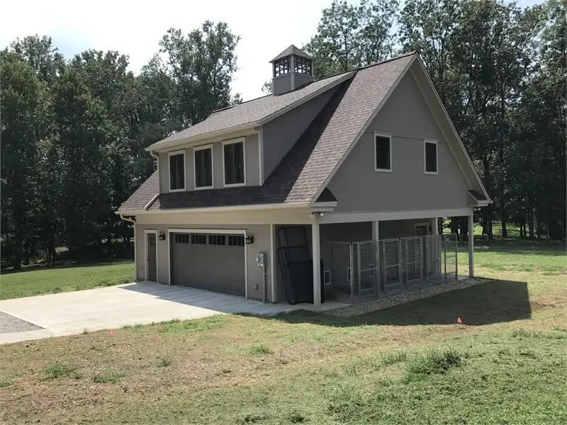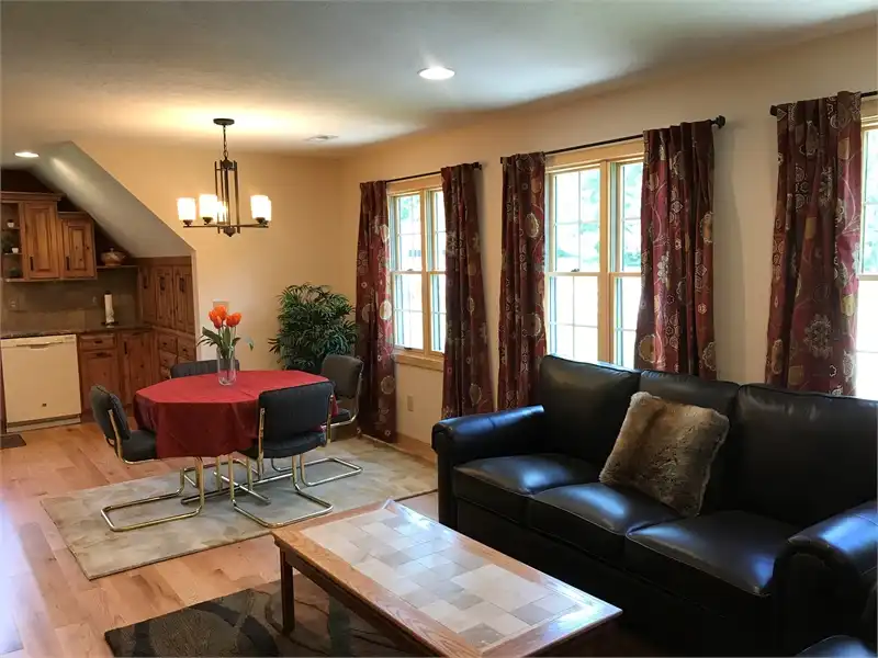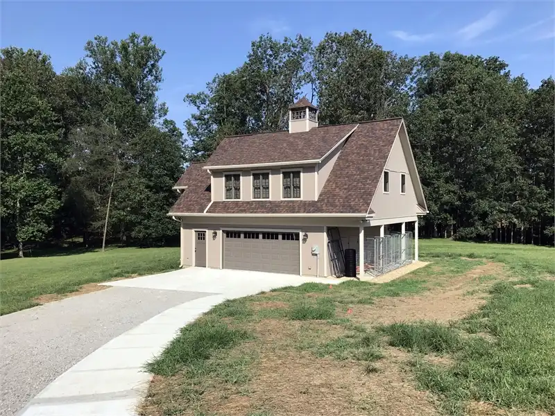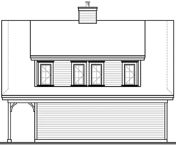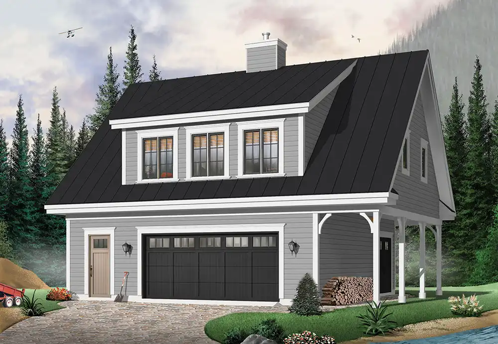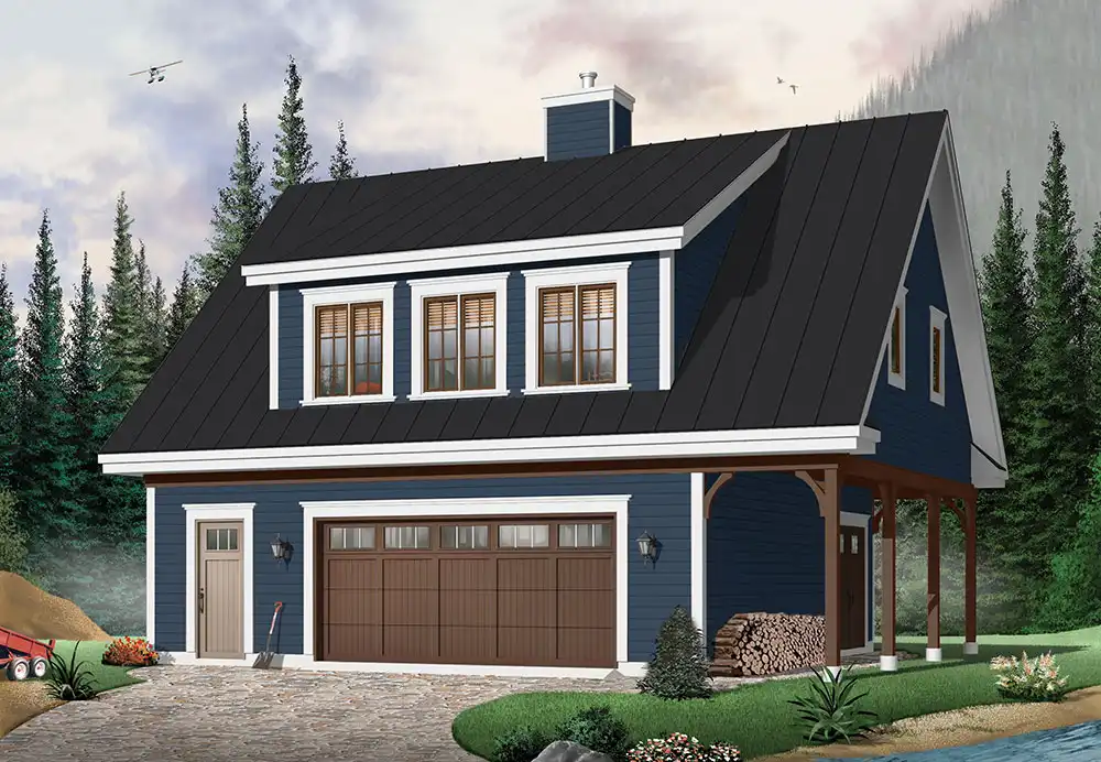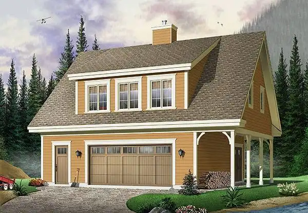 This garage plan gains a bungalow feel, because of its two shed dormers. On the upper level lies a sizable apartment. A fireplace warms the family room, and the U-shaped kitchen serves the versatile dining area.