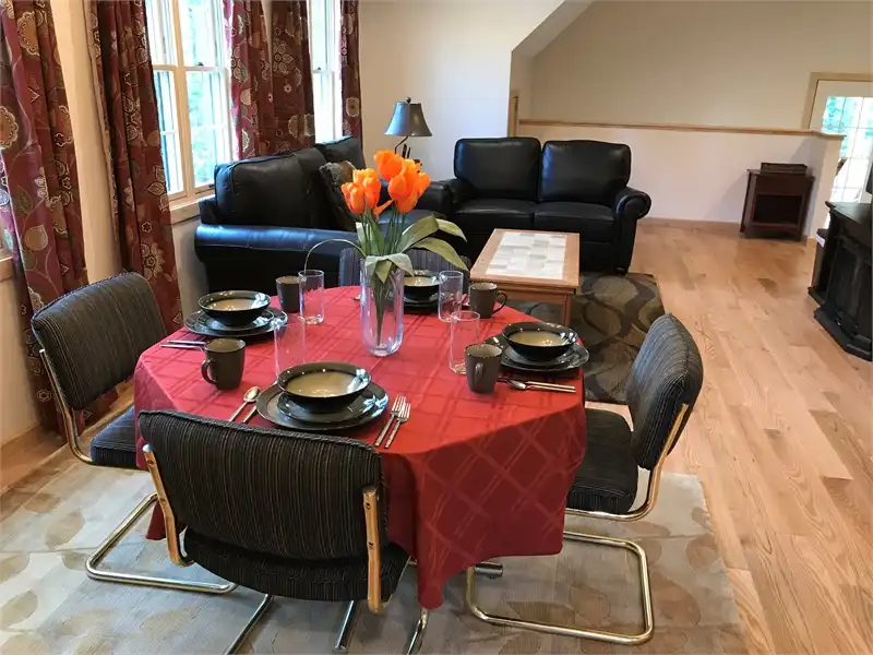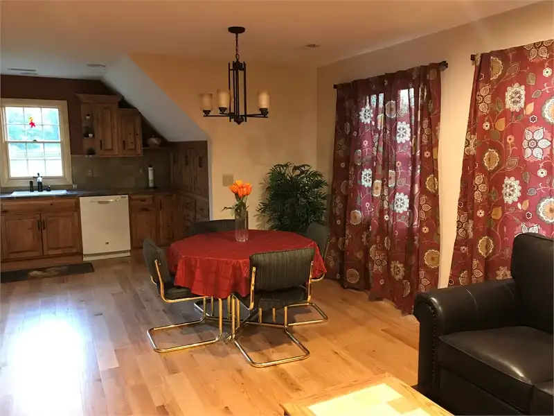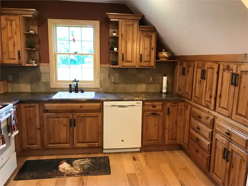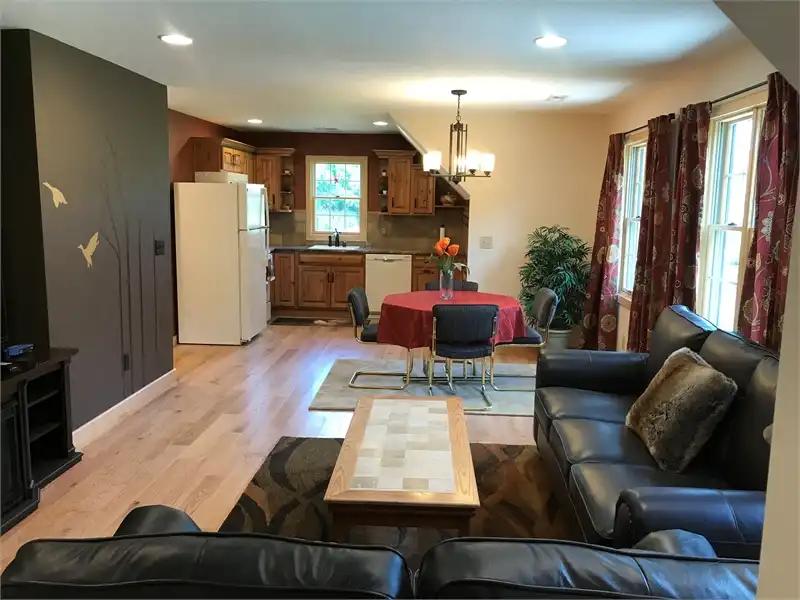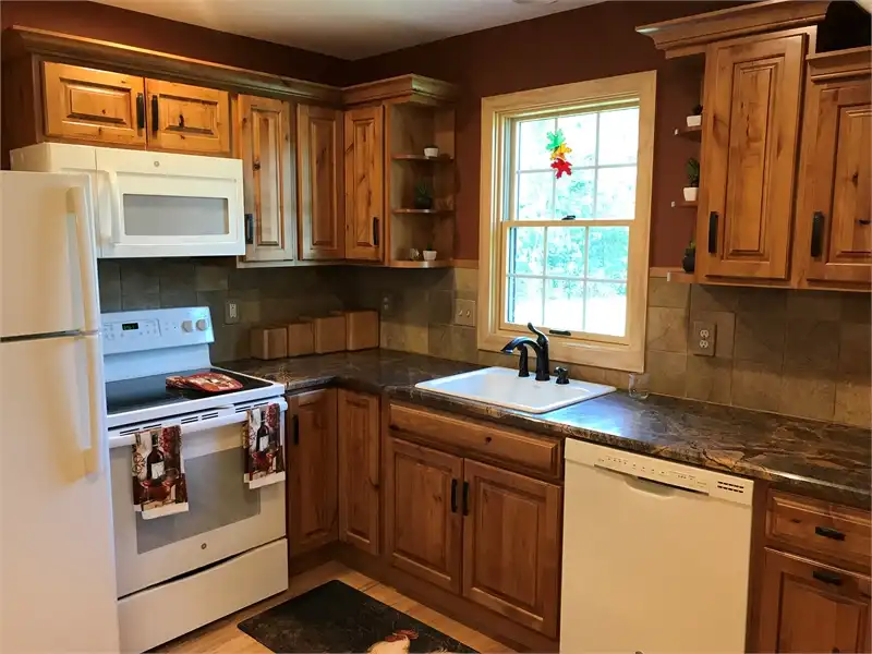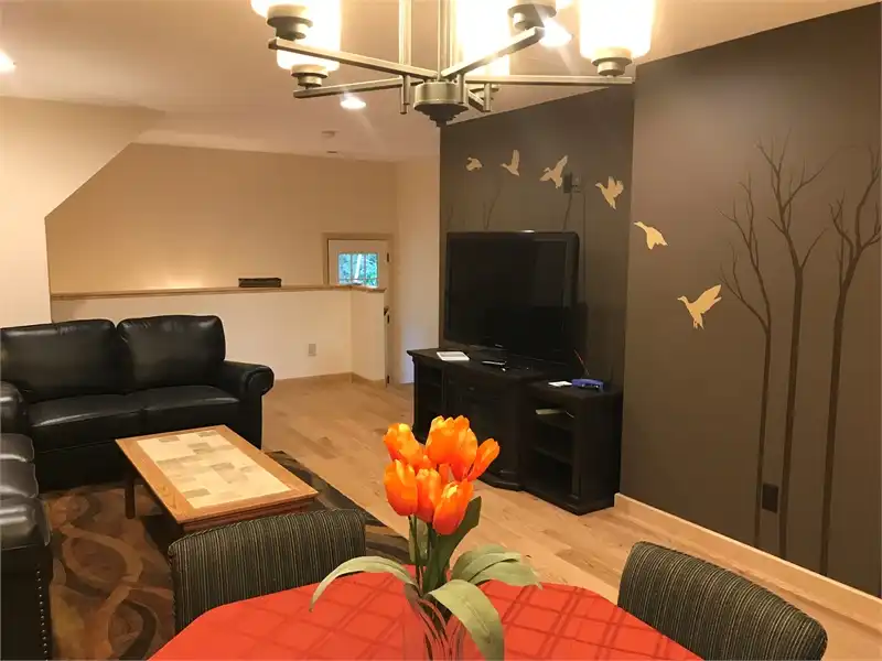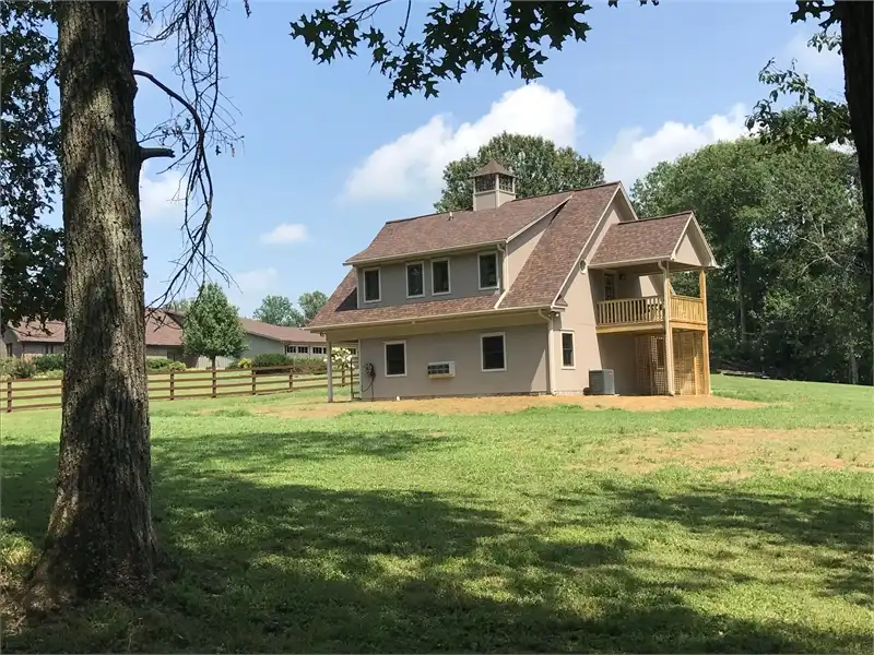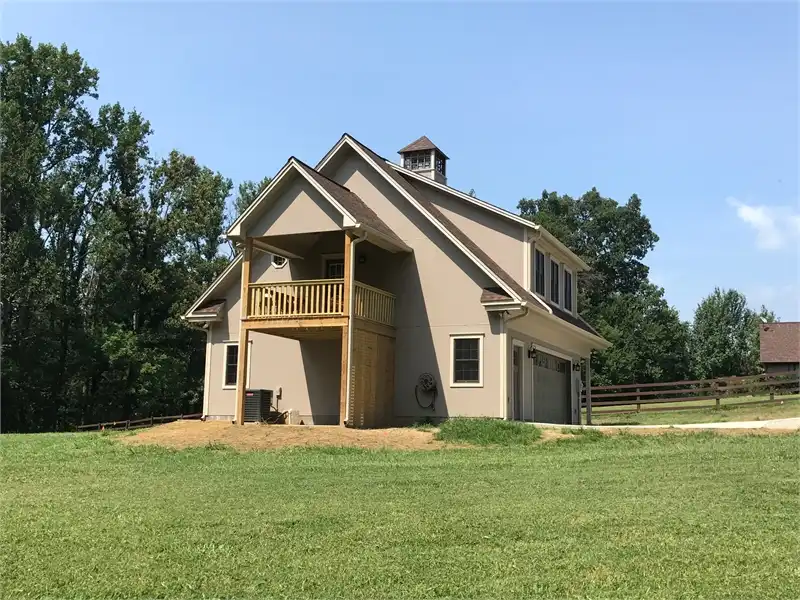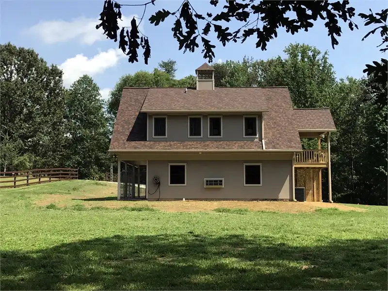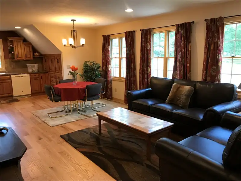 This garage plan gains a bungalow feel, because of its two shed dormers. On the upper level lies a sizable apartment. A fireplace warms the family room, and the U-shaped kitchen serves the versatile dining area.