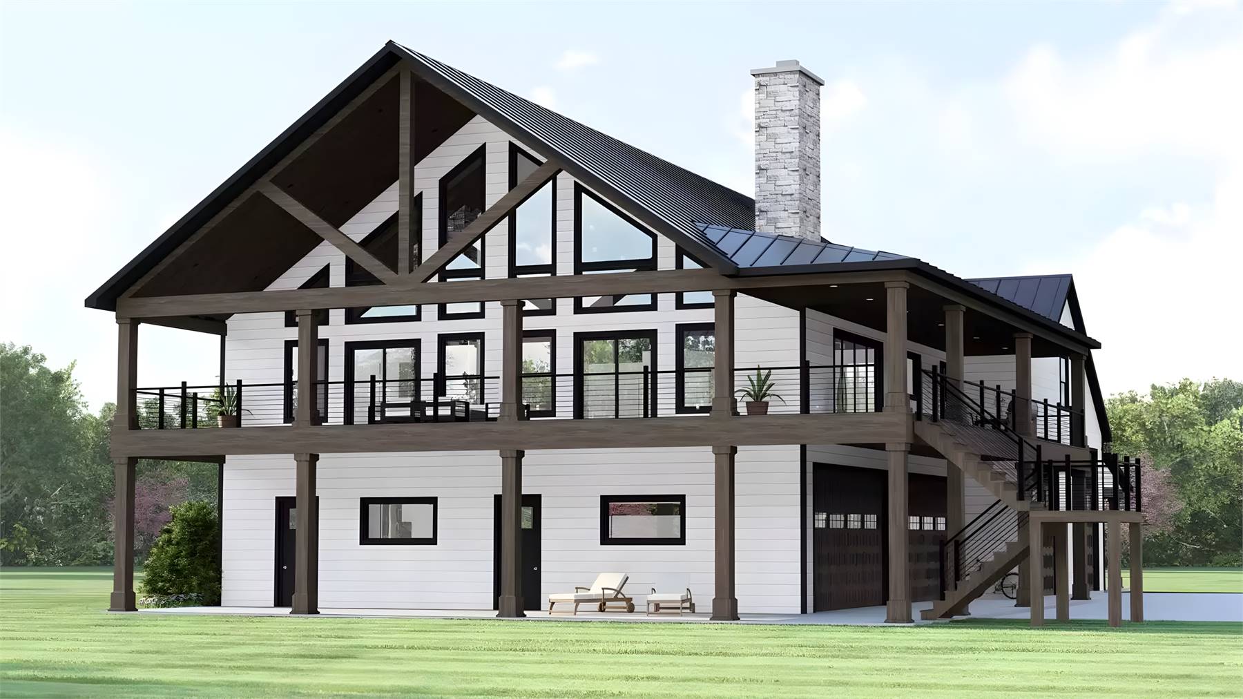 House Plan 11540 is an outstanding home for a view lot! This 2,550-square-foot lake house with three bedrooms and three bathrooms places almost all of the finished space on the second floor, over the six-vehicle garage with room for four cars and two RVs. Talk about a great vacation home or homebase! In the garage level, you'll also find a workshop, a full bathroom, the laundry room with additional fridge and freezer space, and a safe room. Head upstairs to find the living level with vaulted ceilings across the great room and all bedrooms. The great room has an open layout with an island kitchen and a cozy corner fireplace. The primary suite has a two-sided fireplace between the bedroom and five-piece bath. The living area and primary bedroom are placed behind floor-to-ceiling windows to take in the best views! The other bedrooms and a hall bath to share are in back. If you need more storage space, just look at that huge attic over the RV garage!