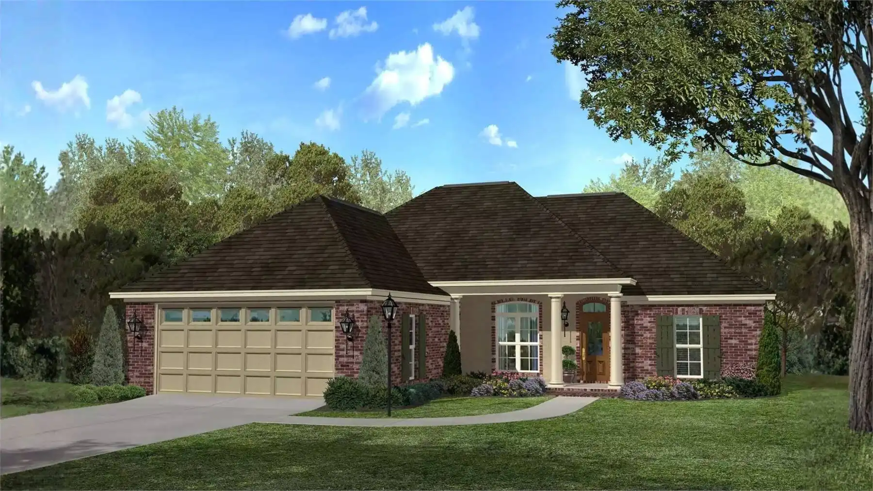 Designed with comfort and functionality in mind, this home features 1,700 square feet of heated living space and an easy-flowing layout. The great room opens directly to the dining area and kitchen, allowing the open floor plan to feel bright and connected. A fireplace creates a cozy focal point while maintaining an open connection to surrounding spaces. The kitchen’s U-shaped design includes a peninsula eating bar and breakfast nook, ideal for casual meals and conversation. The primary bedroom is privately located on the main floor and offers a walk-in closet, double vanity, and a separate tub and shower. Two additional bedrooms are positioned away from the primary suite, providing privacy for family or guests. Covered porches, ample storage, and a practical mud room complete this warm and livable home design.