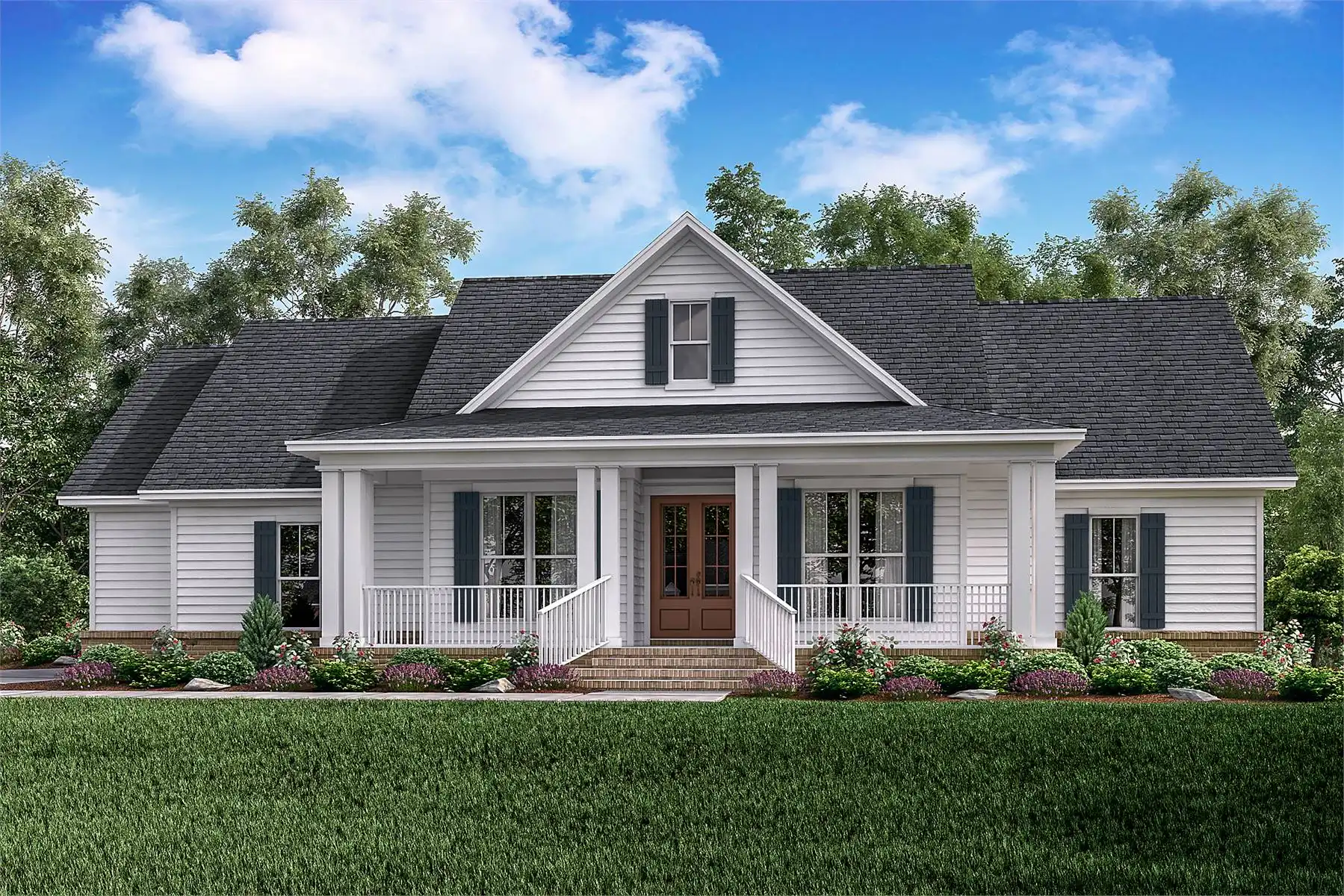 House Plan 11612 captures the charm of a classic country farmhouse with modern function and simplicity. A generous front porch sets the tone, leading into an open layout centered around the great room, breakfast nook, and kitchen. The primary suite features dual walk-in closets and a private bath with split vanities, while two secondary bedrooms are positioned on the opposite side of the home for added privacy. The formal dining room off the foyer adds flexibility for hosting or everyday meals. A mudroom with lockers and main-level laundry help keep the home organized. Step outside to enjoy the rear porch and grilling porch, offering natural flow for outdoor dining and relaxation. The side-entry two-car garage completes this efficient and welcoming design.