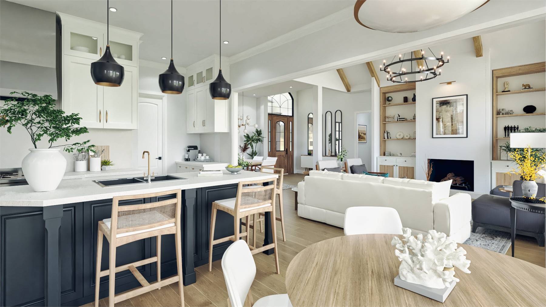 House Plan 11624 is a thoughtfully designed one-story country ranch with inviting style and functional flow. The heart of the home is the grand lodge room, showcasing a vaulted ceiling and cozy fireplace, creating the perfect spot for gatherings. The kitchen offers efficient prep space, a pantry, and direct connection to both the dining room and breakfast area. A split-bedroom layout places the primary suite privately away from the secondary bedrooms for added comfort. Enjoy seamless indoor-outdoor living with a covered patio and an option to screen it in for year-round enjoyment. The angled two-car garage adds architectural interest and practical entry to the mudroom and kitchen. The optional bonus room above provides room to grow, whether used as a hobby space, guest retreat, or family hangout.