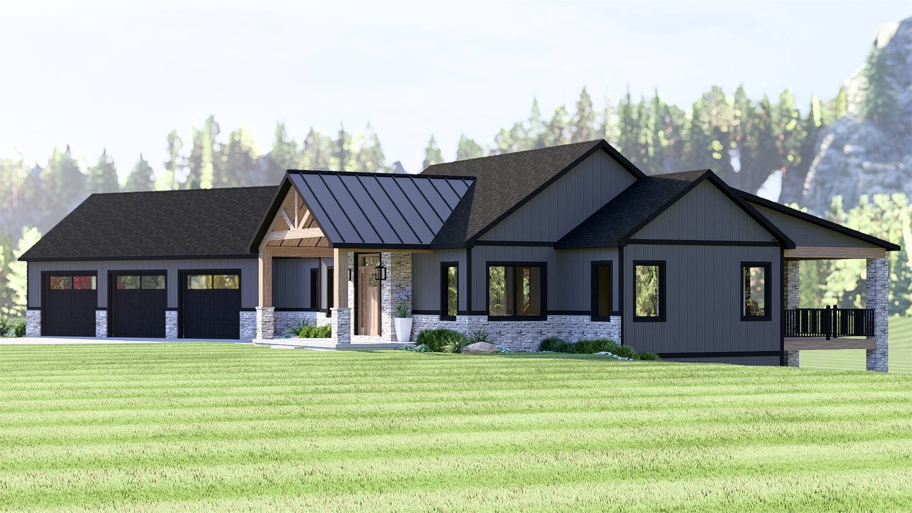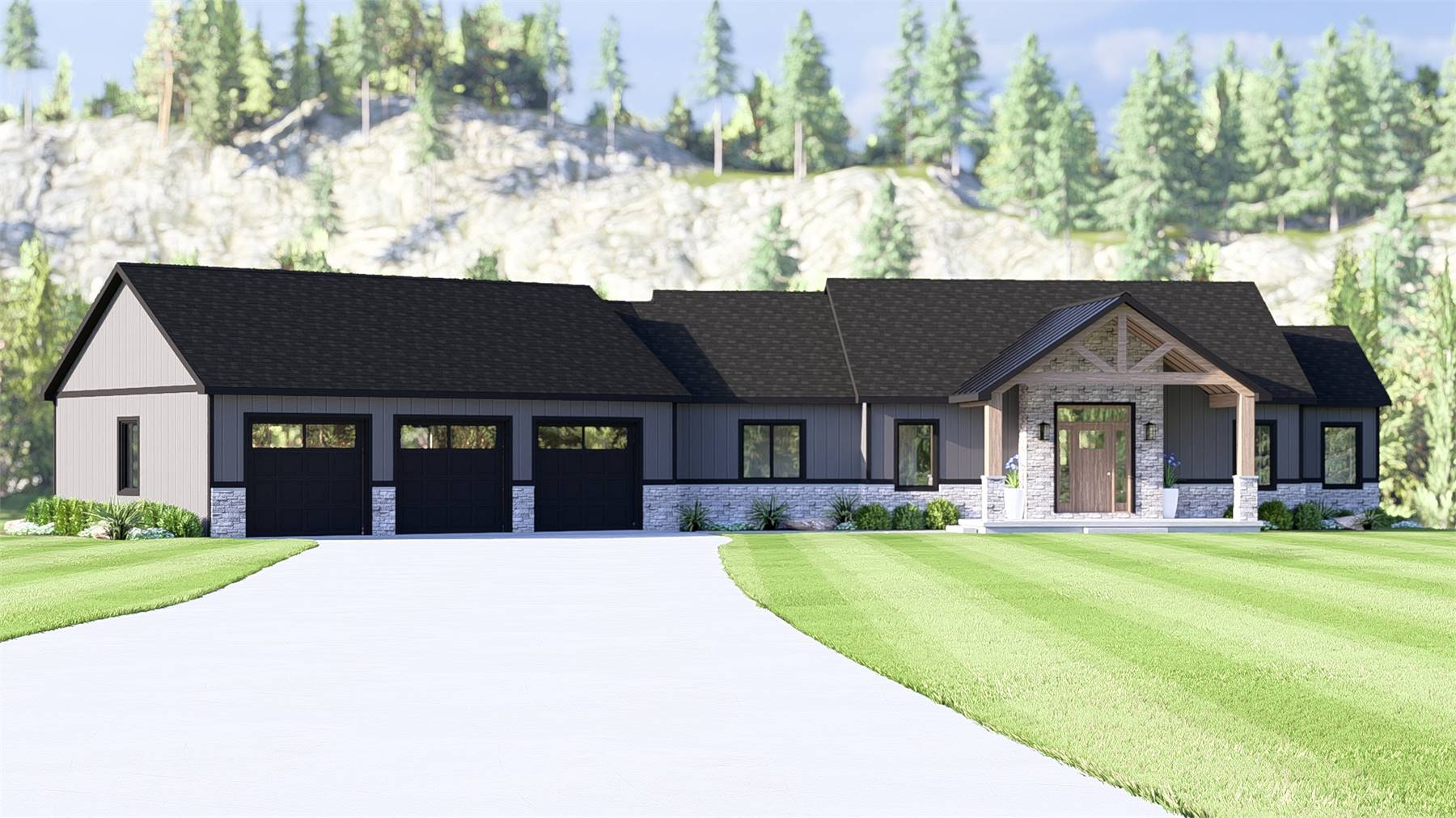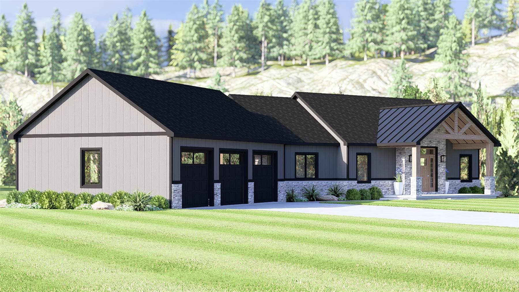 House Plan 11637 showcases a modern Craftsman aesthetic with strong architectural lines, natural materials, and a welcoming front porch. Inside, the open living and kitchen area features cathedral ceilings and expansive windows that bring in abundant natural light. The kitchen is designed for efficiency and entertaining, with a central island, walk-in pantry, and easy access to dining and outdoor spaces. The primary suite offers a private retreat with generous closet space and a well-appointed bathroom. A mudroom, main-level laundry, and three-car garage support everyday organization. The walkout basement adds valuable living space with additional bedrooms, a kitchenette, and flexible rooms for hobbies or guests. This modern Craftsman house plan delivers both style and function for today’s lifestyles.