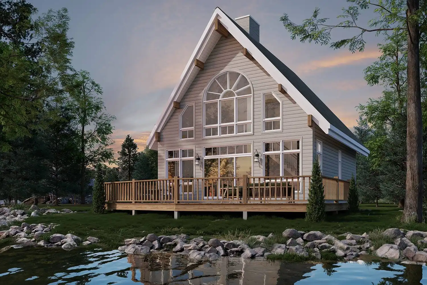 Plenty of windows and glass doors offer panoramic views for this two-story country cottage. Three bedrooms allow you to accommodate children or guests. Imagine serving fresh fish in the eat-in kitchen. Then move into the great room for dessert, warmed by the central fireplace. Finally, step out to the sizable deck for some fantastic stargazing.
