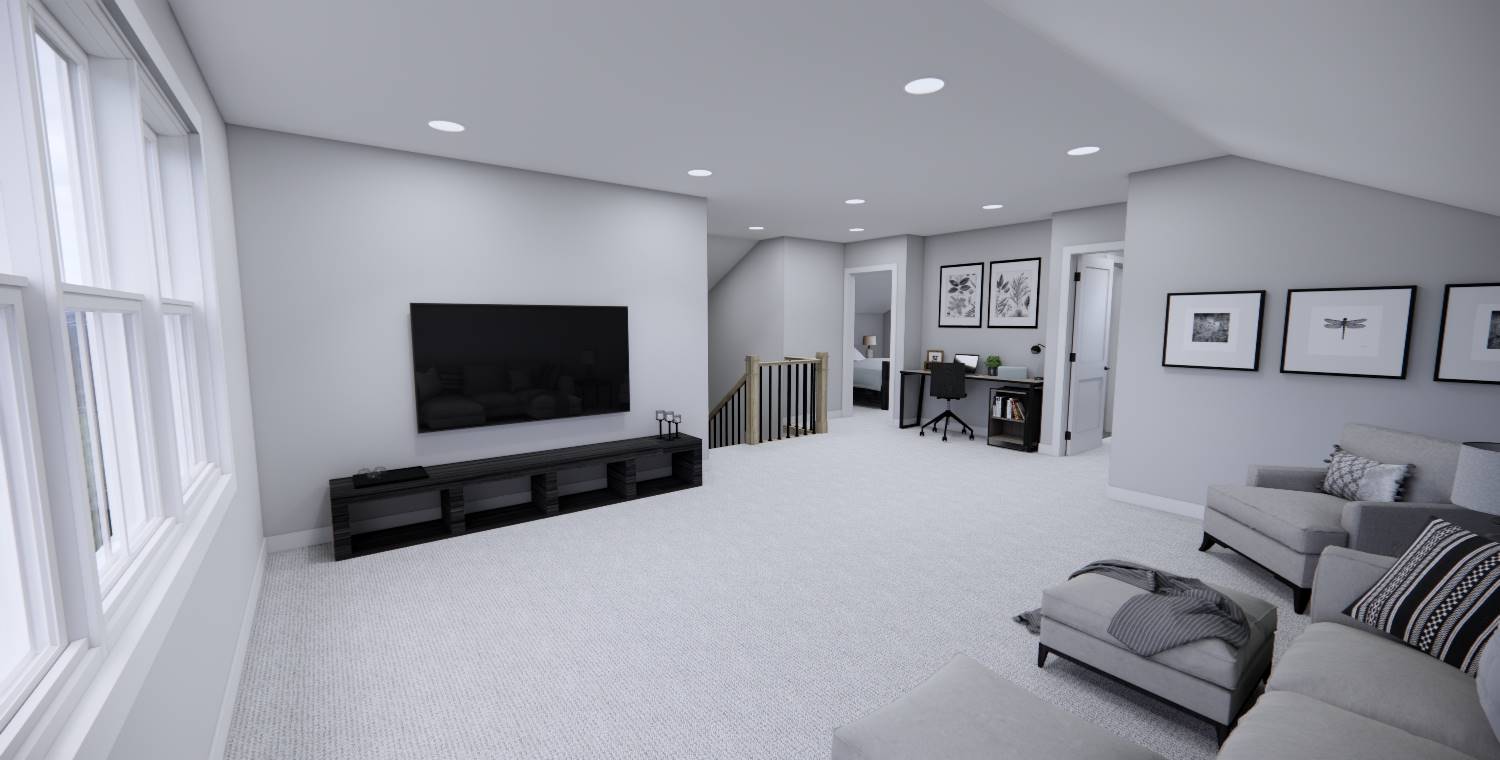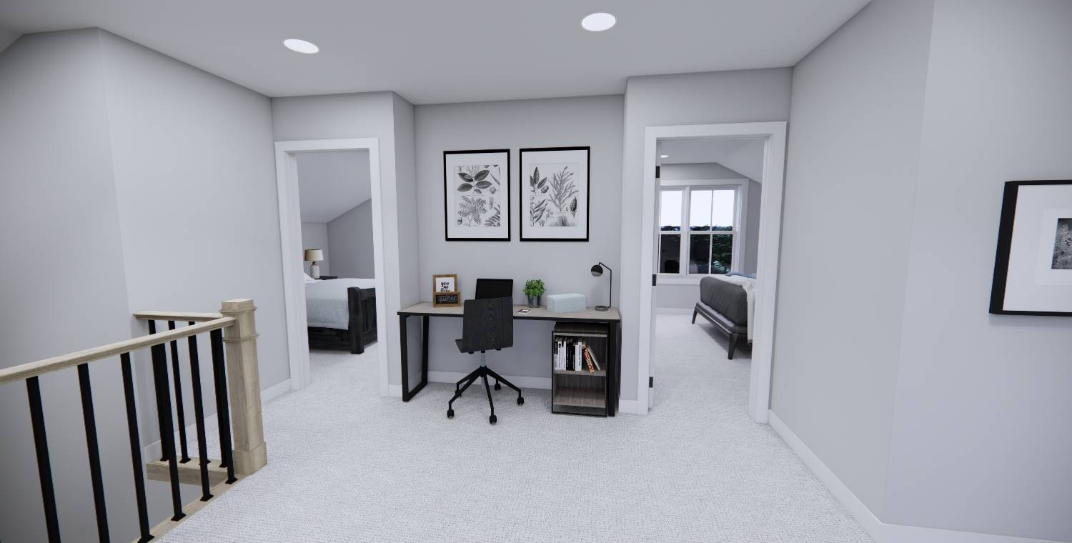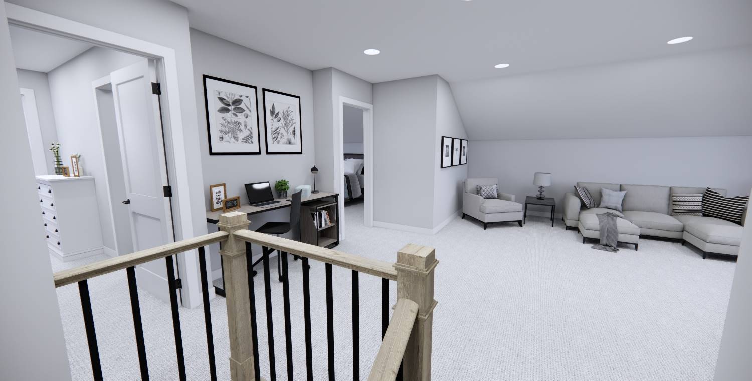 This inviting home offers 2,165 square feet of heated living space with 4 bedrooms and 3 baths designed for modern family living. The main level showcases an open arrangement where the great room flows seamlessly into the dining space and kitchen. Kitchen highlights include a central island, pantry storage, and a peninsula eating bar that makes entertaining easy. The primary suite on the main floor includes a walk-in closet and a double vanity bath for added comfort. Upstairs, a loft or balcony area provides flexible space for relaxing, hobbies, or shared activities. Everyday organization is supported by a mud room and first-floor laundry room. Covered porches at both the front and rear create inviting outdoor areas that enhance the home’s warm and welcoming feel.