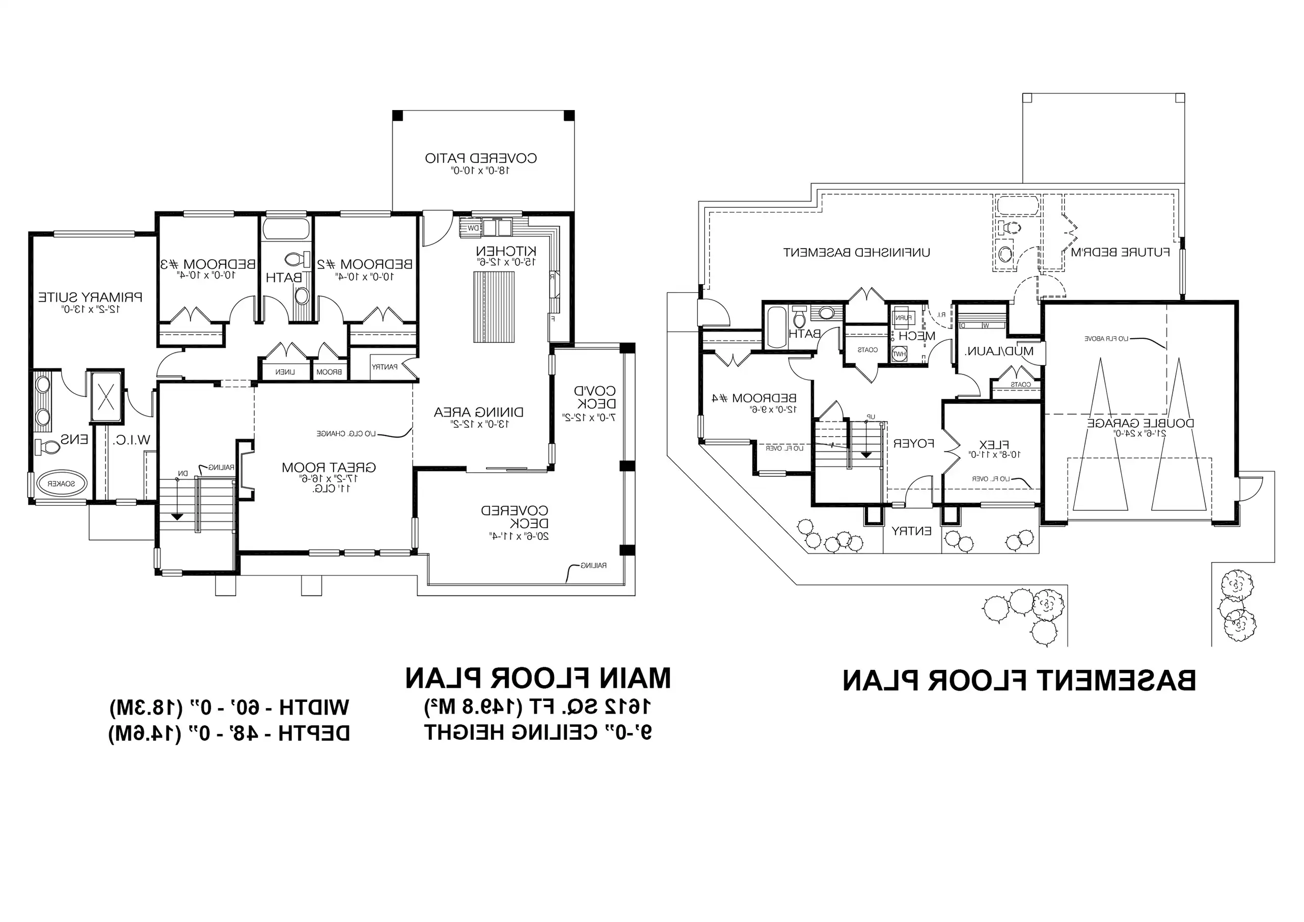 House Plan 11699 blends smart layout with expansive outdoor connections, delivering 3,108 square feet across a flexible, multi level design. The ground floor includes a two car garage, welcoming foyer, flex room, and a bedroom with a full bath, ideal for guests or extended family. A combined mudroom and laundry room streamlines daily routines, while the unfinished basement area allows for future expansion, including space for an additional bedroom. The main living level centers around a bright great room that opens to a wrap around covered deck, creating a seamless flow between indoors and out. Large windows surround the dining area to showcase the views, while the L shaped kitchen with a central island anchors the space. Two secondary bedrooms share a full bathroom, and the primary suite features its own ensuite and a quiet retreat feel, with a covered rear patio completing the design.