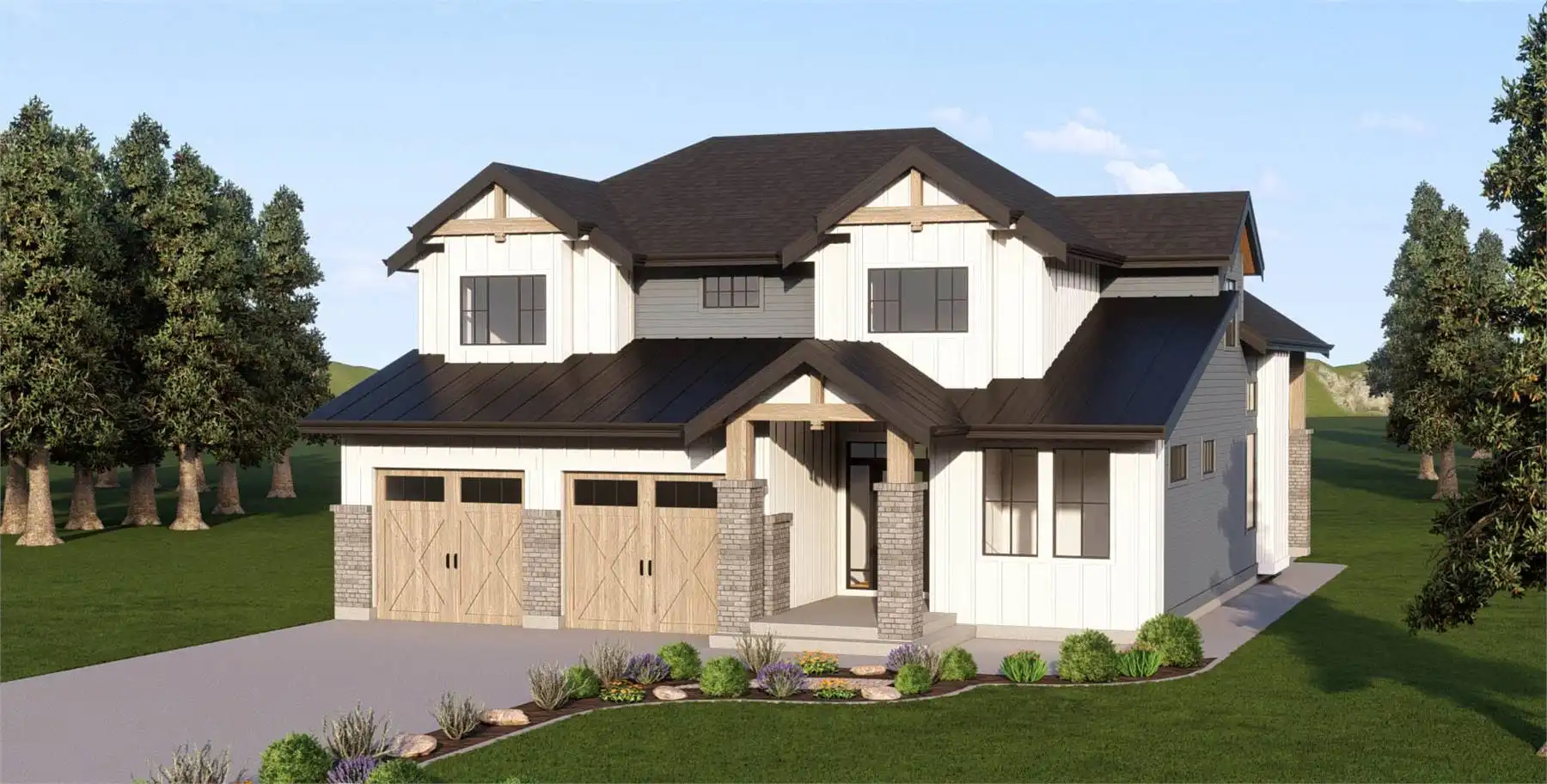 This welcoming home offers 2,302 square feet of comfortable and thoughtful living. A covered entry leads to a foyer and private office at the front of the home. The great room, kitchen, and dining area flow together naturally, centered around a fireplace and easy access to the covered patio. The kitchen features an L-shaped layout with a walk-in pantry and island seating. Upstairs, the primary suite provides a restful retreat with its ensuite and walk-in closet. Two secondary bedrooms share a split bathroom setup with dual sinks and a separate shower room. The ground level includes a double floor garage, giving you space for cars, storage, or workshop needs.