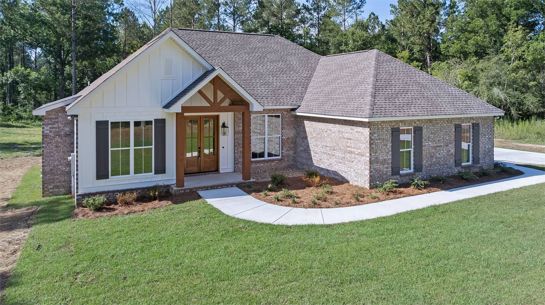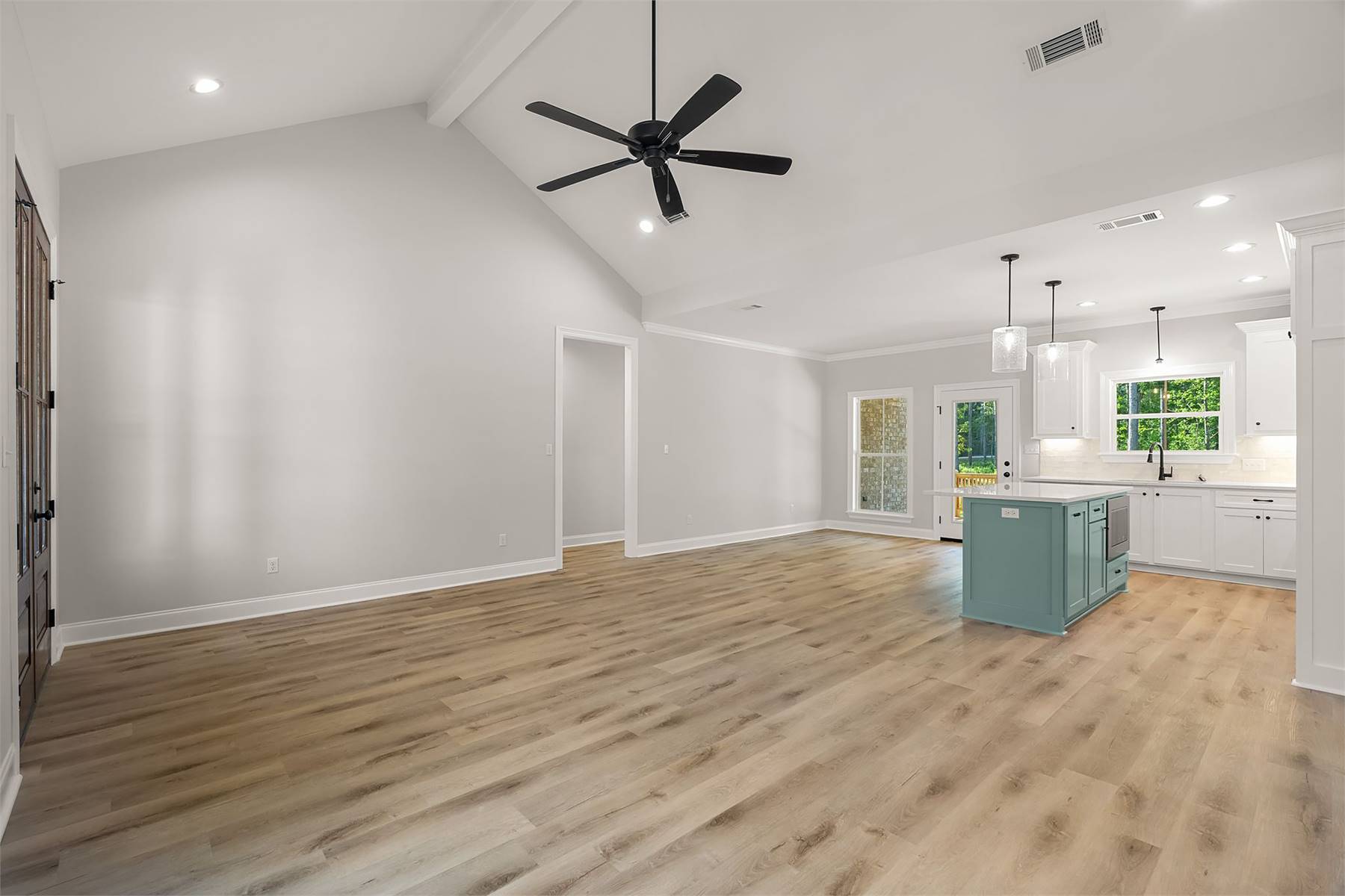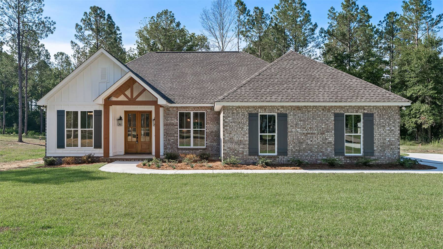 This charming 1,880 square feet home blends comfort with a layout that supports both gathering and privacy. The spacious vaulted great room forms the heart of the home, connecting naturally to the dining area and a well-appointed kitchen featuring a pantry, peninsula, and generous island. The primary bedroom sits on the main floor, offering a peaceful retreat enhanced by a double vanity, walk-in closet, and soothing bath design. Three secondary bedrooms are positioned separately to maintain a quiet, split-bedroom arrangement. A dedicated mud room keeps daily routines tidy, while the rear porch invites relaxed outdoor living. Thoughtful storage solutions add to the home's livability, making organization simple. This welcoming design brings together classic comfort and modern flow, creating a home that feels inviting from the moment you step inside.