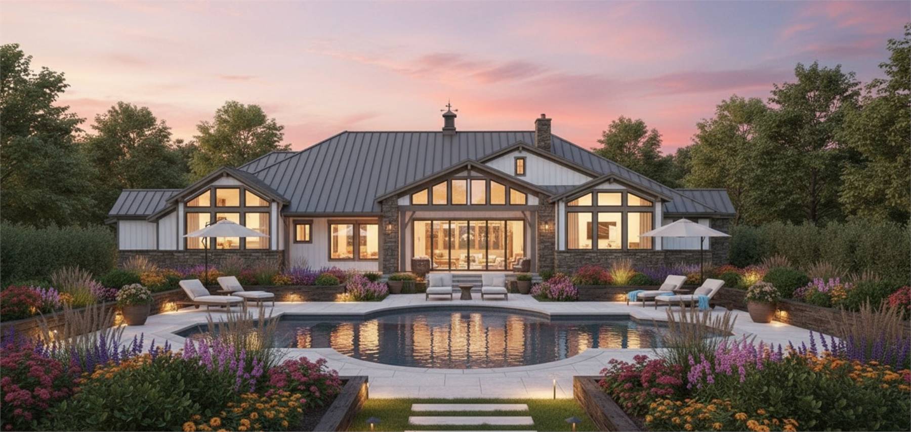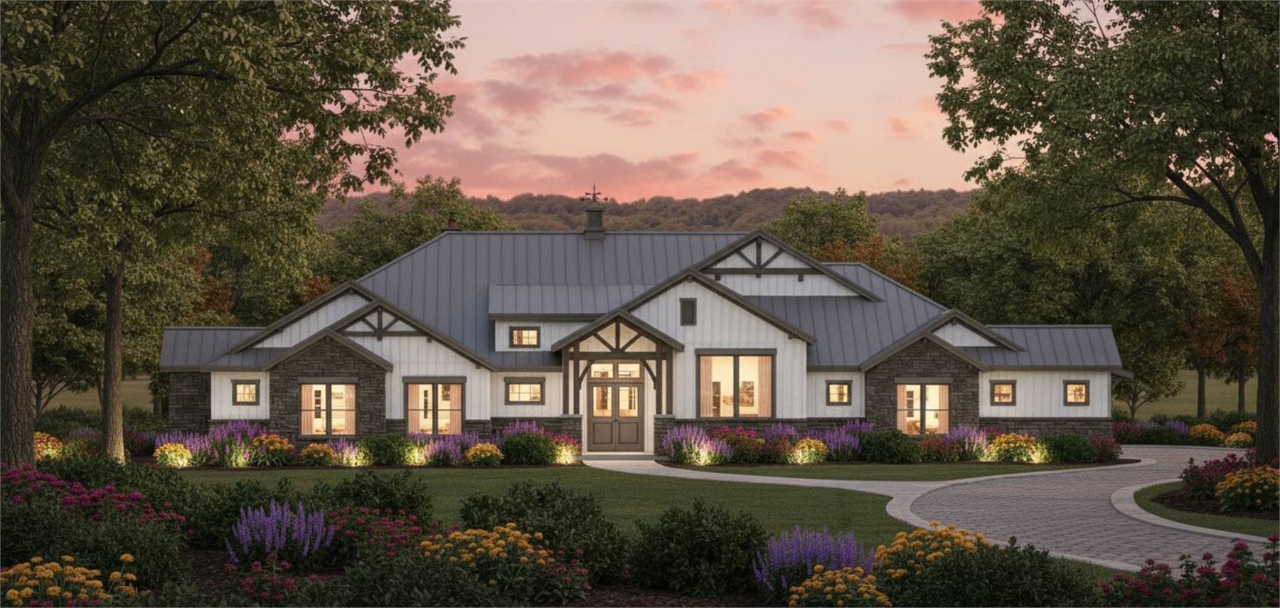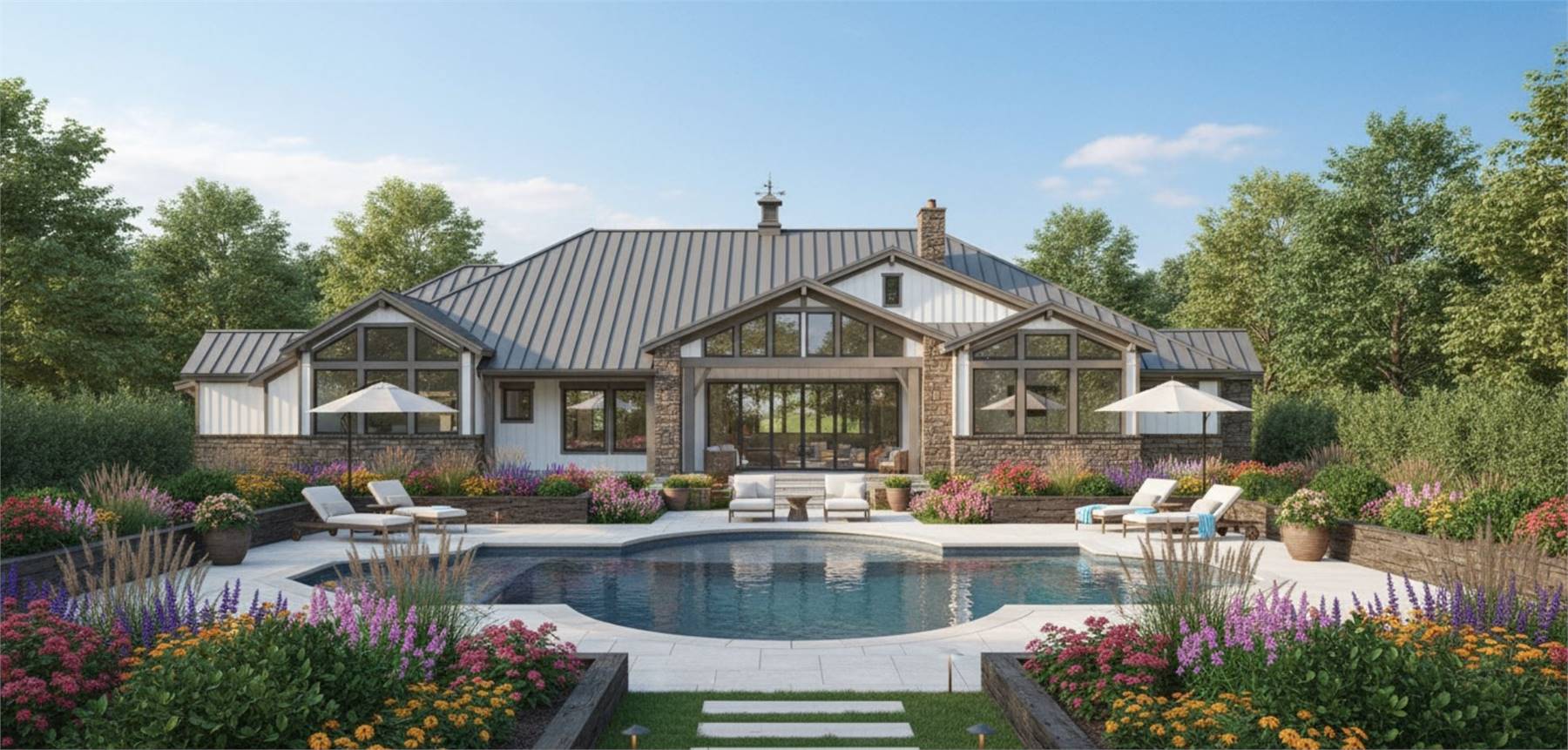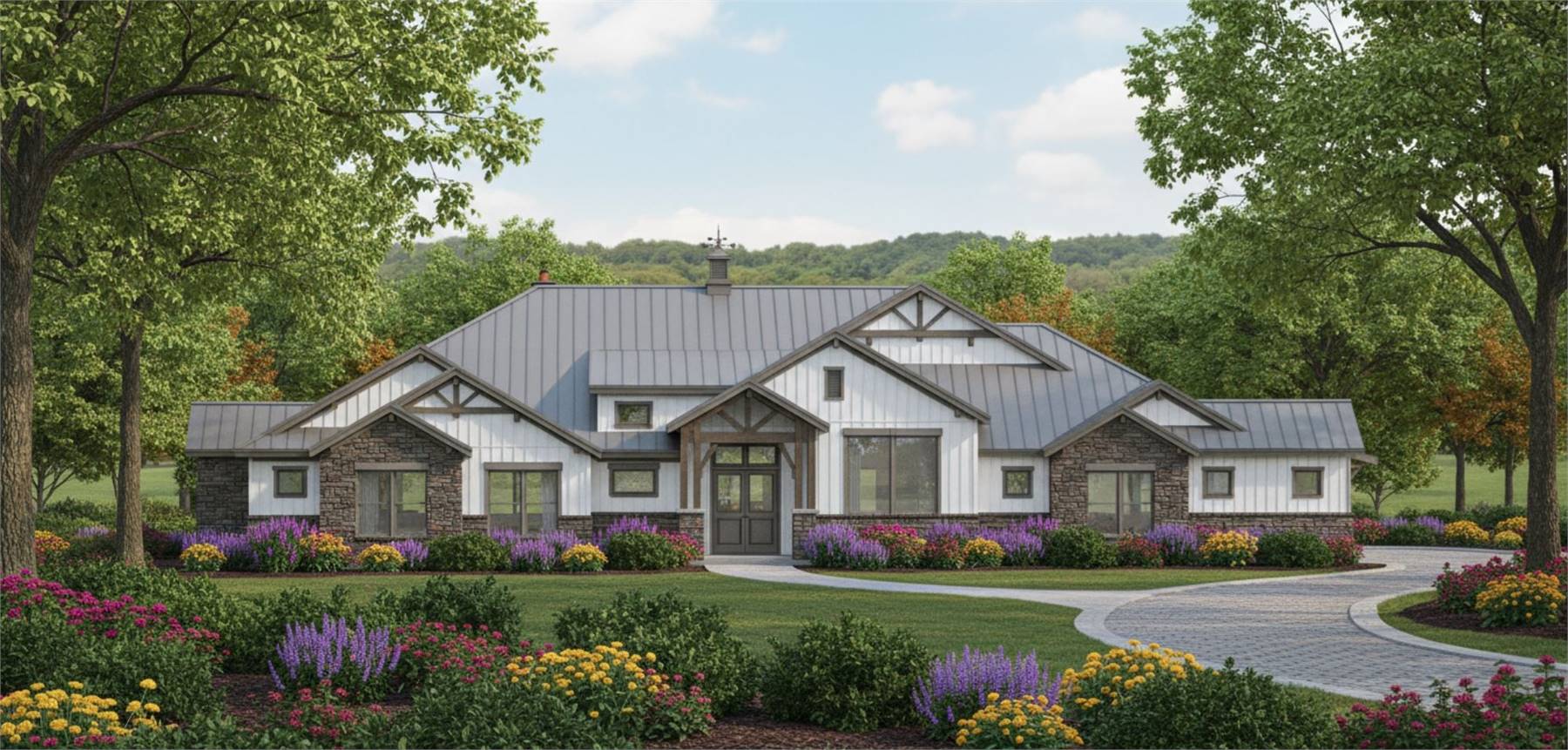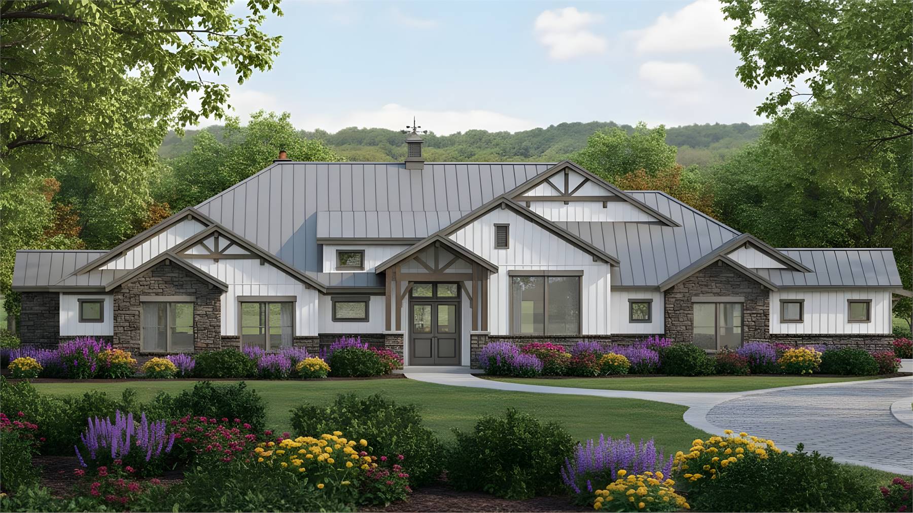 House Plan 11770 is here to impress anybody looking for a luxury one-story lake home! This sprawling design boasts 4,423 square feet with four bedrooms, two full bathrooms, and two half bathrooms in a thoughtful layout. The floor plan places all the bedrooms on one side, but they're split into separate hallways for privacy. The primary suite in back has an amazing five-piece bath, his and her walk-in closets, and access to the centrally located laundry room that comes out on the other side to the front hallway. Here, you'll find three bedrooms with a hall bath and a powder room. One of the bedrooms has built-in bunk beds to maximize sleeping quarters! The common areas in his home include a study off the foyer, game and media rooms in back, and the central great room with an island kitchen and foldaway patio doors that connect to the rear porch. If you want vaulted ceilings, this home won't disappoint--it has cathedral vaulted ceilings over the foyer, great room, rear porch, primary bedroom, and game room!