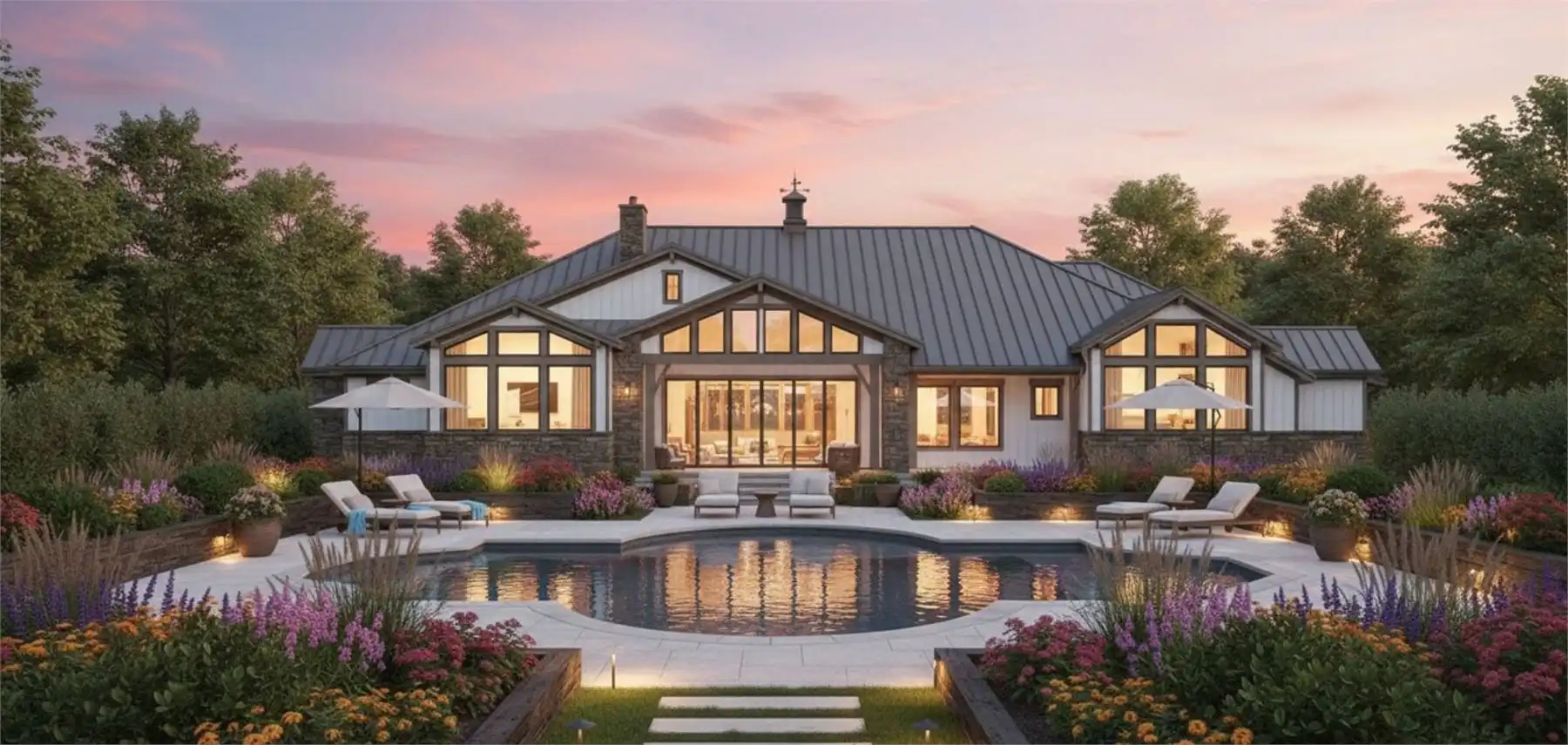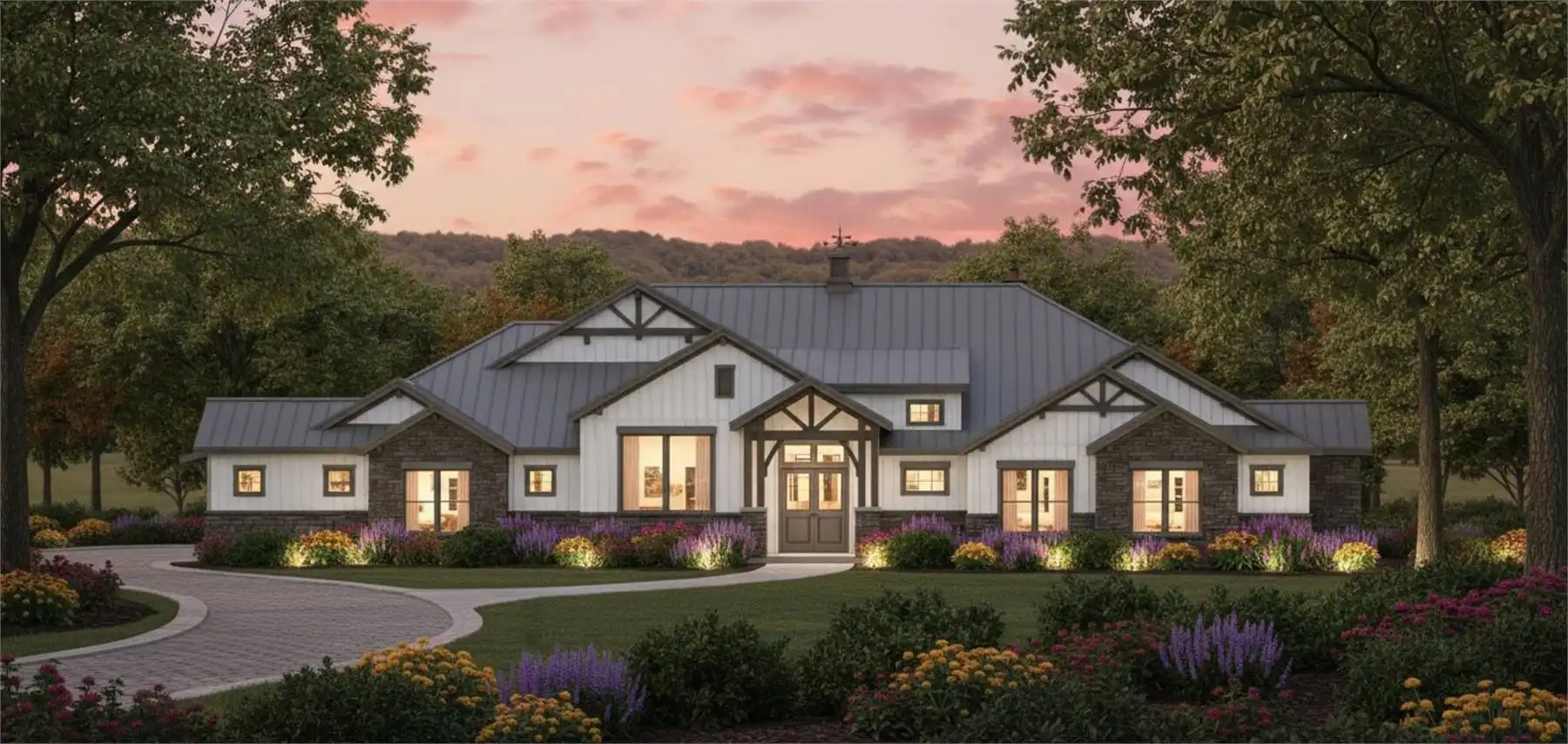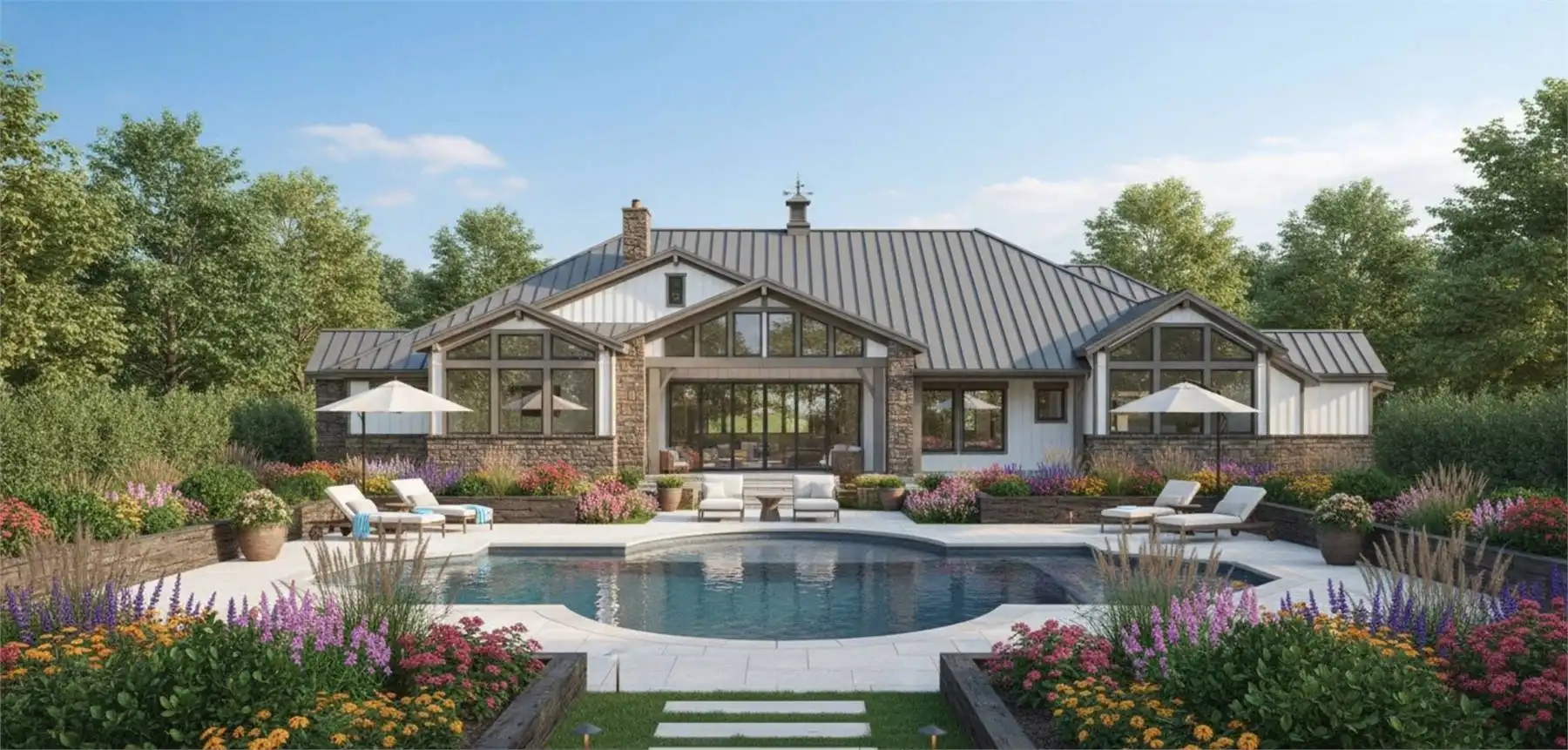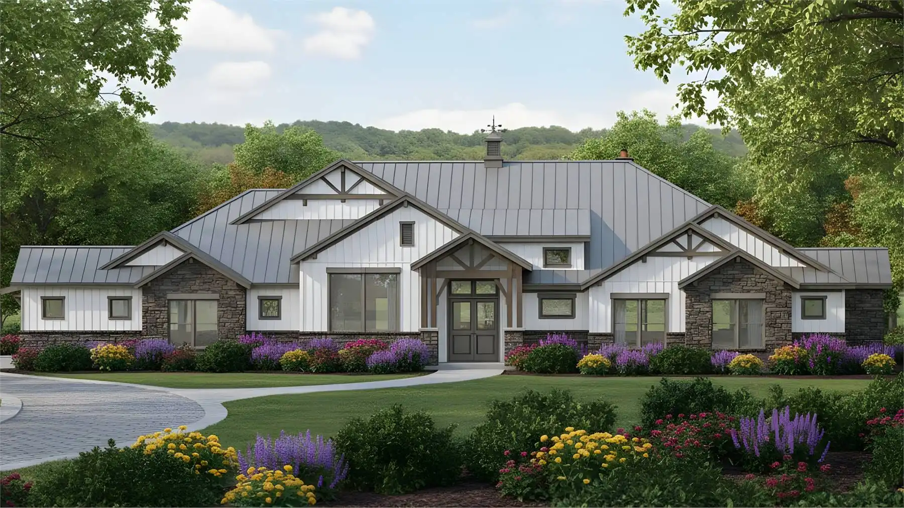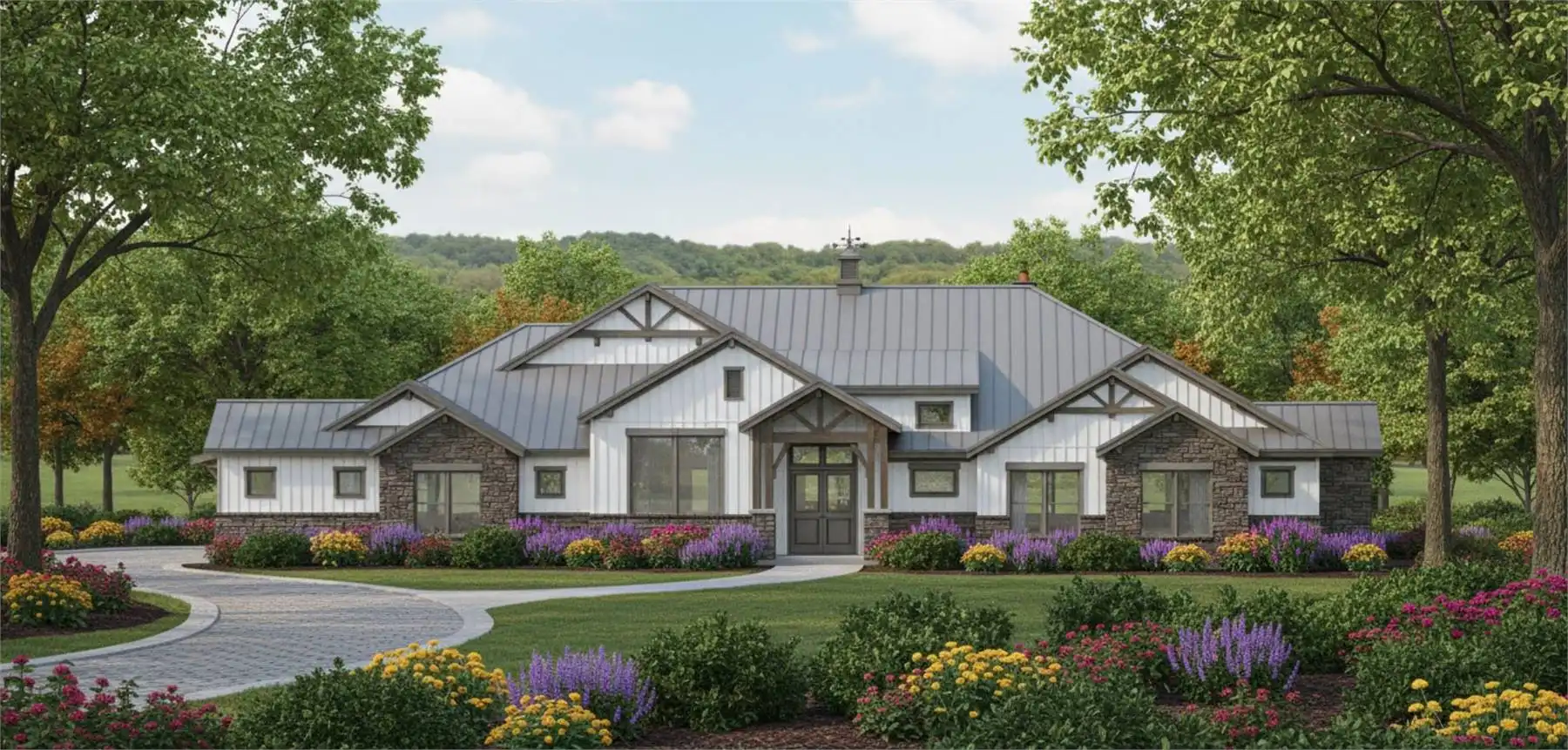 House Plan 11770 is here to impress anybody looking for a luxury one-story lake home! This sprawling design boasts 4,423 square feet with four bedrooms, two full bathrooms, and two half bathrooms in a thoughtful layout. The floor plan places all the bedrooms on one side, but they're split into separate hallways for privacy. The primary suite in back has an amazing five-piece bath, his and her walk-in closets, and access to the centrally located laundry room that comes out on the other side to the front hallway. Here, you'll find three bedrooms with a hall bath and a powder room. One of the bedrooms has built-in bunk beds to maximize sleeping quarters! The common areas in his home include a study off the foyer, game and media rooms in back, and the central great room with an island kitchen and foldaway patio doors that connect to the rear porch. If you want vaulted ceilings, this home won't disappoint--it has cathedral vaulted ceilings over the foyer, great room, rear porch, primary bedroom, and game room!